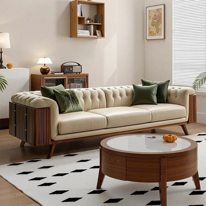 新中式スタイルの高級ブラックウォルナット無垢材ソファ、リビングにぴったり!軽やかで贅沢なデザインの3人掛け直置きソファ、エレガントなレザー仕上げで、どんなお部屋にもマッチします。