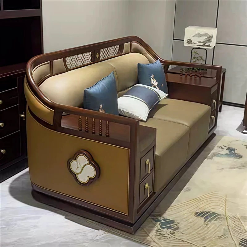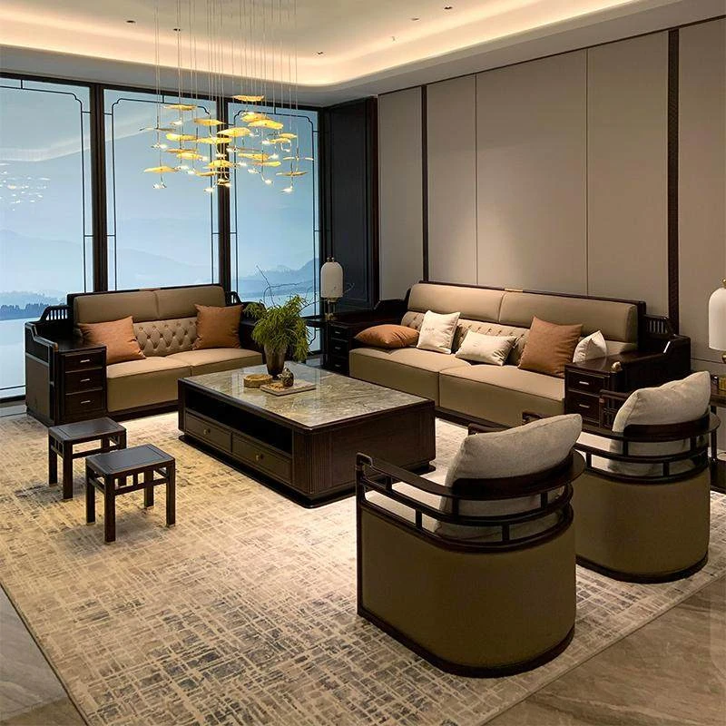 新しい中式デザインの本革ソファセット2025年モデル - 高級別荘向け、ウッディブラックの美しい仕上げ、3~4人用リビングルーム家具。洗練されたスタイルで、贅沢な空間を演出します!