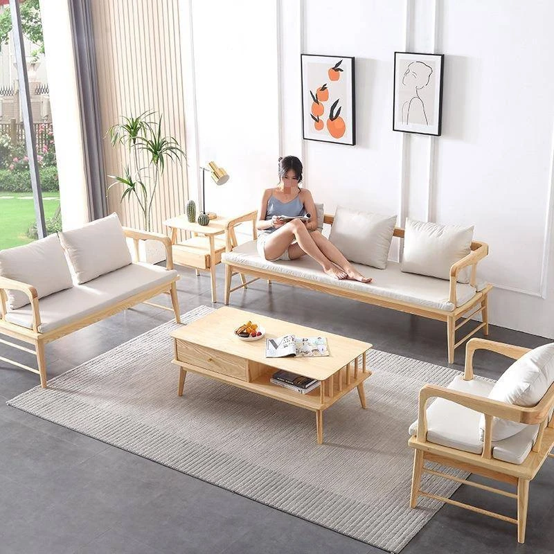 北欧スタイルの無垢材ソファセット - シンプルでモダンな小型リビングにぴったり!3人掛けのナチュラルウッド風ファブリックソファ、経済的で快適な居心地を提供します。おしゃれな空間を演出しましょう!