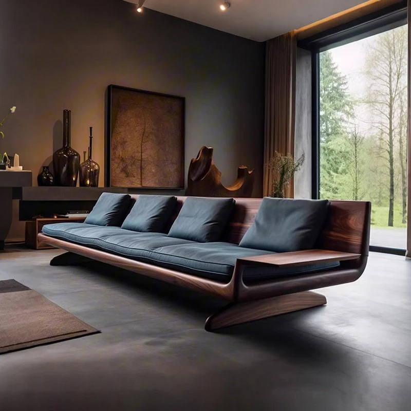 新中式デザインのブラックウォルナット直置きソファ - 2025年新作、禅の雰囲気を漂わせるオシャレな別荘、ホテル、民宿、オフィスに最適なアイテム!おしゃれで心安らぐ空間を演出します。