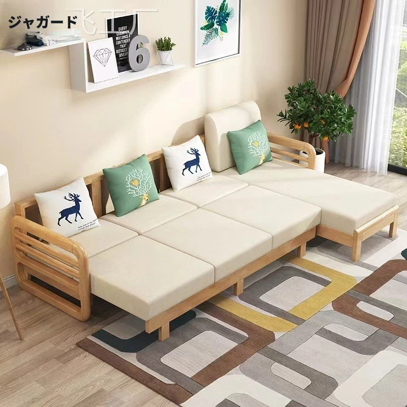 北欧風リビングソファー 木と布のコンビネーション 日本式ダブルデイベッド 小型家具 本格的な無垢材製 収納付きで省スペース!
