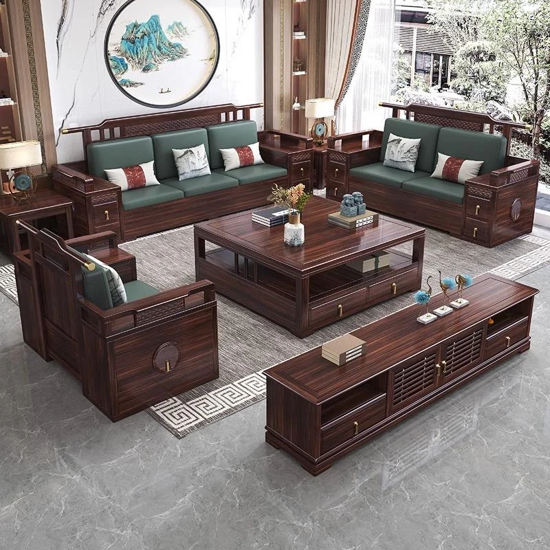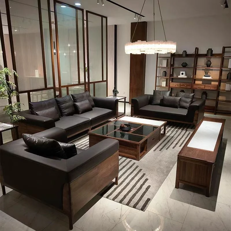 新中式ウッドブラックソファセット - モダンでシンプルな高級感あふれるリビングルームにぴったりの贅沢なデザイン、上質な素材で心地よいひとときをお届けします。