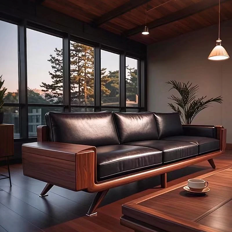 2025年新作!皮革製ソファー - 高級感あふれる無垢材使用の新中式デザイン。リビングやオフィスの休憩スペースに最適なクルミの木製ソファー。自宅や別荘にぴったりのスタイリッシュなアイテム!