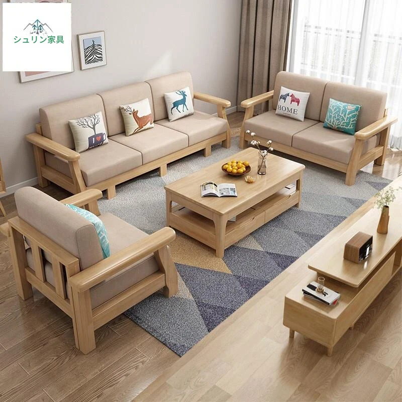 北欧スタイルの無垢材ソファセット|シンプルでモダンなデザイン|小さな部屋にもぴったり|リビングに最適な布製・ナチュラルカラーのソファ家具で、快適なひとときをお楽しみください!