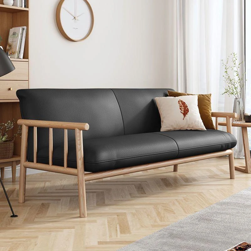 北欧スタイルの本革製ソファ - 小型リビングに最適!全てが天然木製のオーク材を使用したシンプルでモダンなダブル3人掛けソファ。省スペースでありながら、心地よい座り心地を提供します。