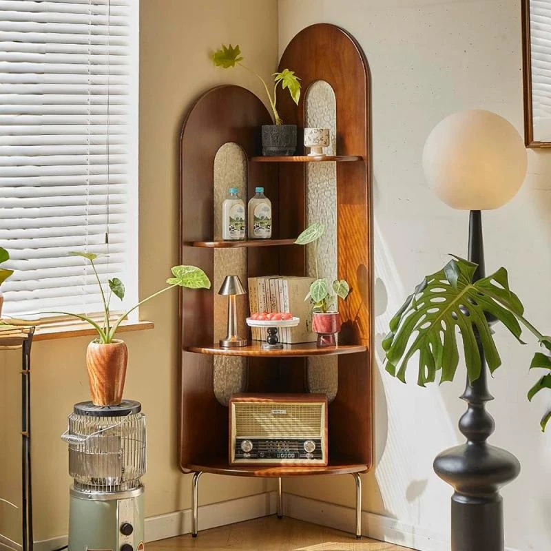 フレンチビンテージ風のラタン編みリビング実木ソファ&コーナー書棚パーティション、三方向収納ラックでおしゃれに!お部屋を美しく彩る収納スペースを実現!