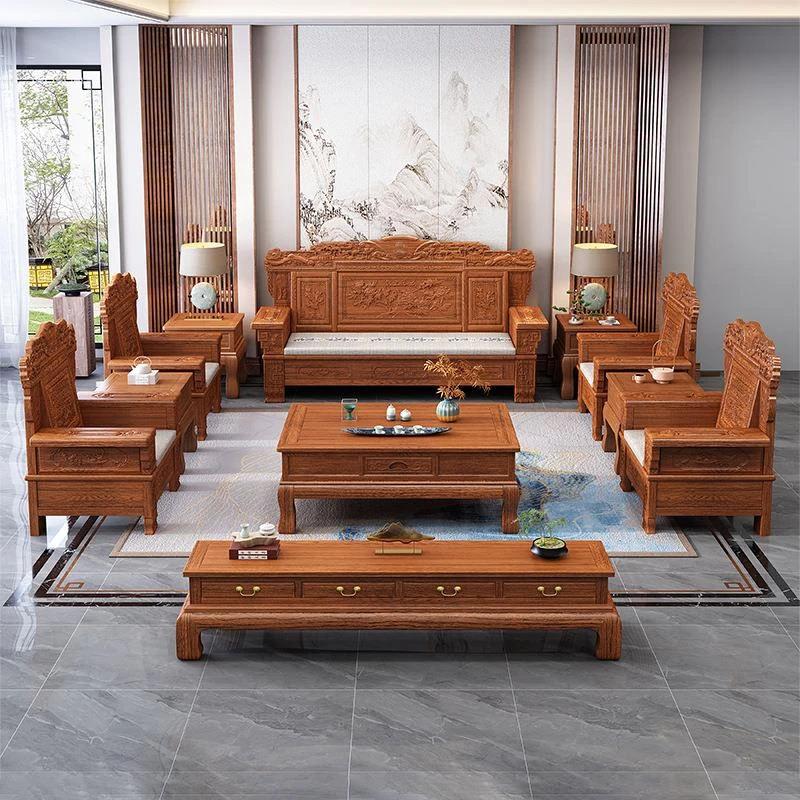 中式花梨木の本格的な彫刻ソファセット - 冬夏両用の豪華な明清スタイル、広々とした別荘にぴったりなクラシック家具!