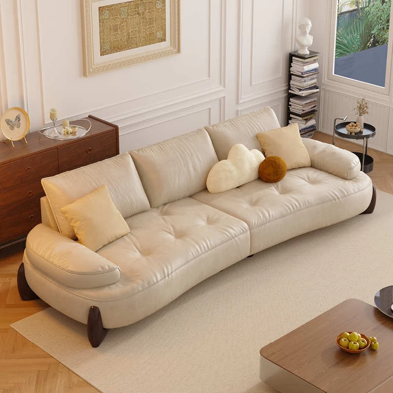 北欧ミニマリズムデザインのアトールソファ - 曲線的なリビングルーム用布製ソファで、リラックスした休息空間を演出!快適さとスタイルを兼ね備えた、おしゃれな皮革風デザイン。