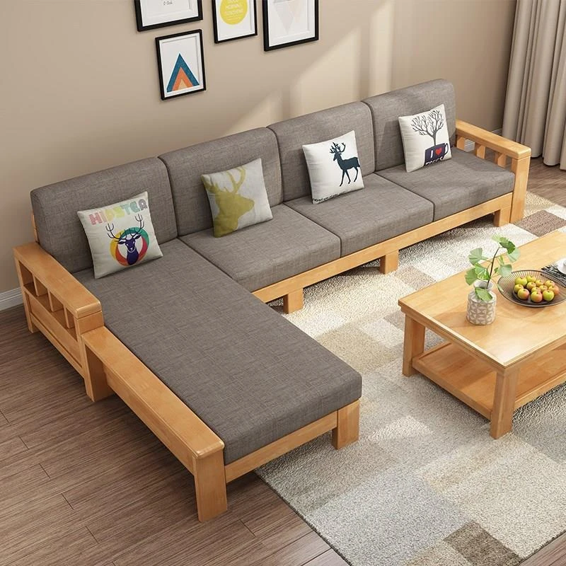 新中式デザインの無垢材ソファセット - シンプルでコンパクトなゴムの木製リビング家具、贅沢なコーナー型ファブリックソファで快適なくつろぎ空間を演出!