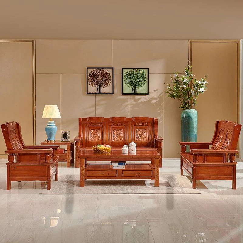 全実木製ソファセット 小型住宅向け 冬夏両用 新中式アンティーク風ソファ リビング・オフィスに最適 経済的でスタイリッシュなデザイン