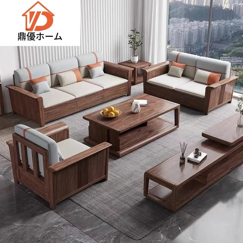 現代的シンプルなウォールナット材の小型新中式リビングルーム用収納付き木製ソファセット。冬夏両用で、スタイリッシュで機能的な空間を演出します!