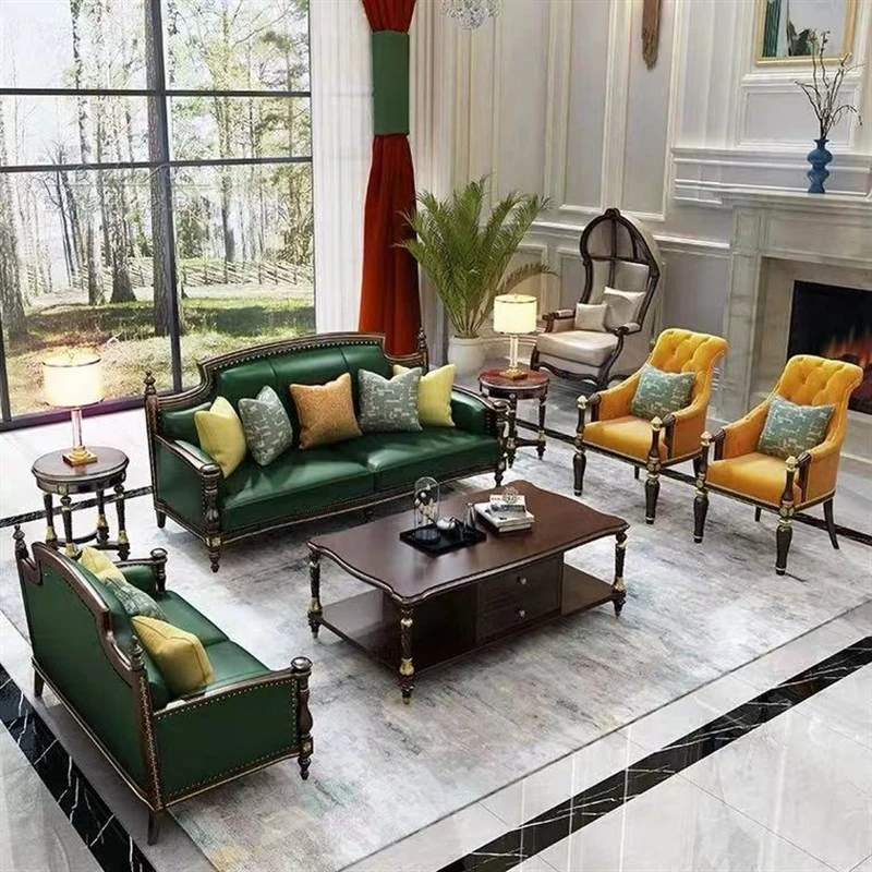 Luxurious Black Walnut Sofa Set for European Villas - Solid Wood, Spacious Combination for Large Living Rooms with Genuine Leather Upholstery