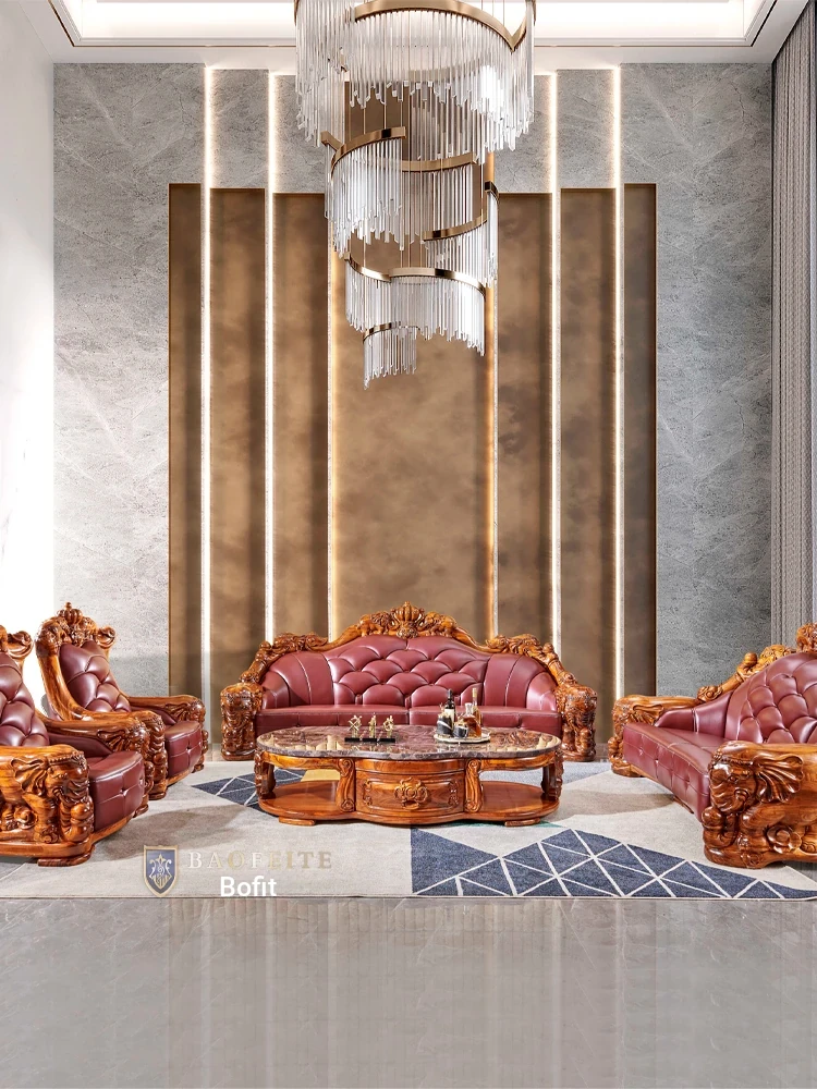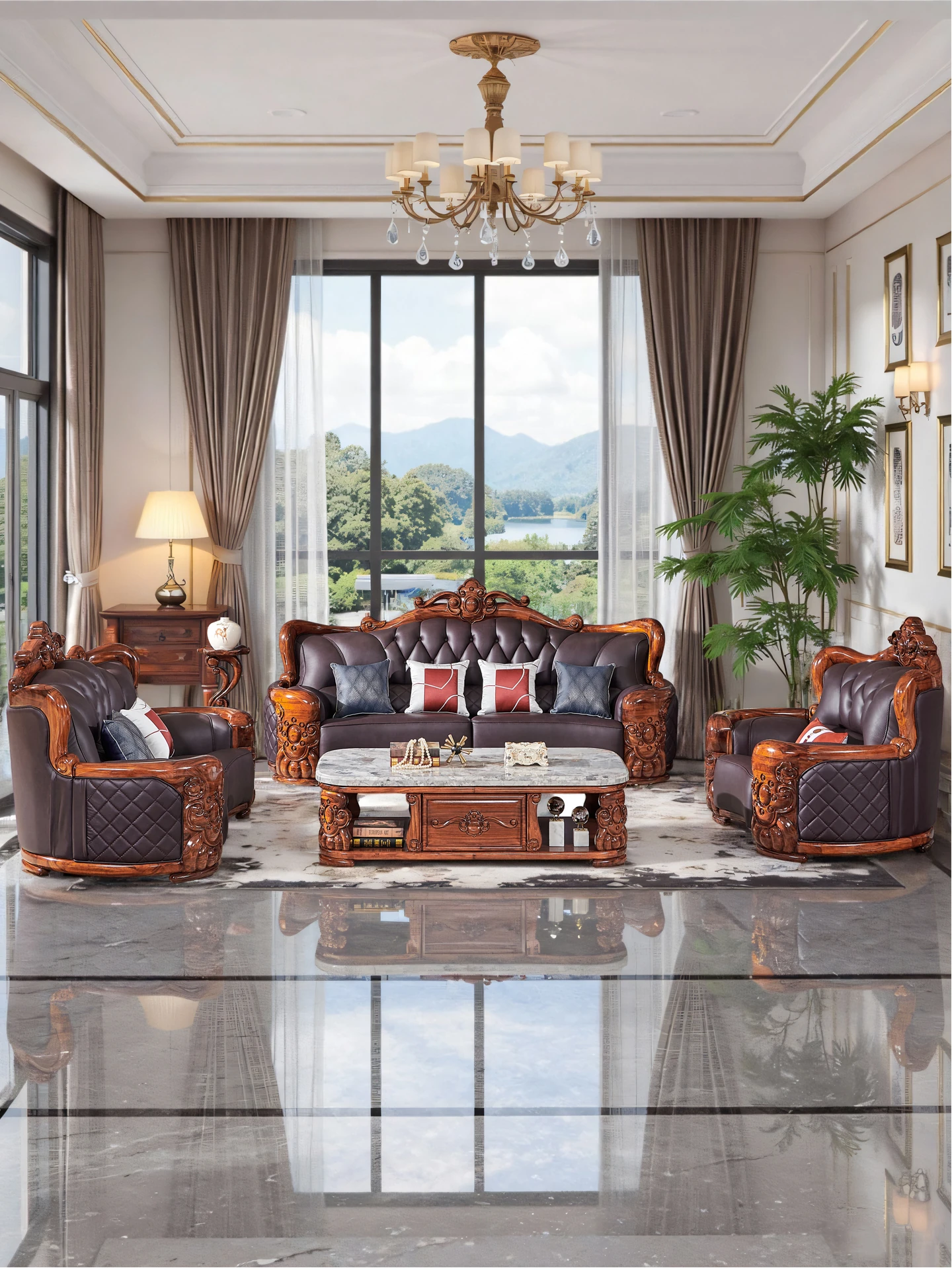 Bofit European Style Black Walnut Leather Sofa Set - Elegant Elephant Design for Spacious Homes, Luxurious Solid Wood Furniture for Villas