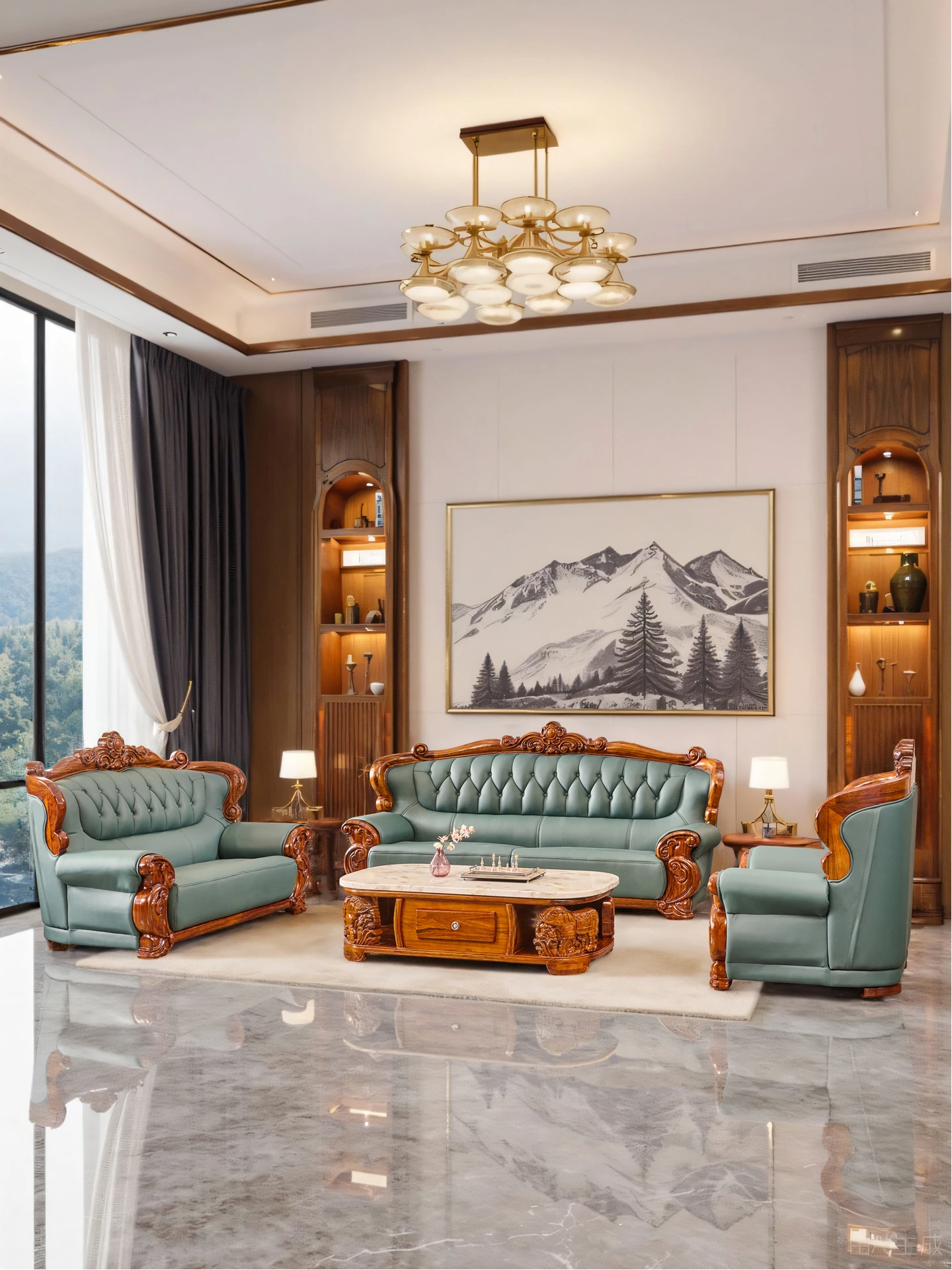 European Style Solid Wood Carved Genuine Leather Sofa Set for Villas and Spacious Apartments - New Chinese Style Living Room Sofa, Perfect for Elegant Interiors