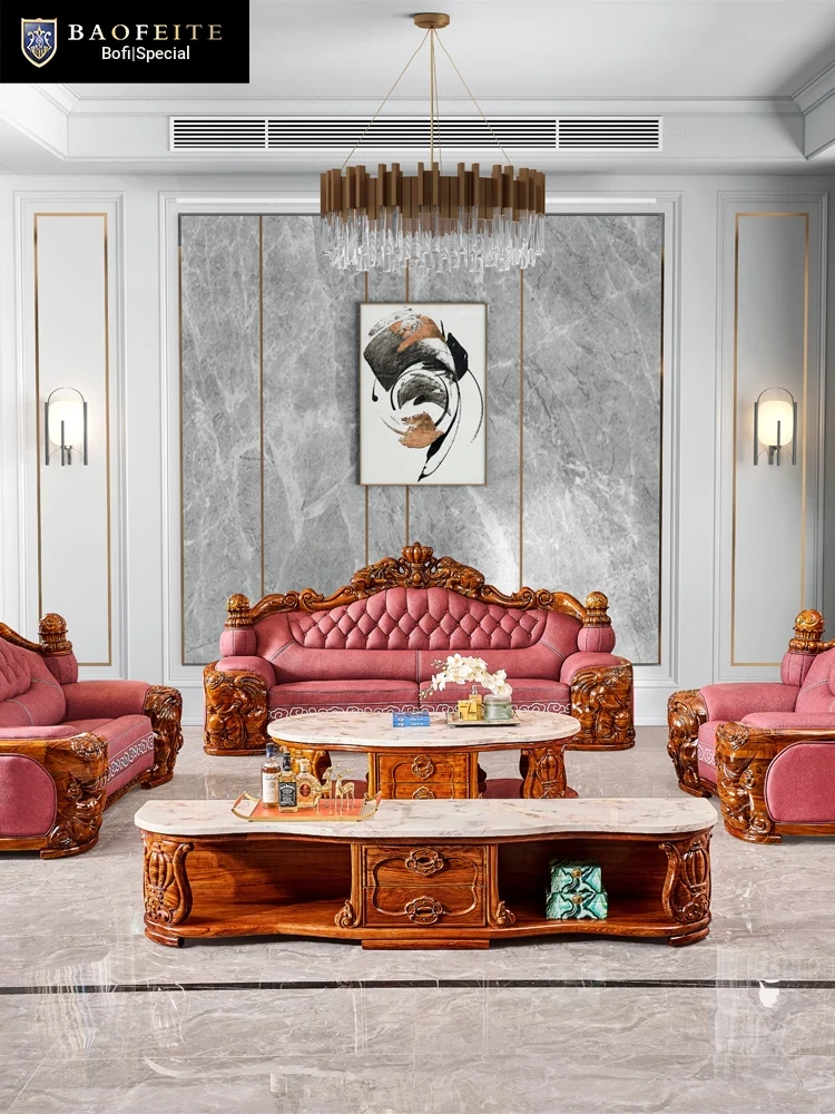 American Solid Wood Carved Sofa Set - Luxurious Light Luxury Living Room Combination with Coffee Table and TV Cabinet for Spacious Villas and Upscale Homes