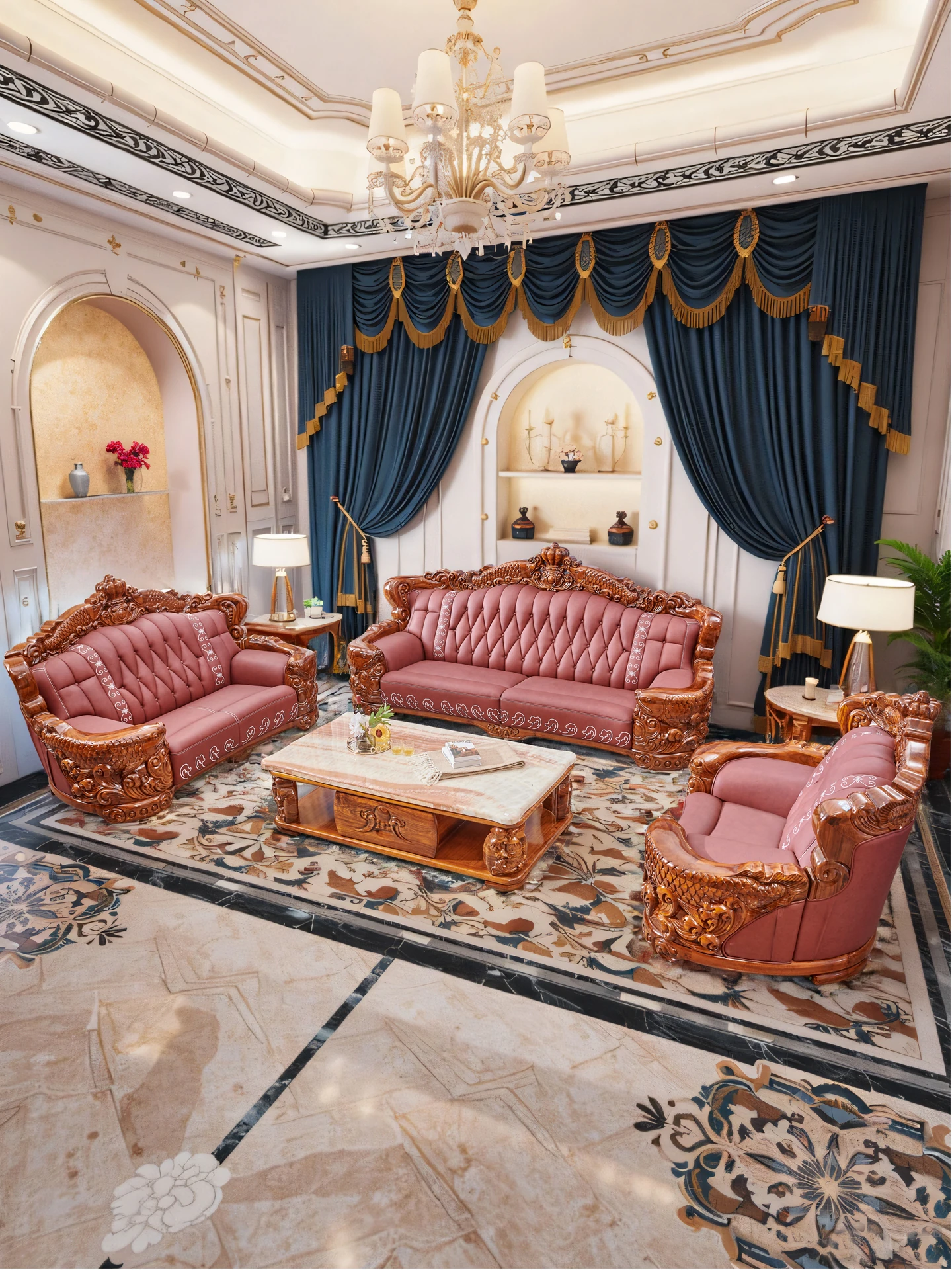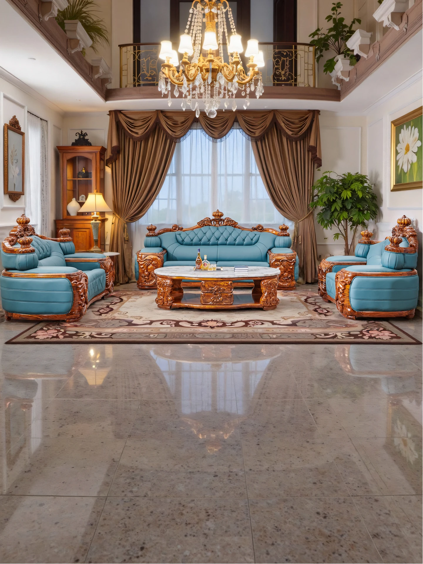 Elegant European Solid Wood Hand-Carved Vintage Fabric Sofa with French Palace Luxury Design, complemented by a Marble Coffee Table - Perfect for Villa Furnishings.