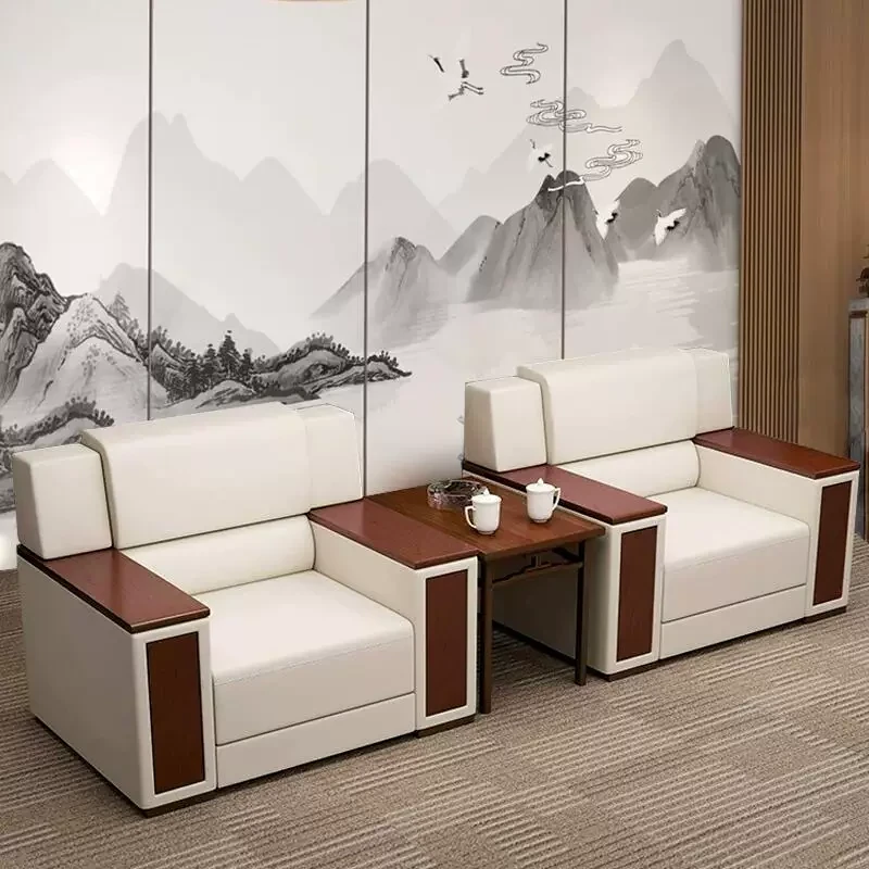 Modern Minimalist New Chinese Style Conference Reception Sofa - Elegant Business Leather Sofa with Walnut Wood for Meetings and Discussions.