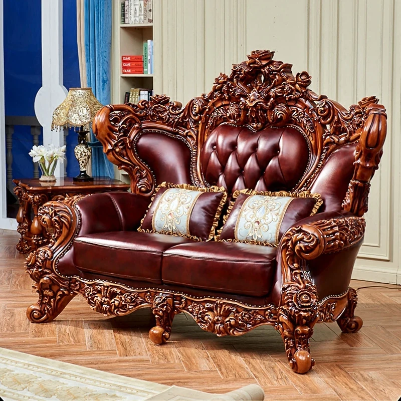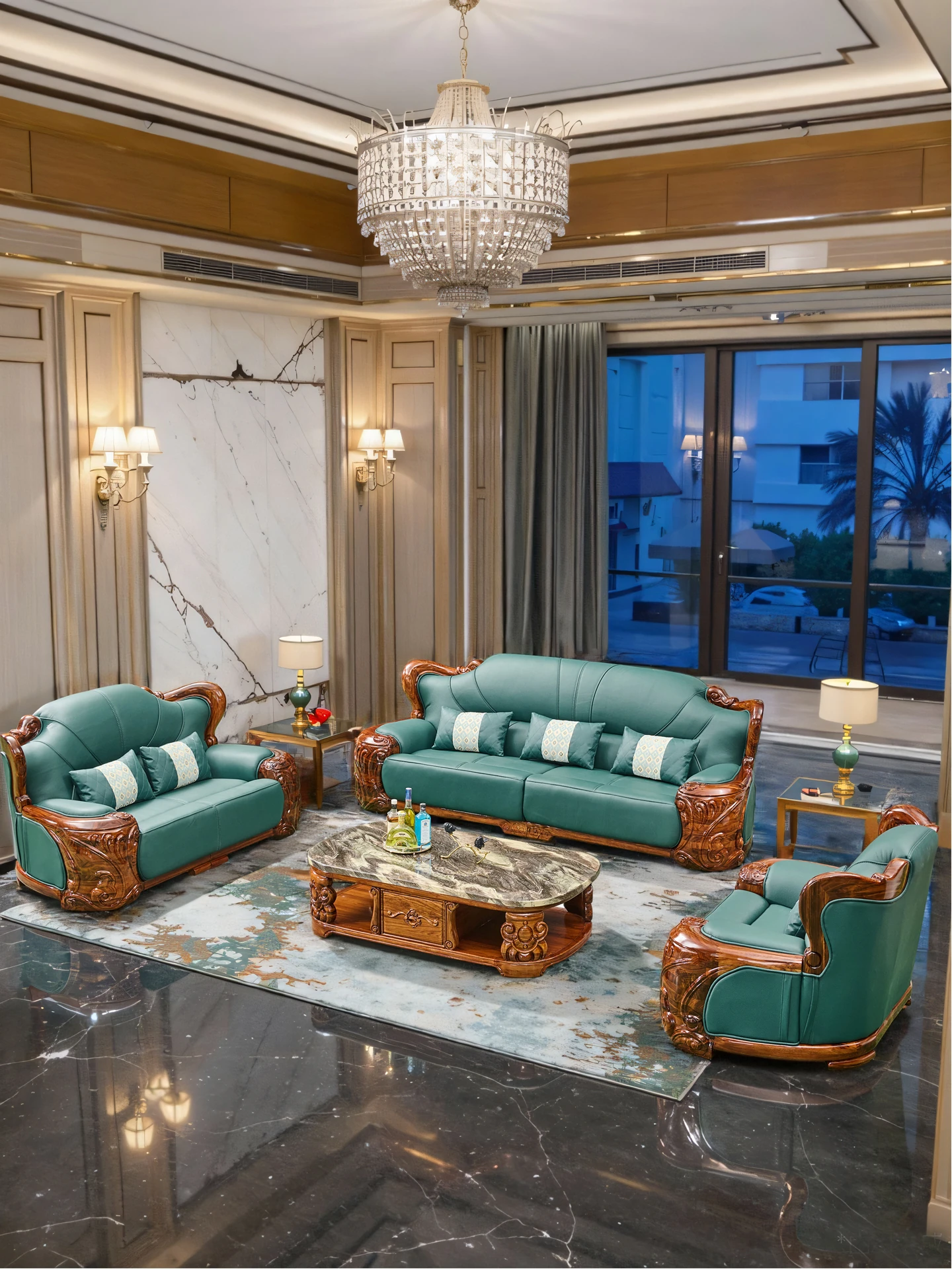 European Style Solid Wood Carved Genuine Leather Sofa Set for Villas and Spacious Apartments - New Chinese Style Living Room Furniture