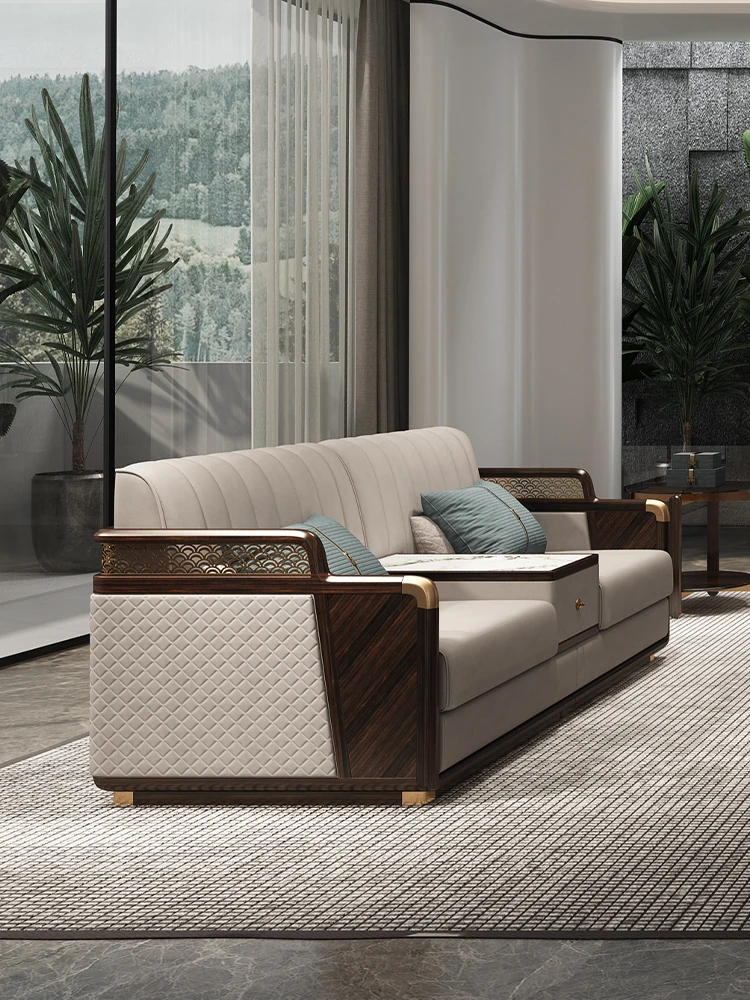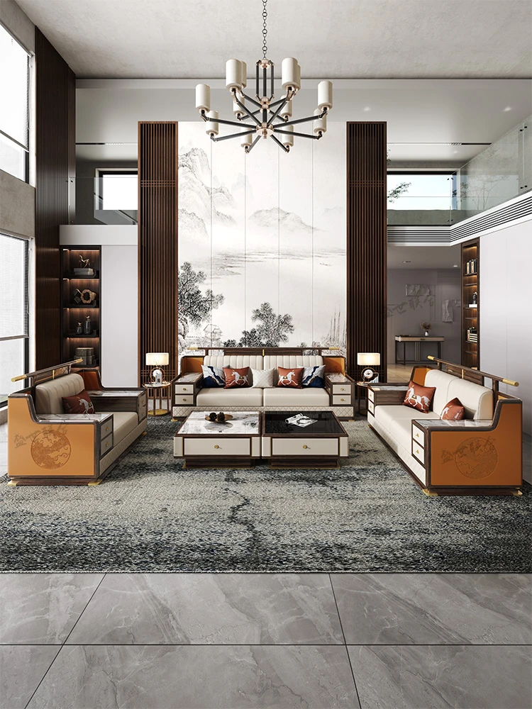 Shengshi United New Chinese Style Solid Wood Sofa - Modern Luxury Genuine Leather Sofa for Spacious Villas and Living Rooms