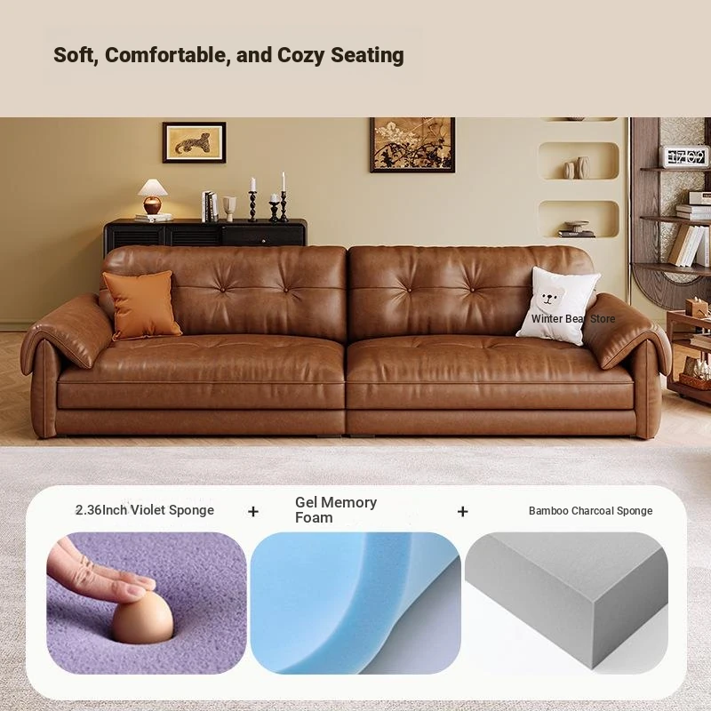 Tongyu Vintage French Style Oil Wax Leather Elephant Ear Sofa - Retro Brown Four-Seater Upholstered Living Room Couch