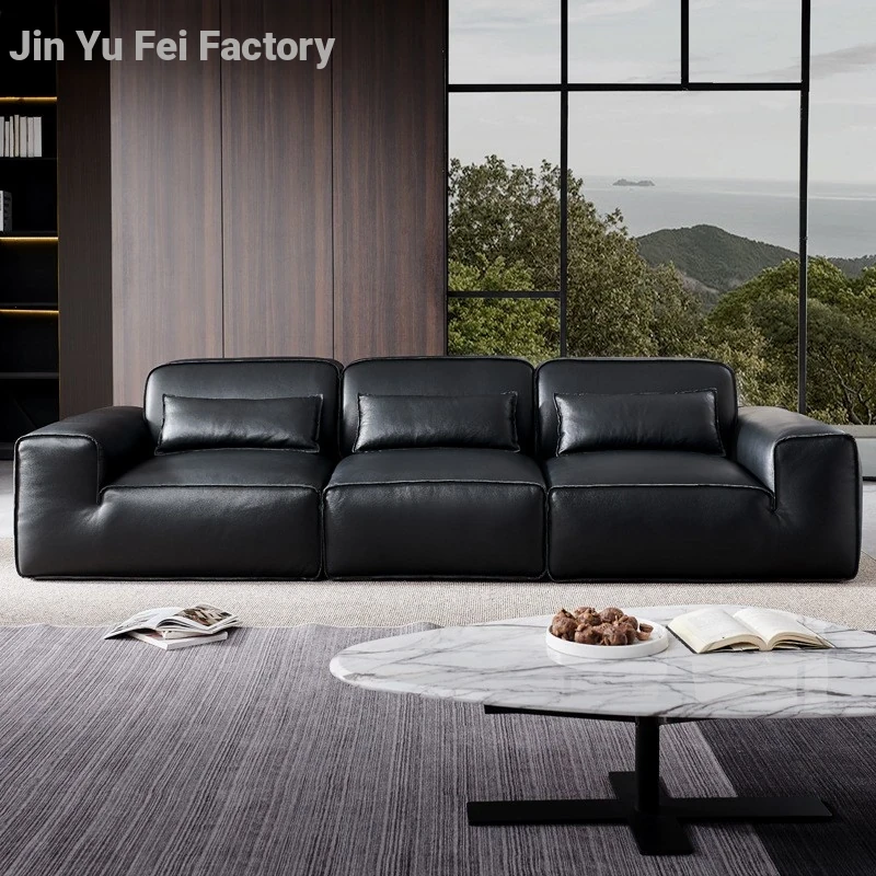 Minimalist Italian Luxury Genuine Leather Sofa Set with Elephant Ear Design - Perfect for Small Living Rooms, Features Stylish Block Shape and Premium Leather Upholstery.