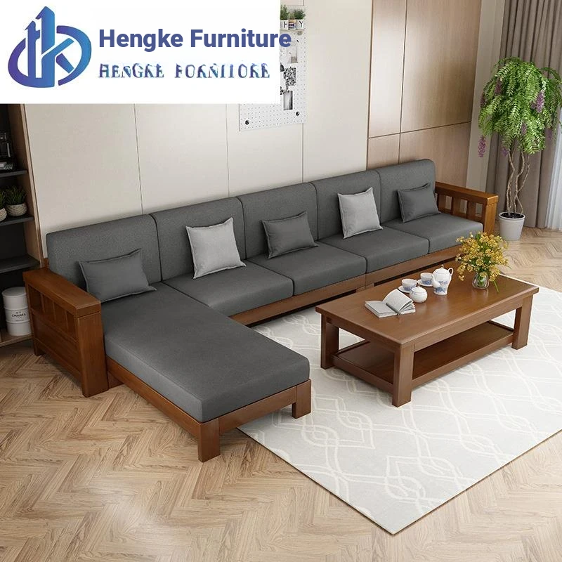Elegant Solid Wood Sofa Set - New Chinese Style Small L-Shaped Sofa with Luxurious Fabric and Corner Chaise for Living Room Furniture