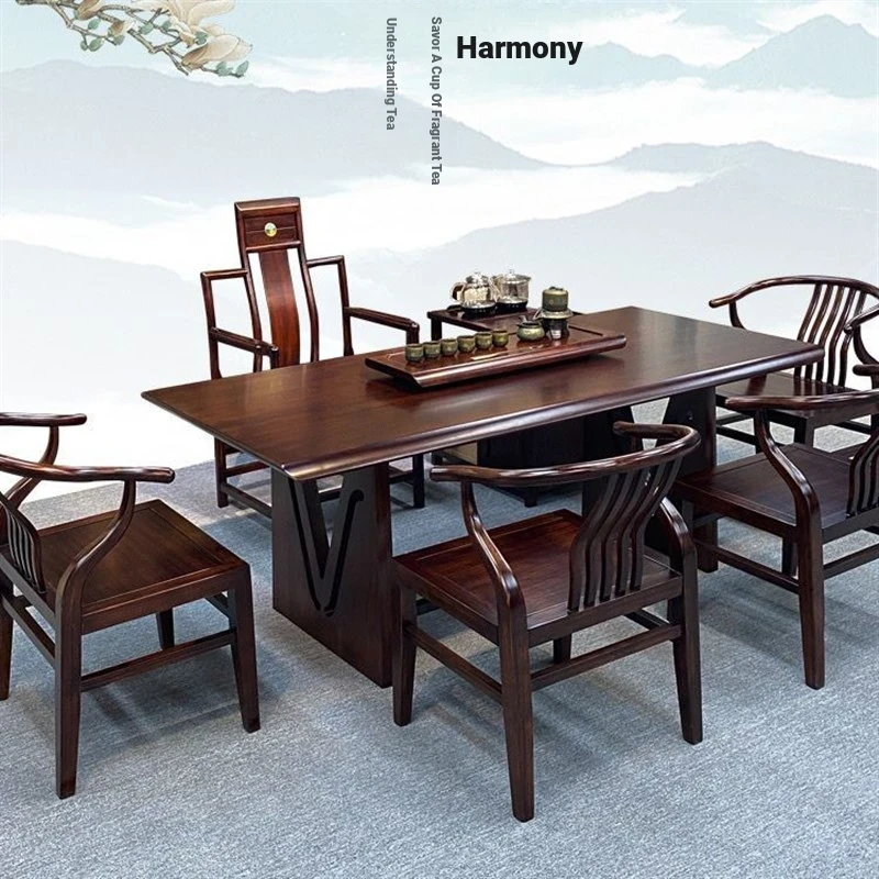 Solid Black Walnut Tea Table and Chair Set - New Chinese Zen Style Wooden Office and Home Living Room Tea Station with Tea Accessories