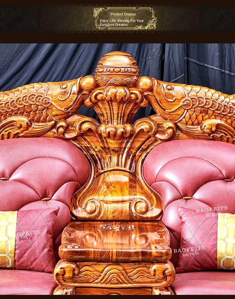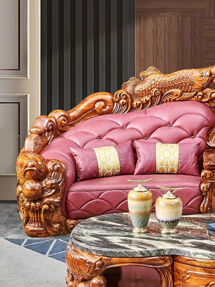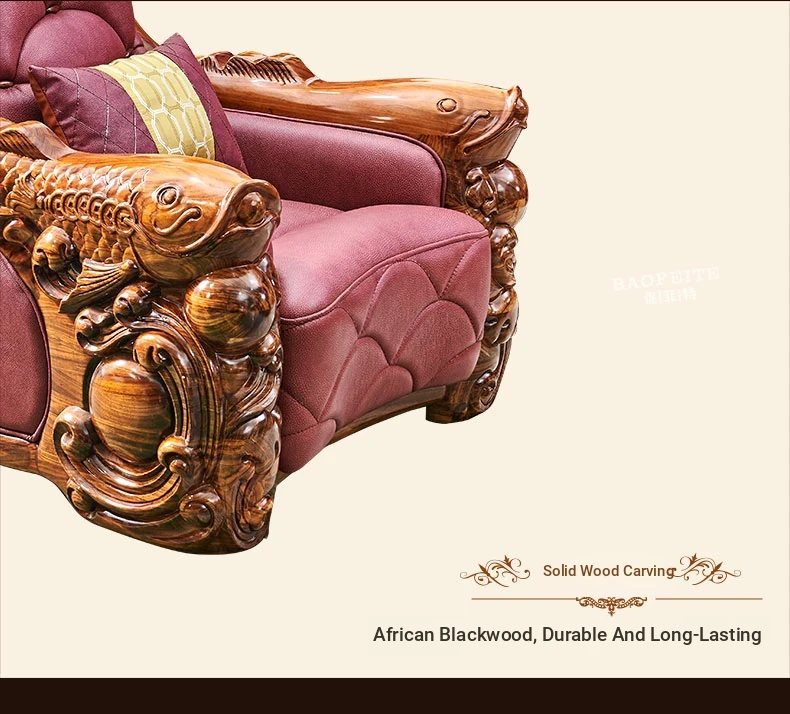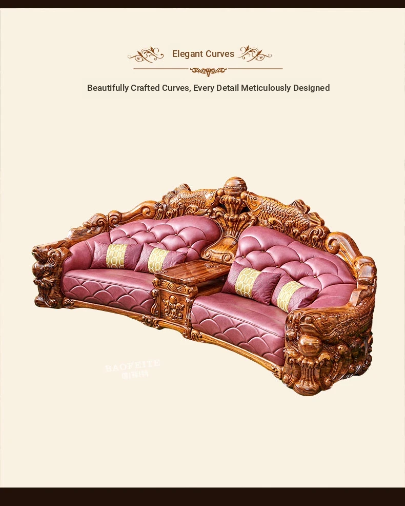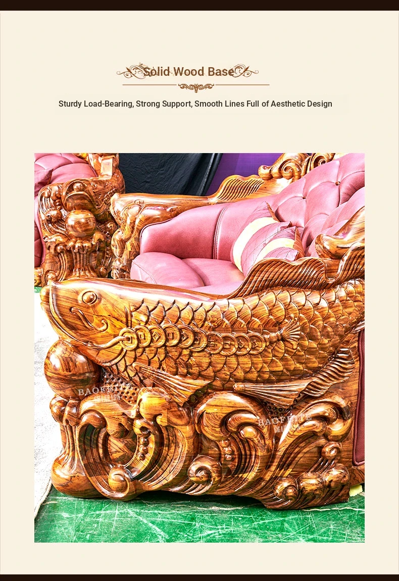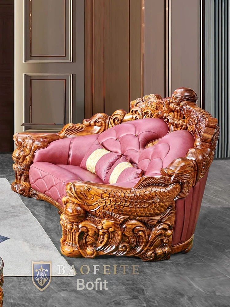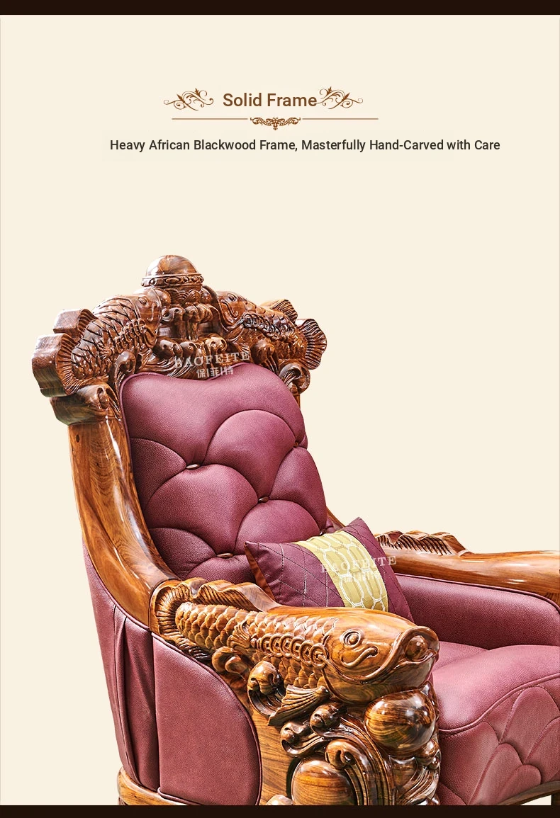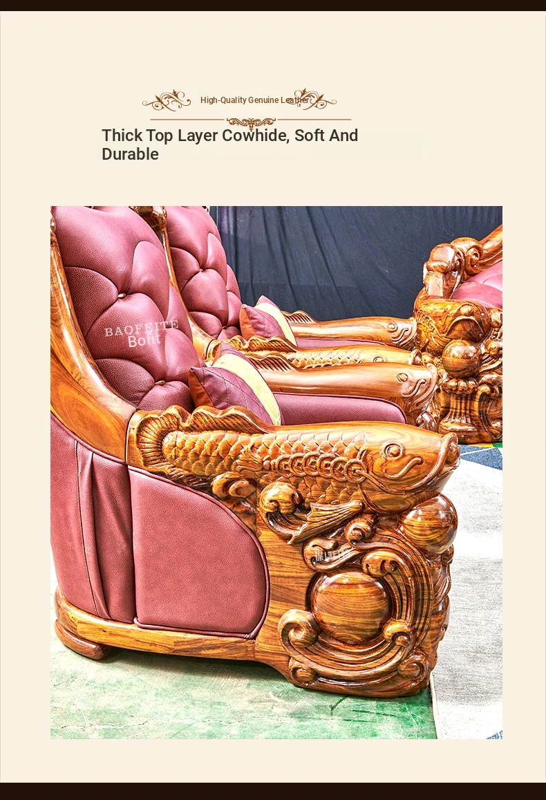 Bofeit Premium Solid Wood Carved Sofa with Top-Grade Cowhide - Luxurious Living Room Furniture Featuring "Abundance Year After Year" Design