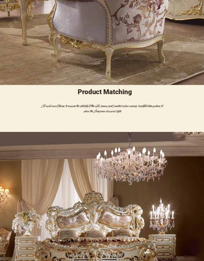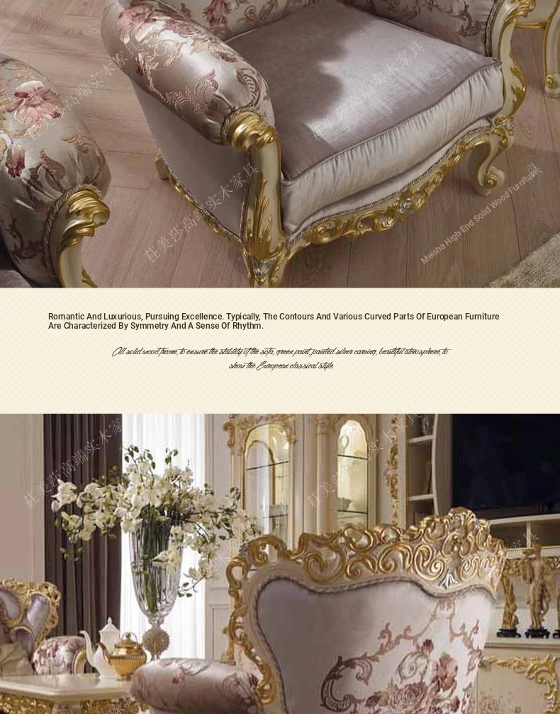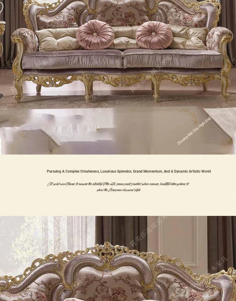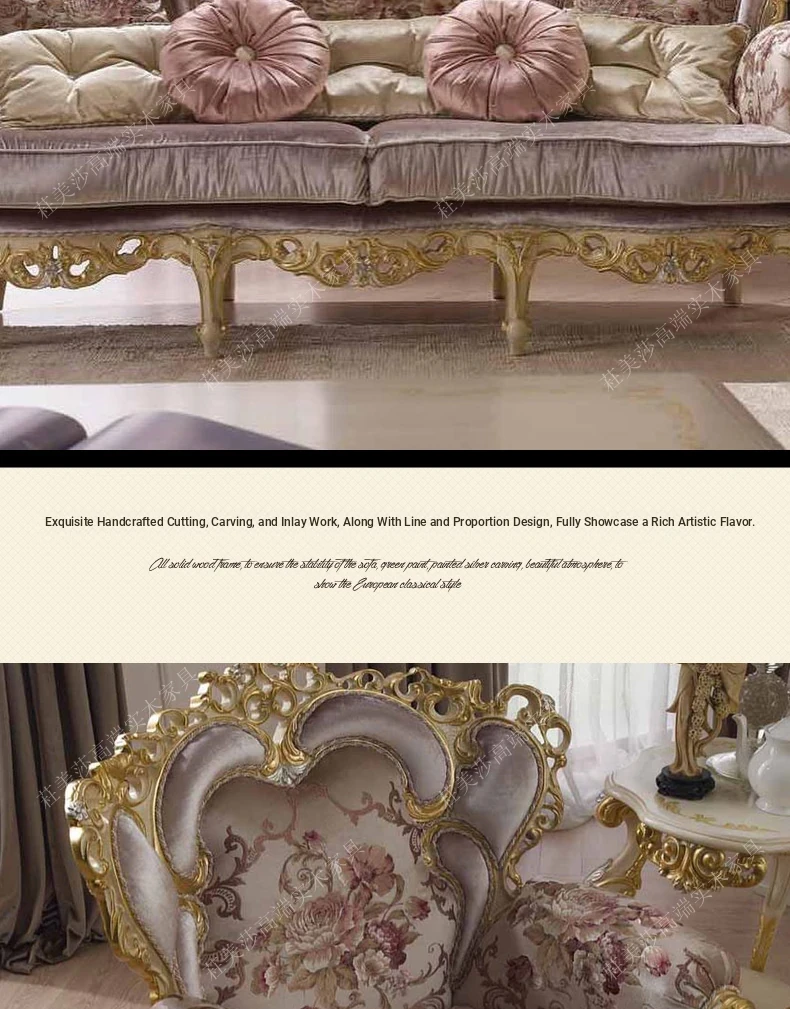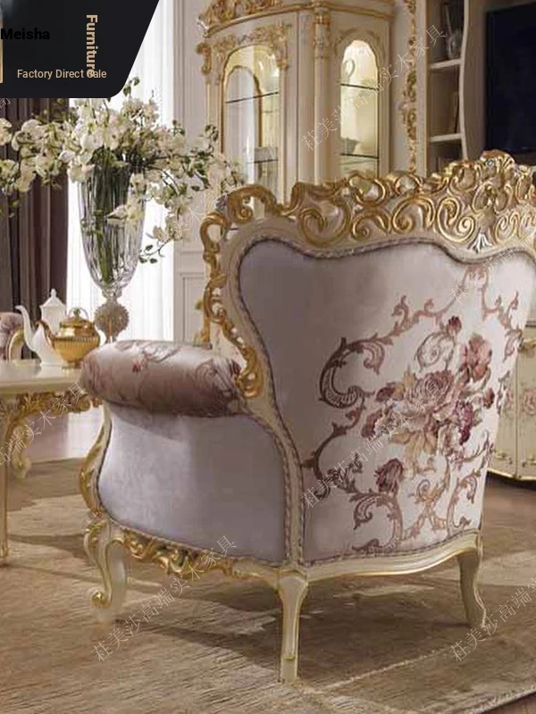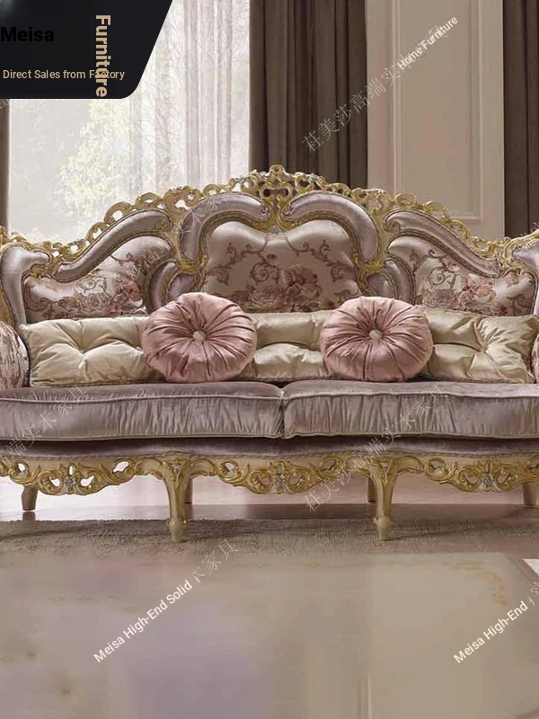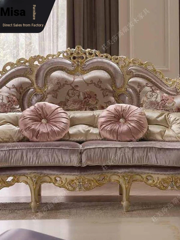 Elegant European Solid Wood Hand-Carved Vintage Fabric Sofa with French Palace Luxury Design, complemented by a Marble Coffee Table - Perfect for Villa Furnishings.