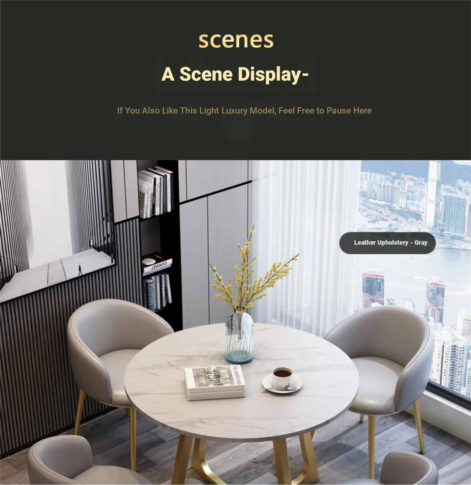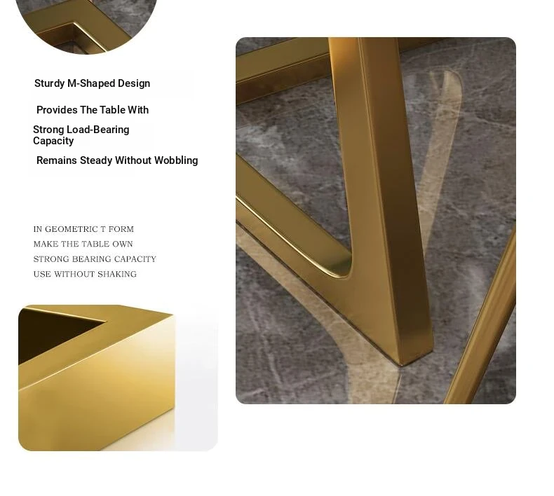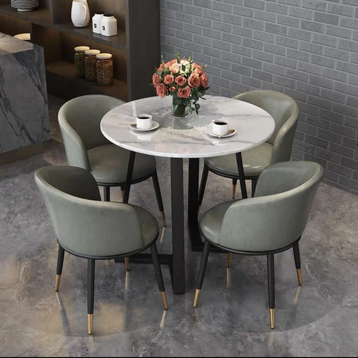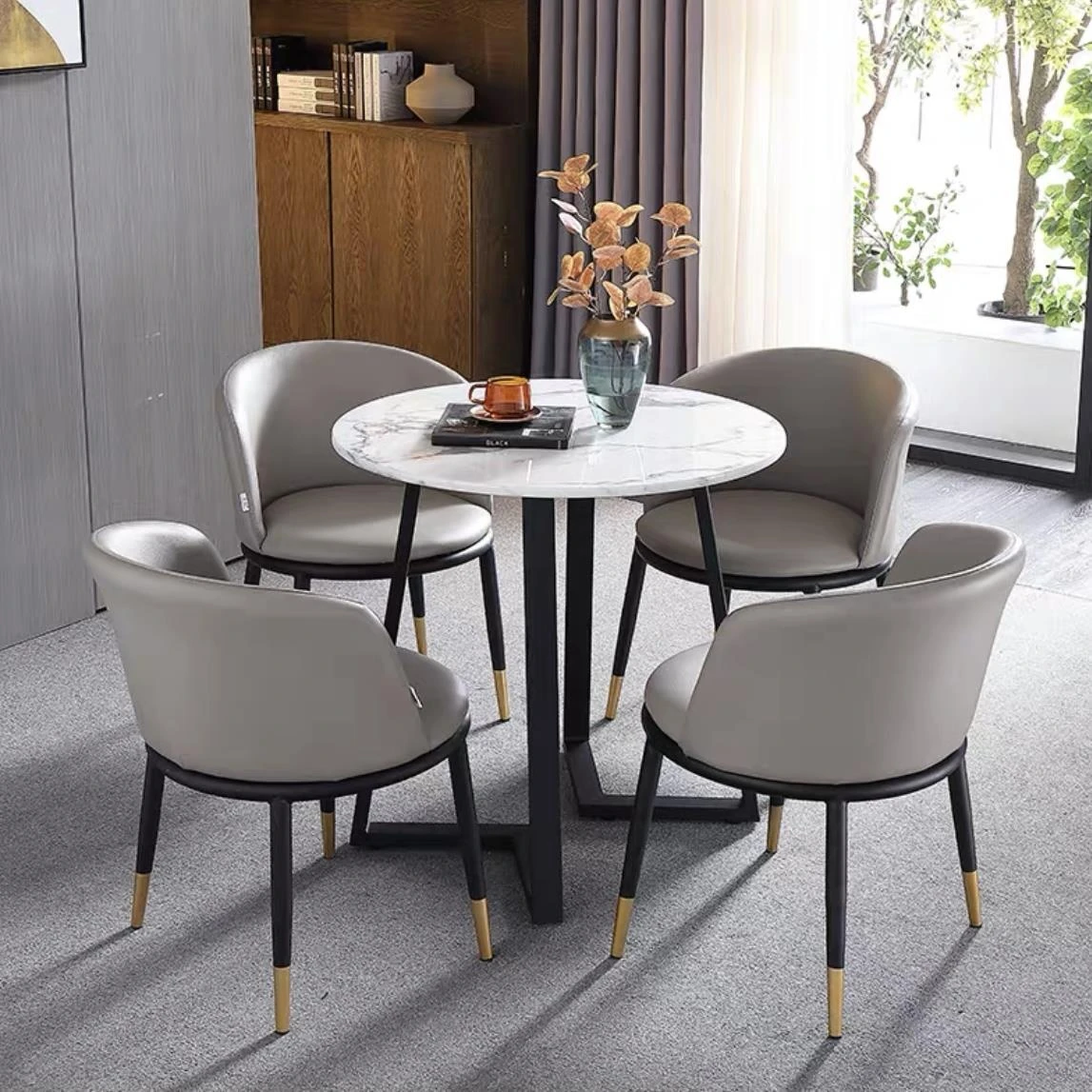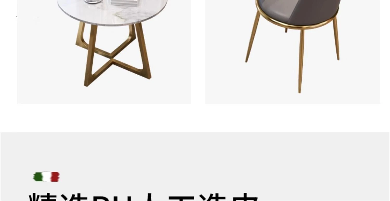 One table and four chairs gray PU leather gold feet white matte rock board