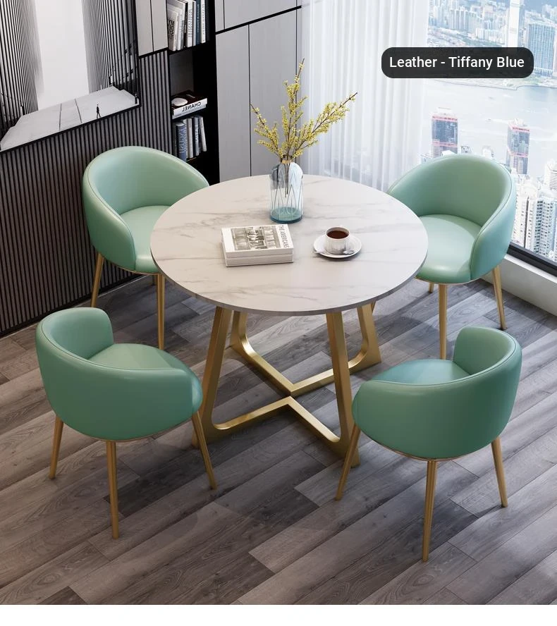 One table four chairs Tiffany blue PU leather gold feet White Matte