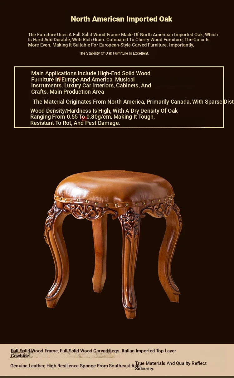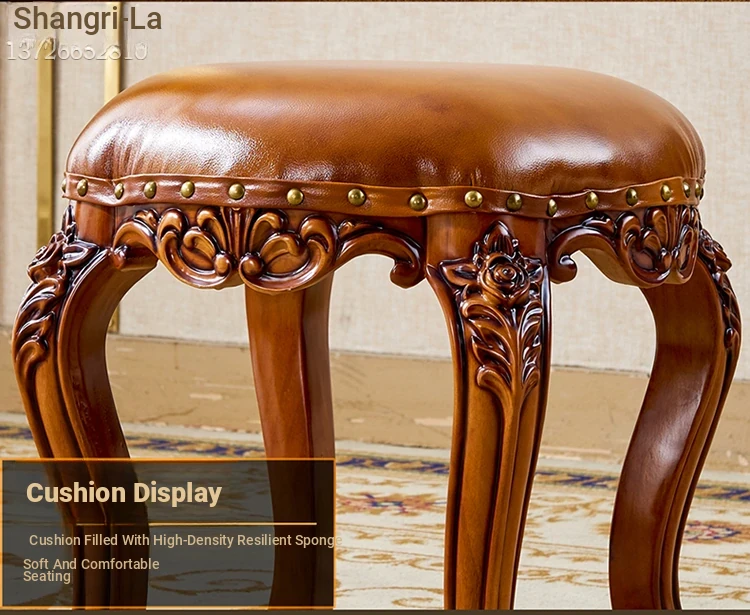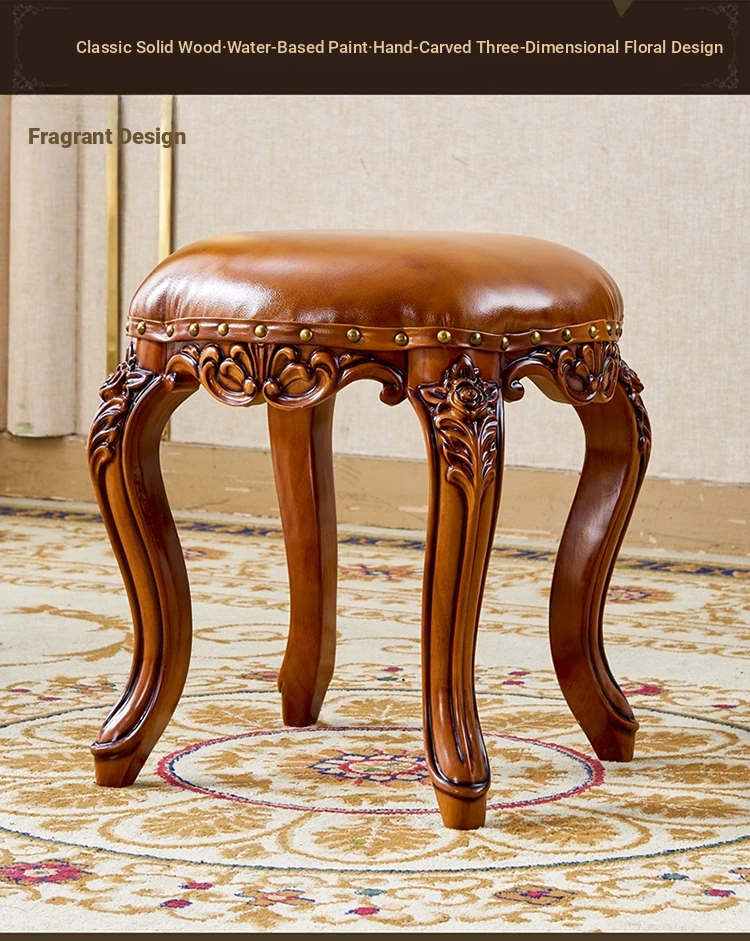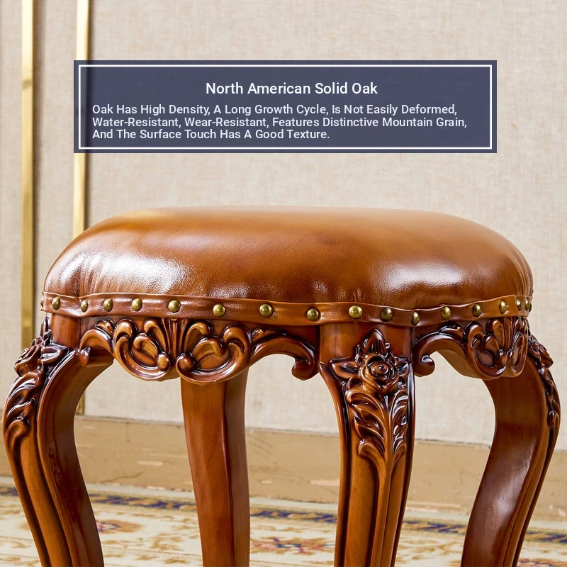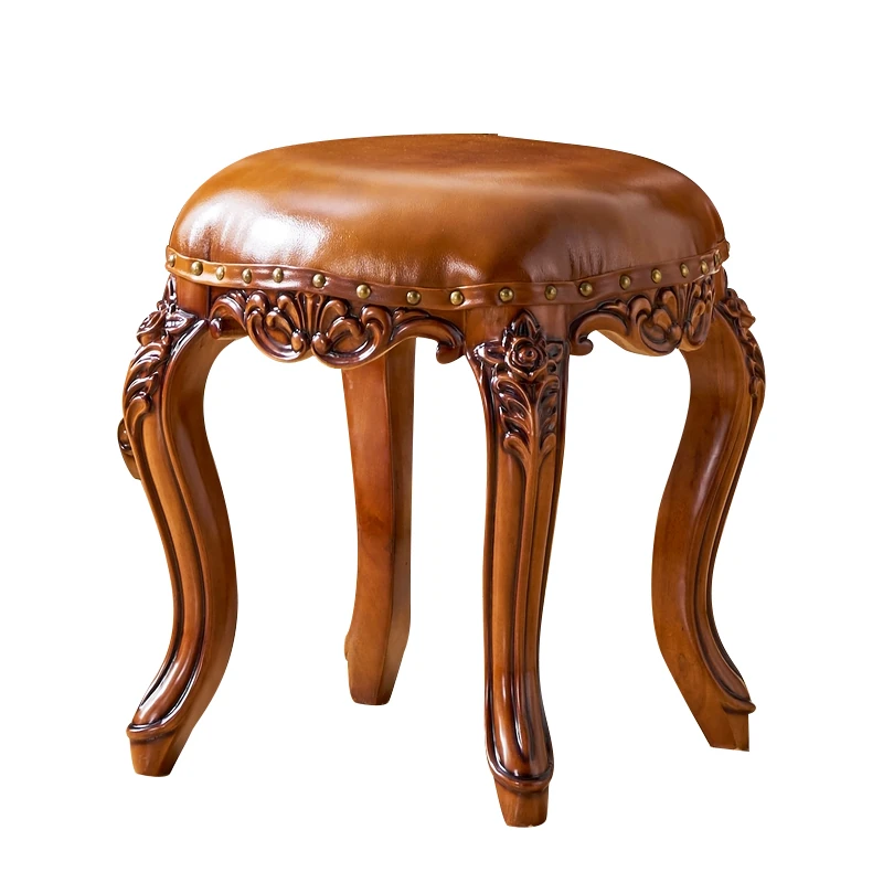European Style Genuine Leather Vanity Stool - American Solid Wood Painted Tea Stool for Kids, Home Shoe Changing Bench, Low Stool, Bedroom Dressing Table Seat