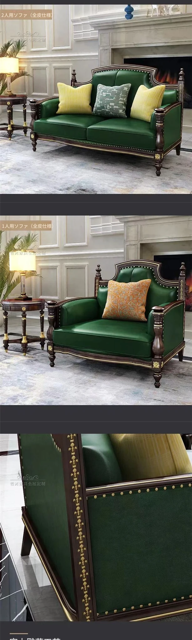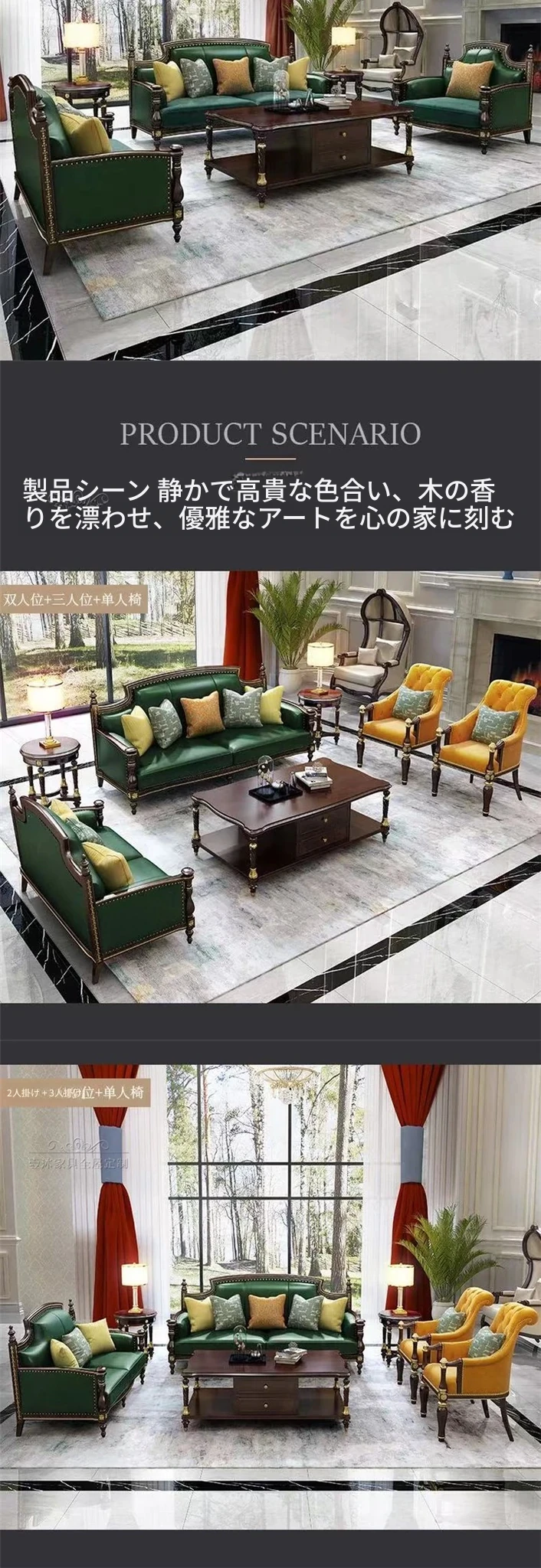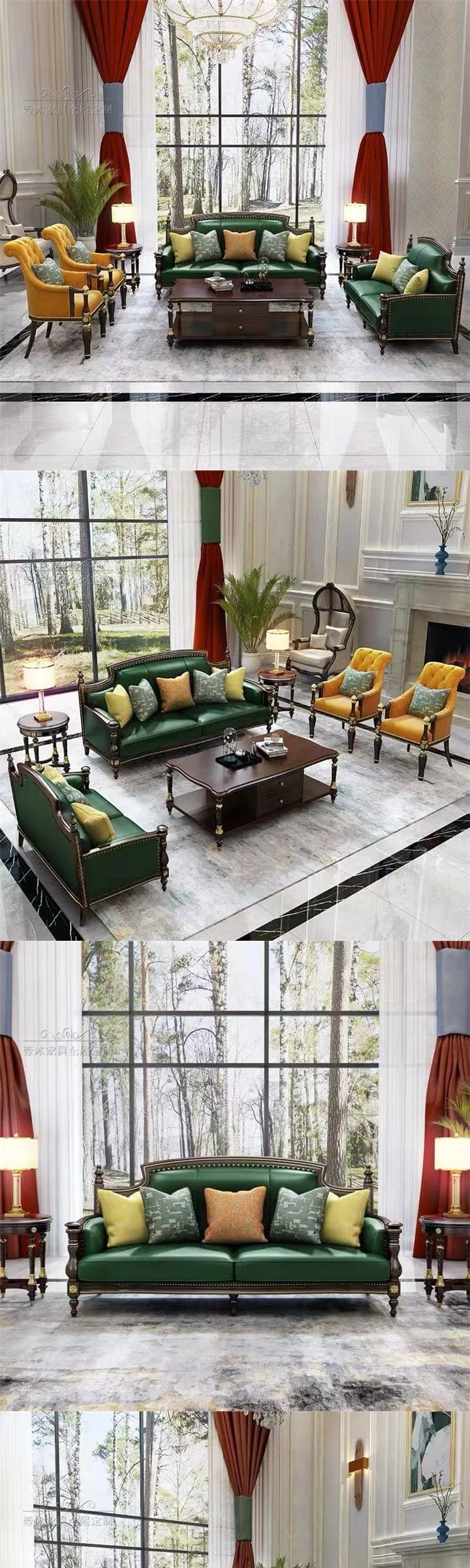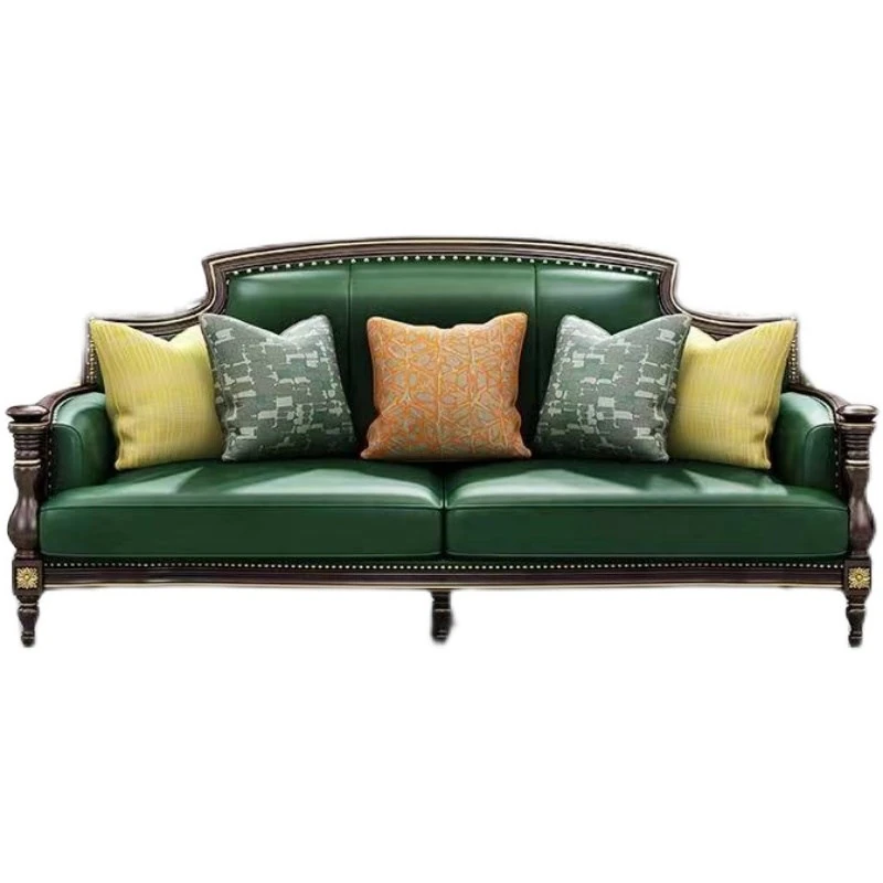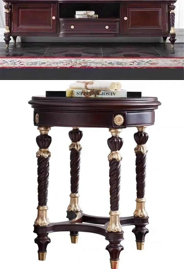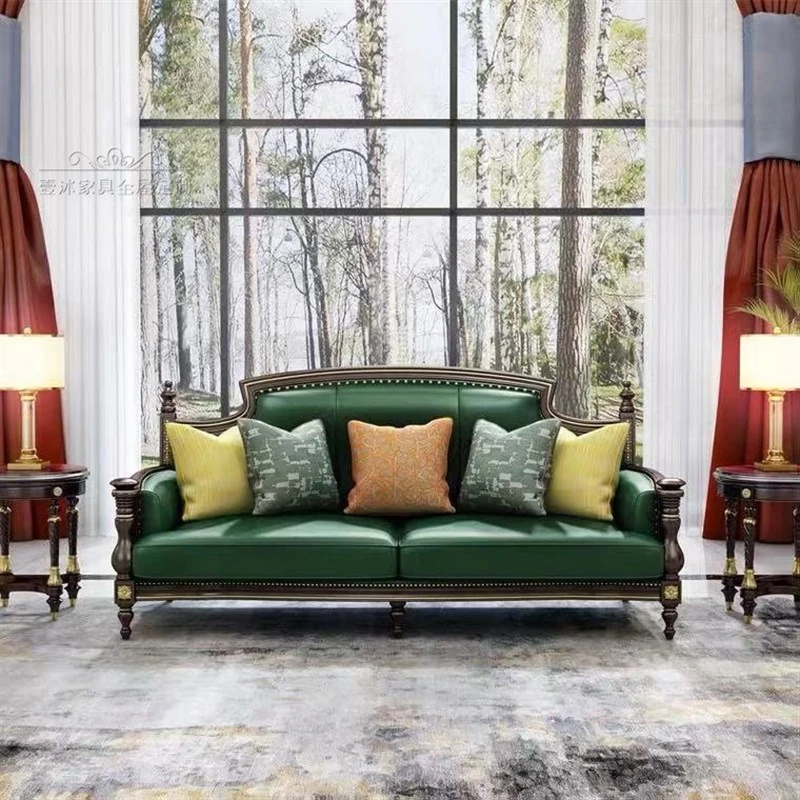 アメリカンスタイルの無垢材彫刻ソファセット - 高級別荘向け、広々としたリビングに最適!ラグジュアリーなティーテーブルとテレビキャビネット付き、洗練された空間を演出します。