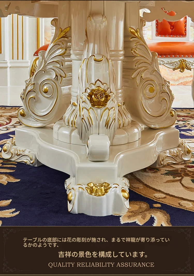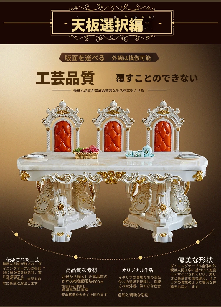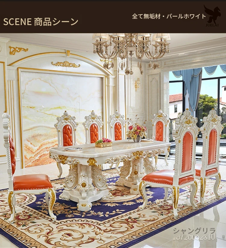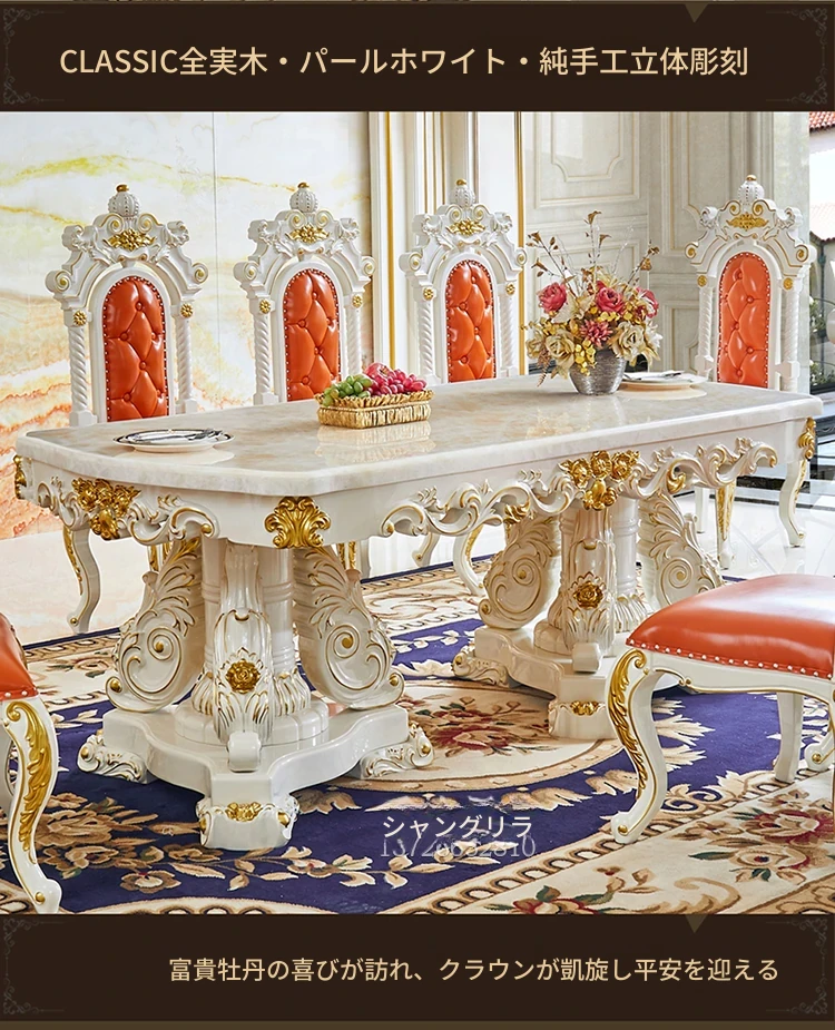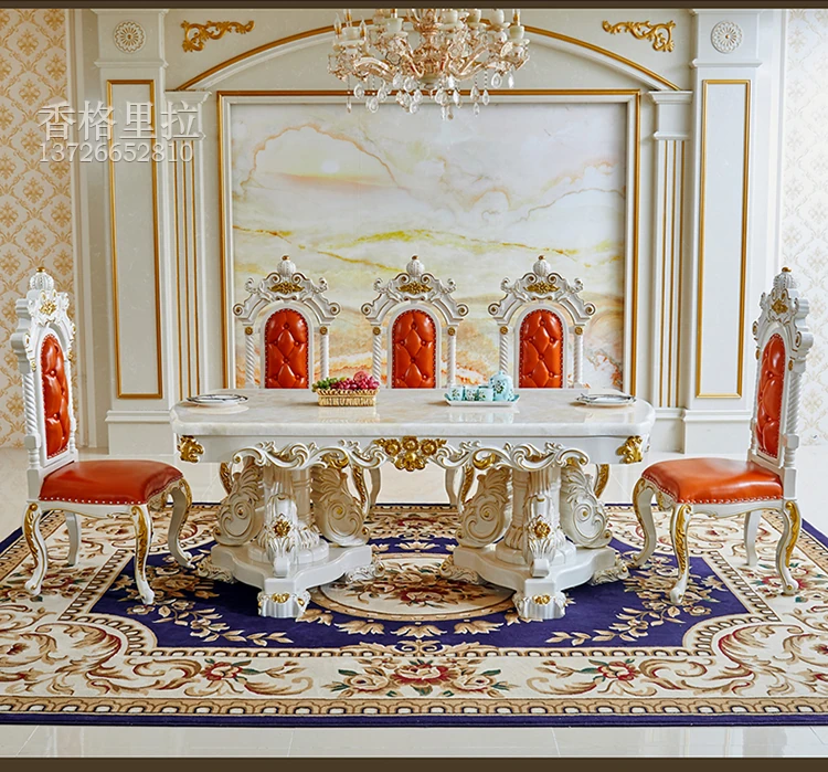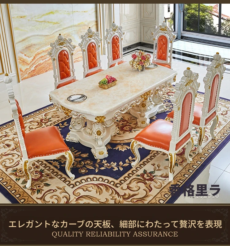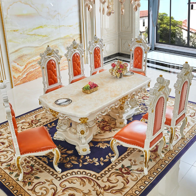 アメリカンスタイルの長方形ダイニングテーブル - ヴィラ用、全実木製、華麗な彫刻デザイン、欧州風高級感、ホテルやクラブに最適、エレガントなパールホワイト大理石の天板付き。