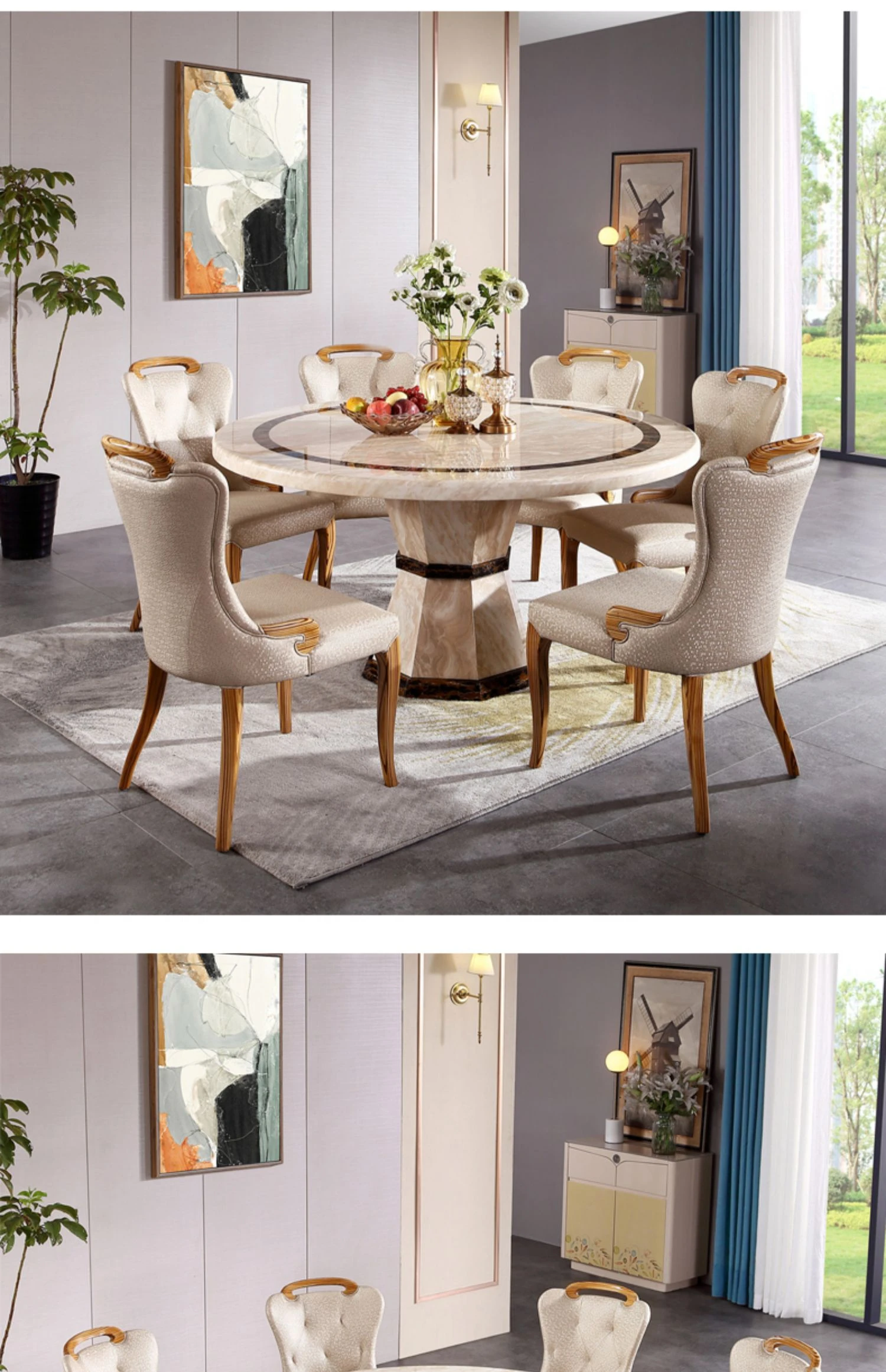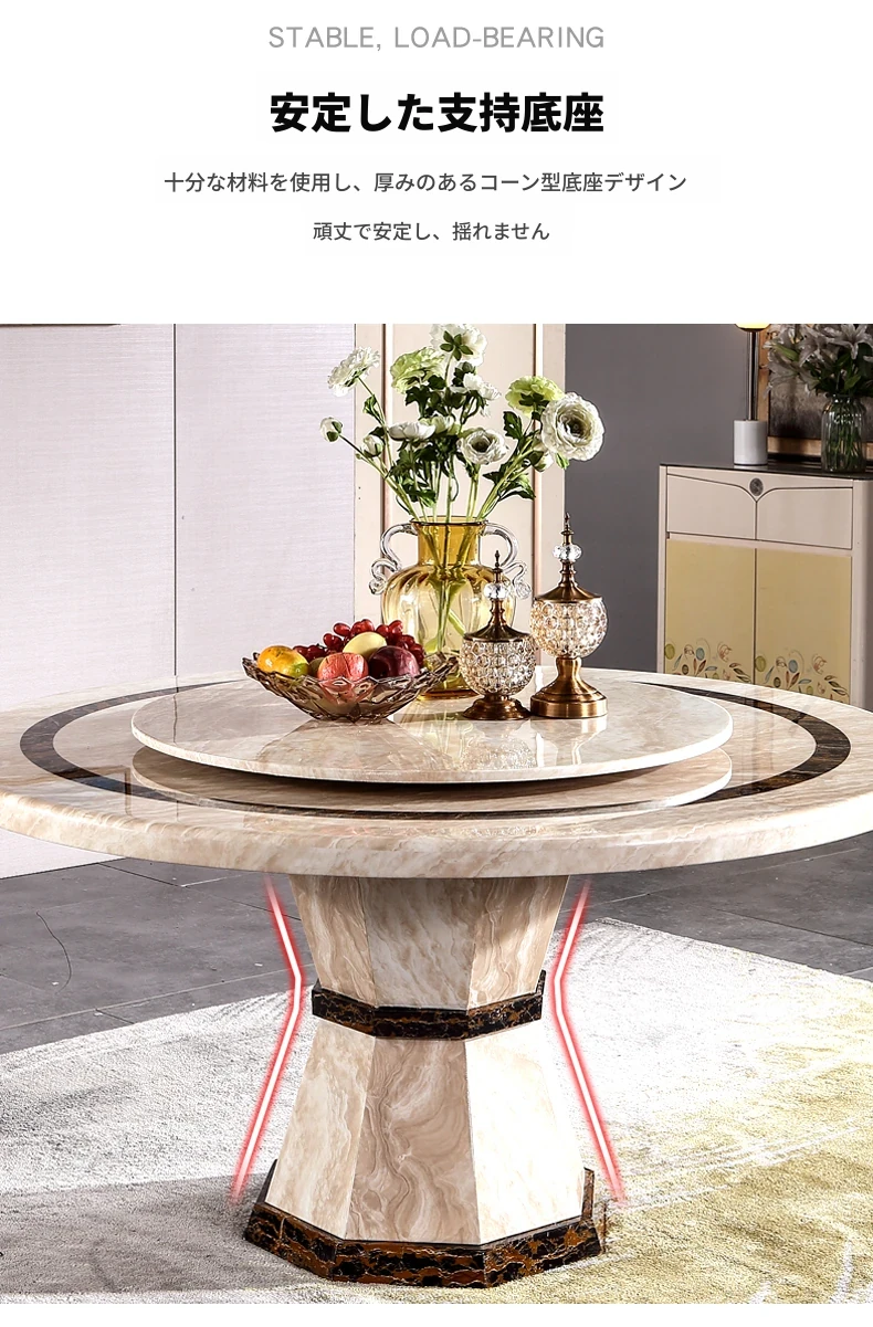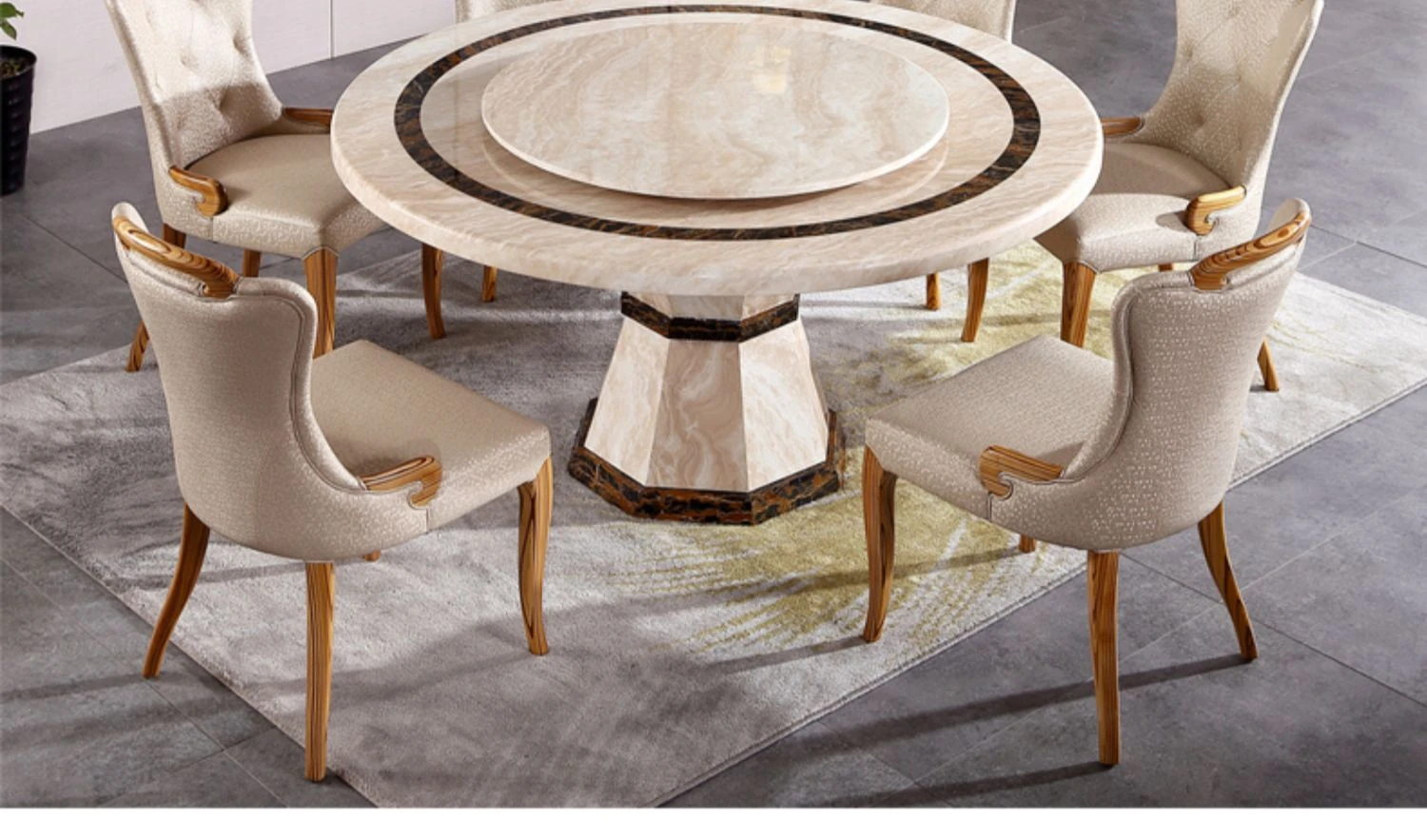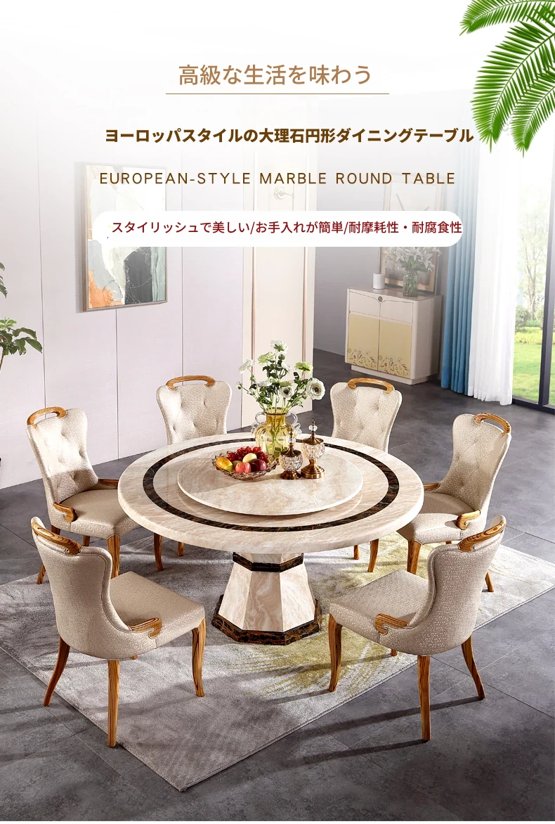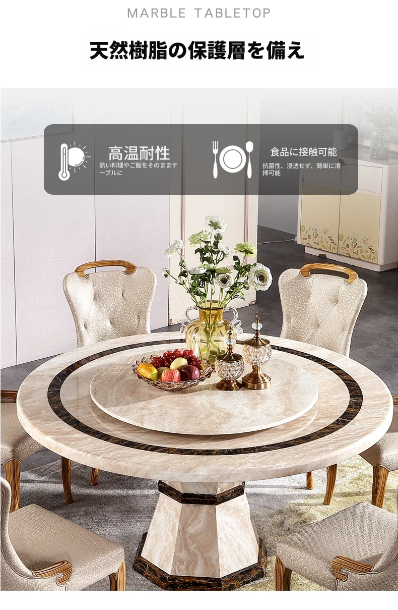 益尚坊の大理石製ダイニングテーブル&チェアセット - 高級ヴィラ向け、ミルクベージュ色の6〜10人用ホテル向けラウンドテーブル。優雅な欧風デザインで、特別なひとときを演出します。