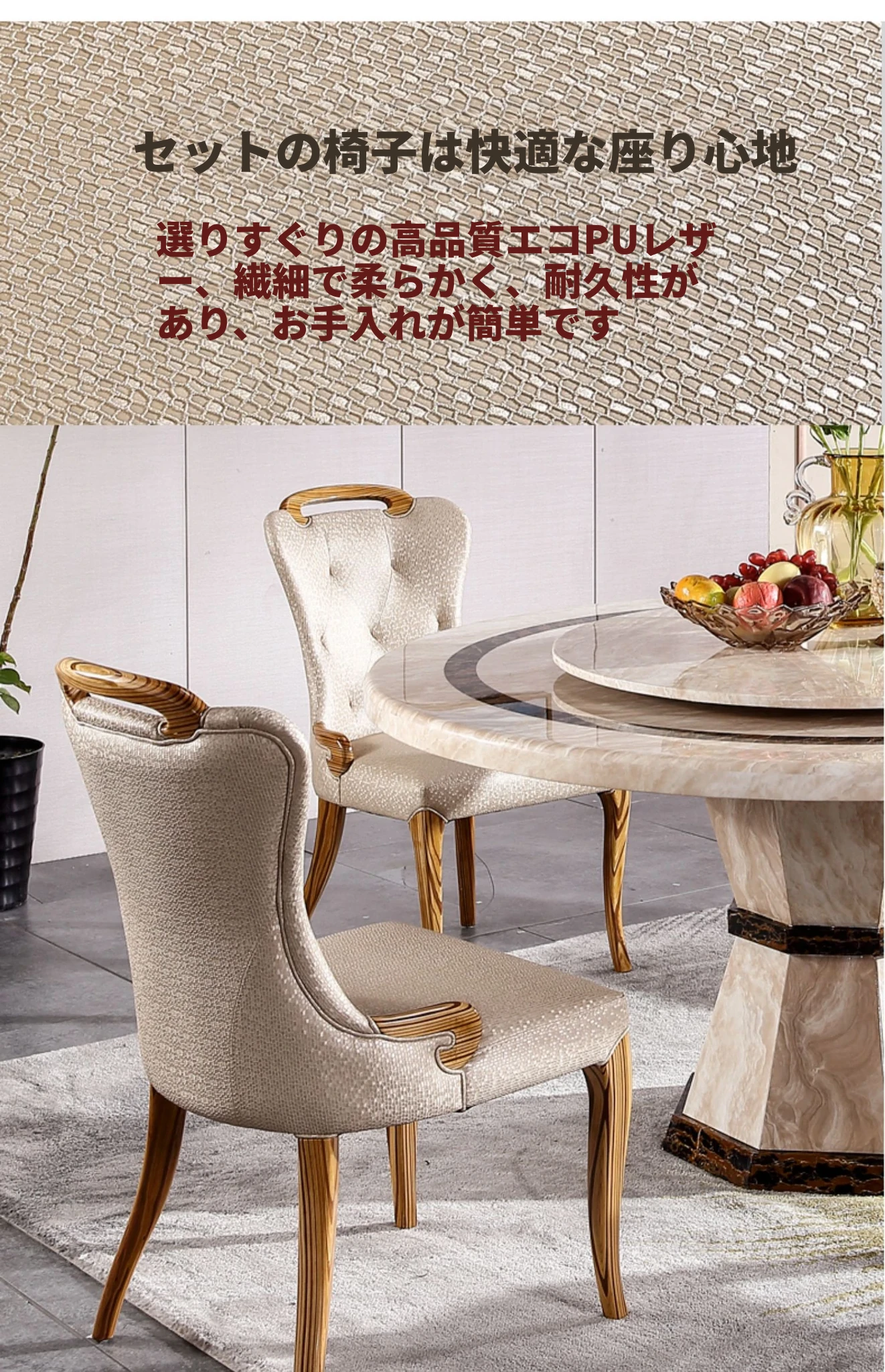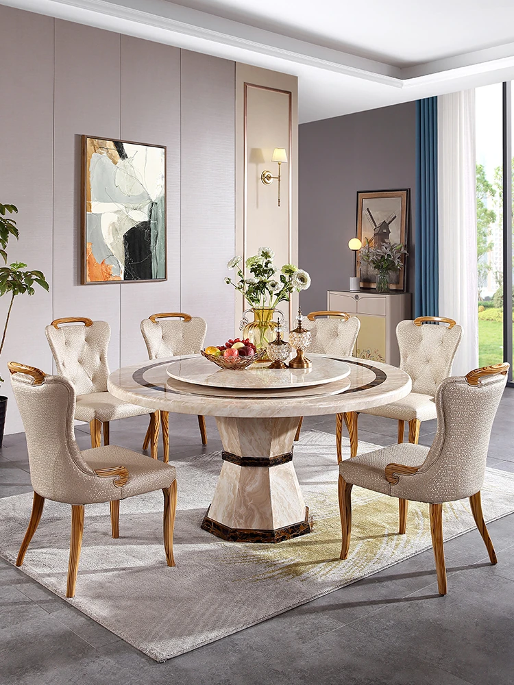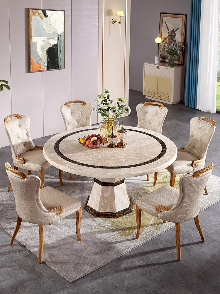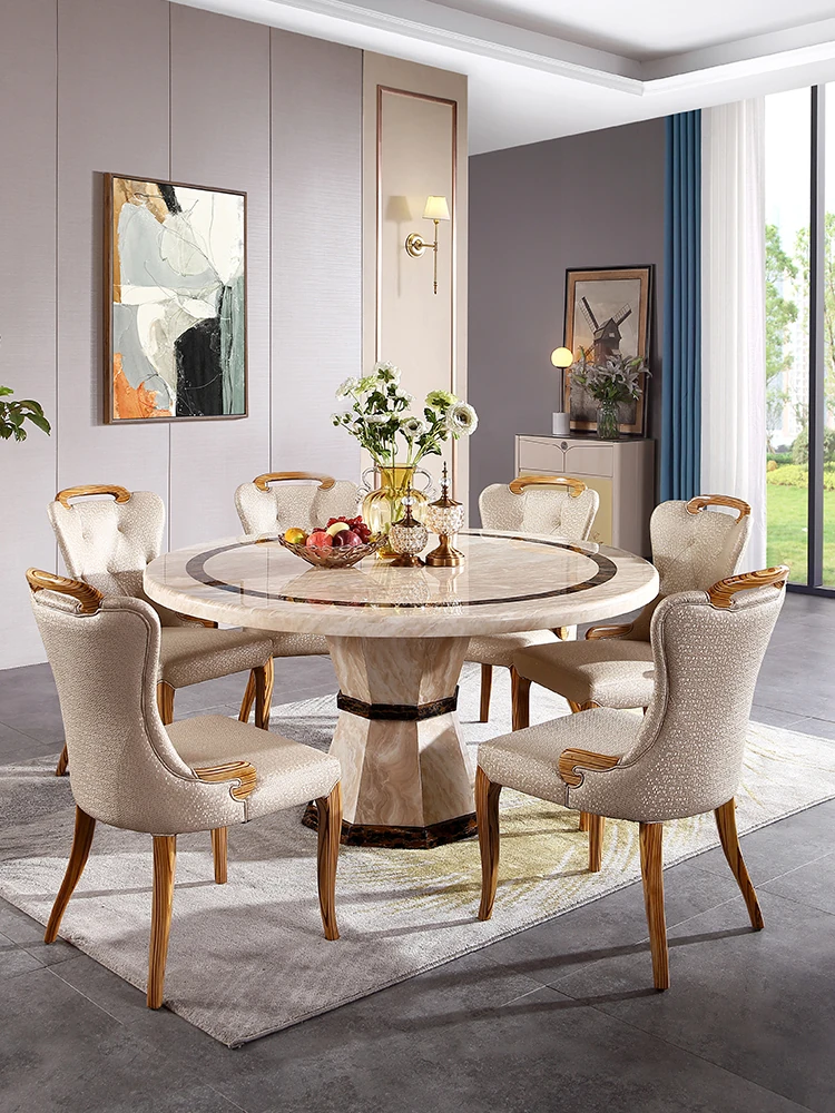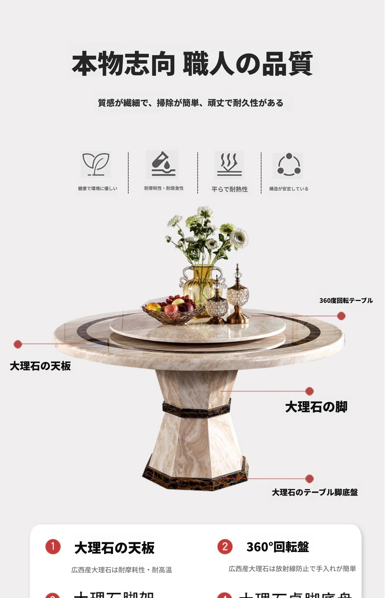 益尚坊の大理石製ダイニングテーブル&チェアセット - 高級ヴィラ向け、ミルクベージュ色の6〜10人用ホテル向けラウンドテーブル。優雅な欧風デザインで、特別なひとときを演出します。