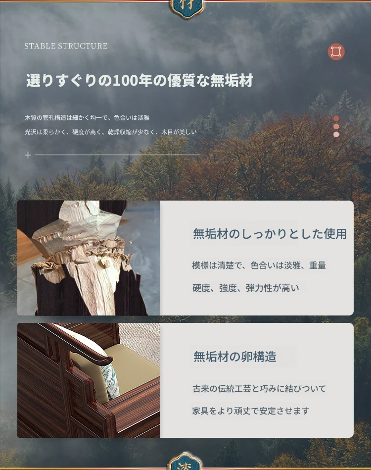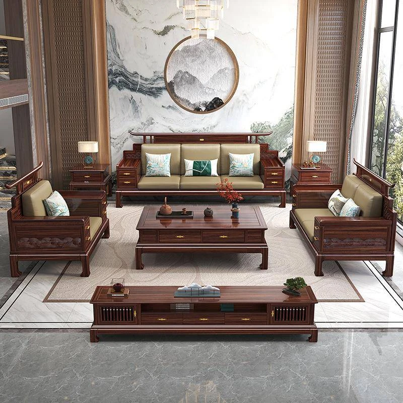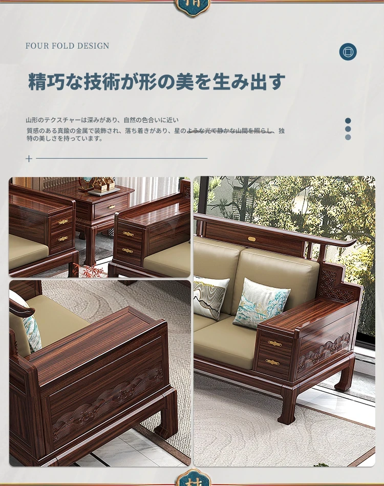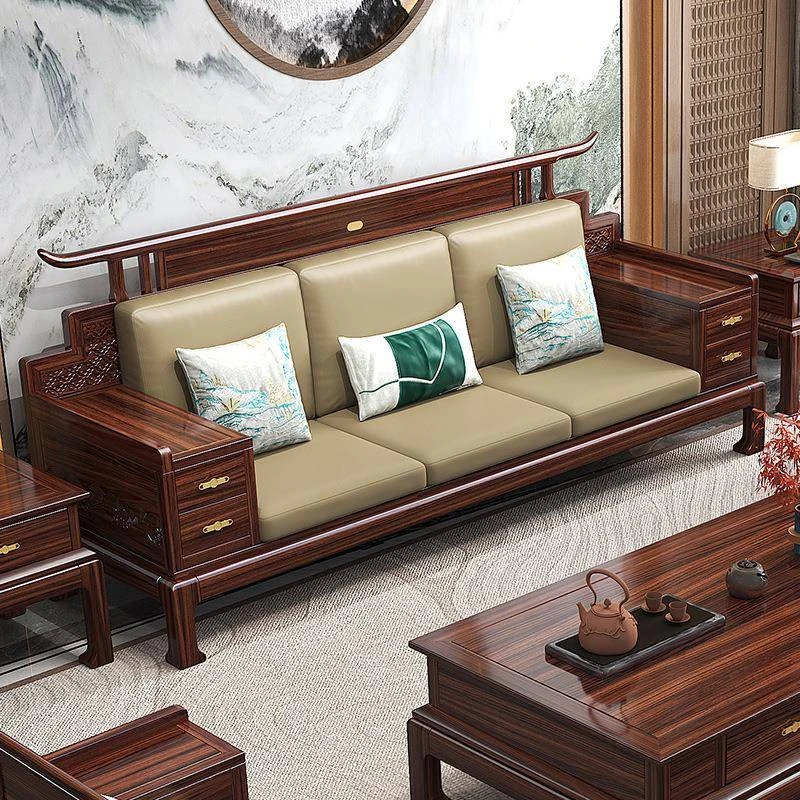 古風スタイルの高級実木製ソファ - 猫爪布使用、リビングルームにぴったりな3人掛け、ヴィラにも最適な洗練されたデザイン!快適さと美しさを兼ね備えた一品。
