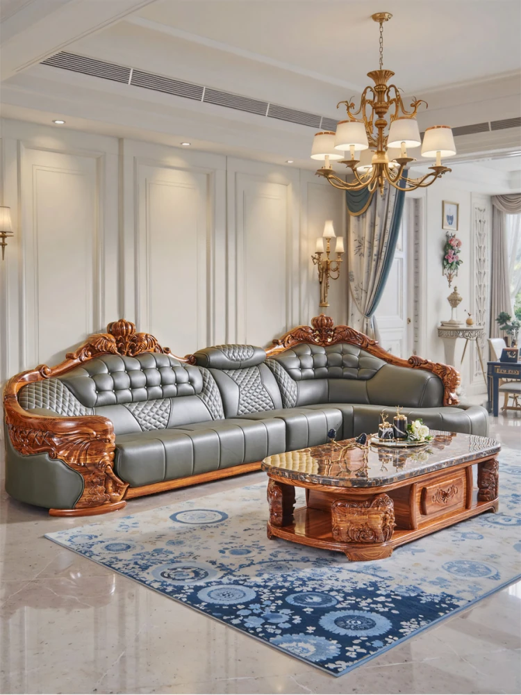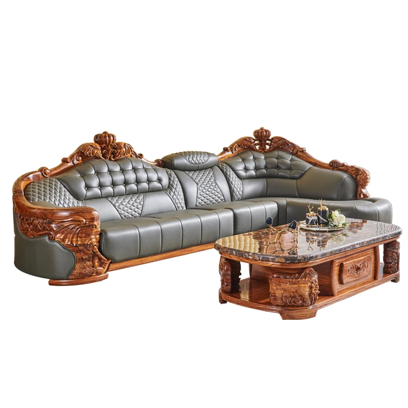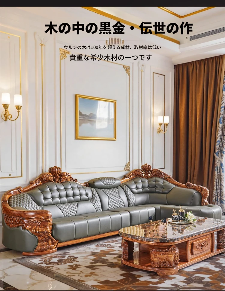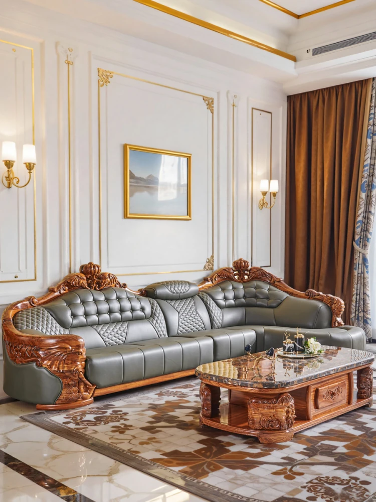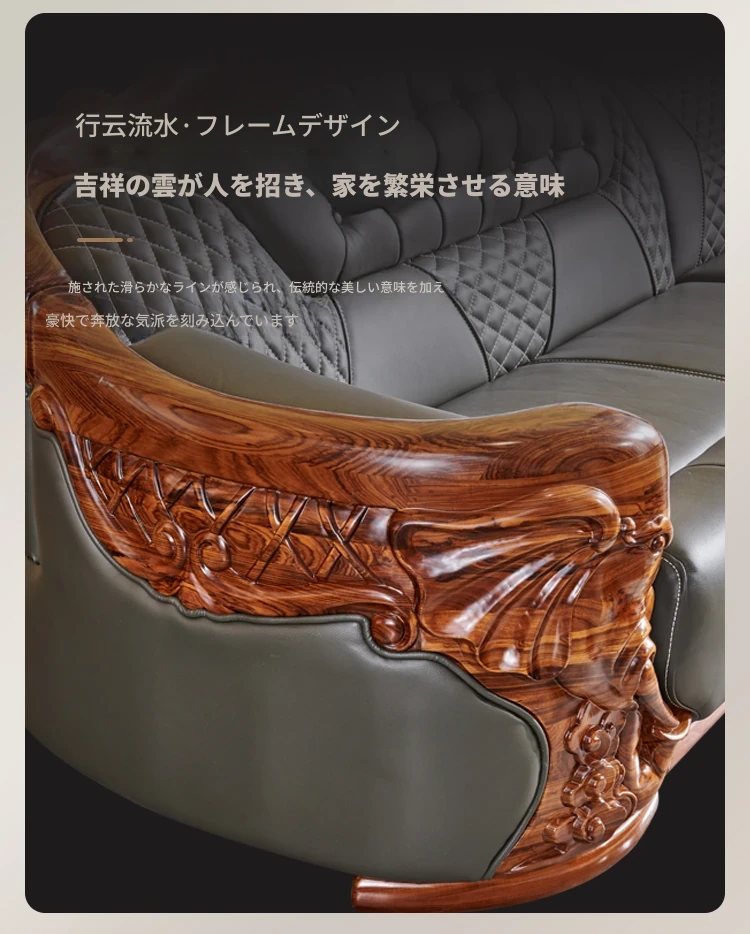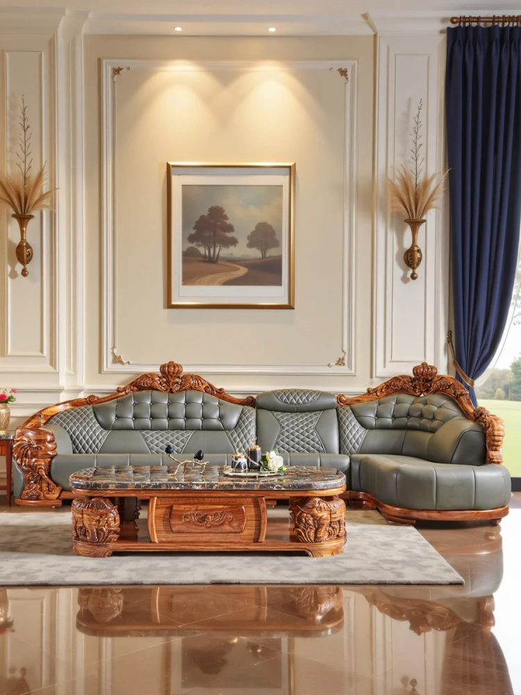 欧州風ウッドブラックレザーソファ 新中式大邸宅向けリビングルーム用 天然木製L字型コーナーソファセット - 高級感溢れるデザインで、ゆったりとした贅沢なひとときをお楽しみください!