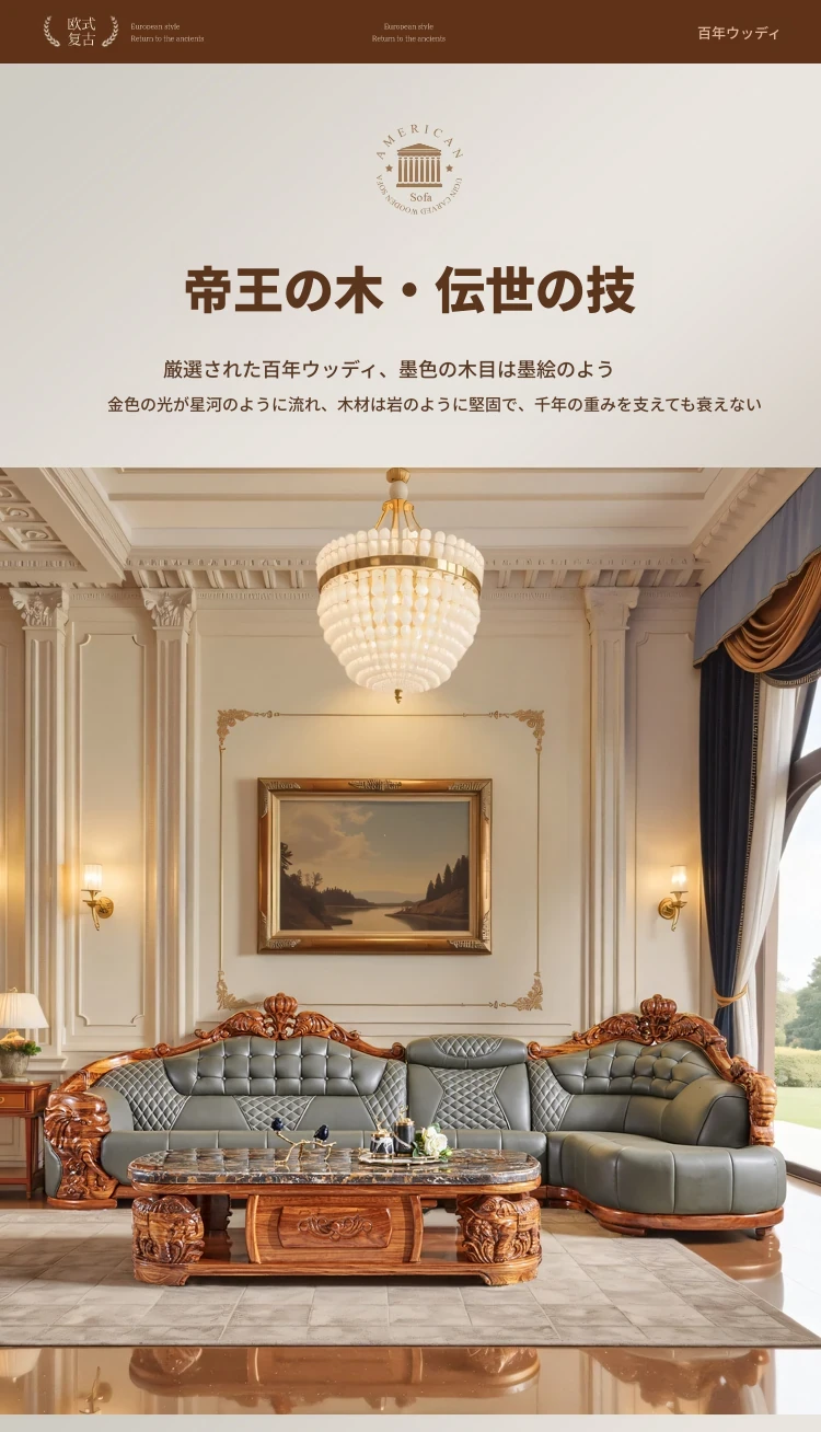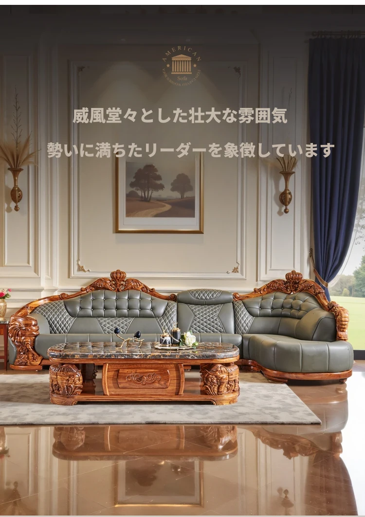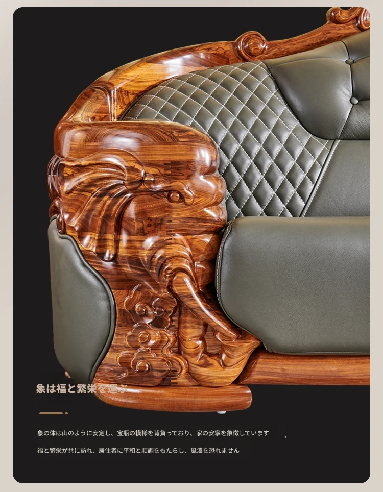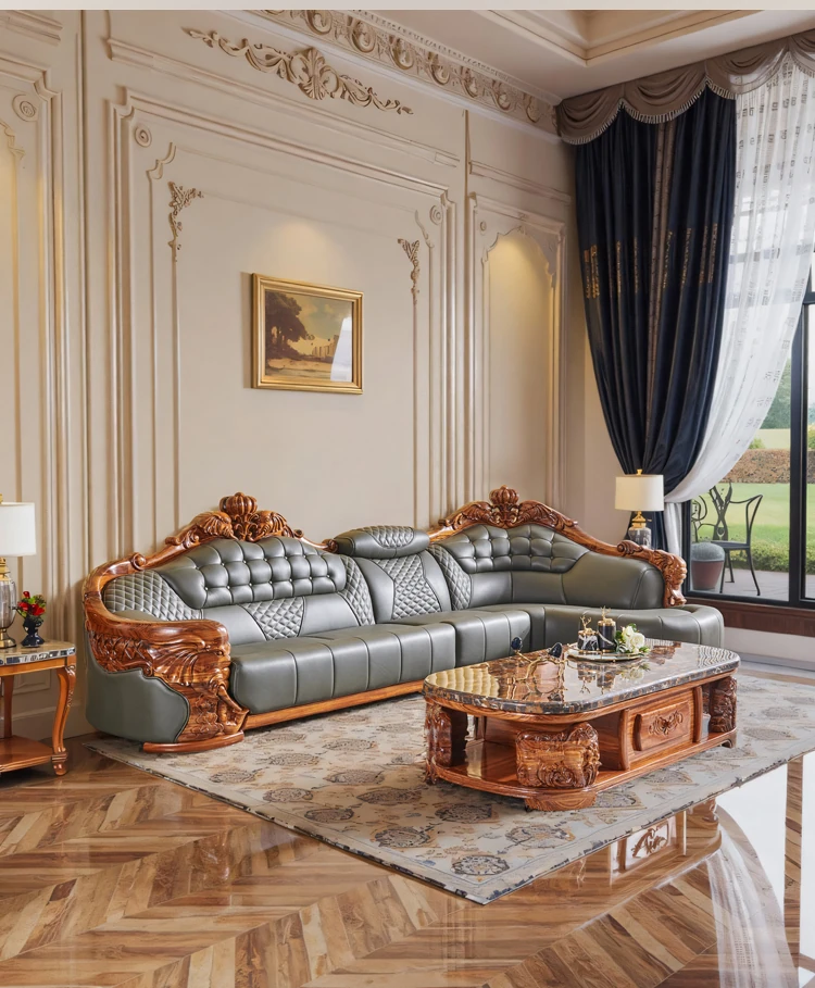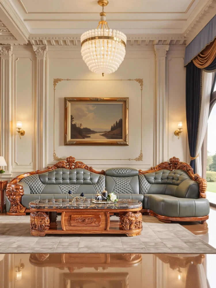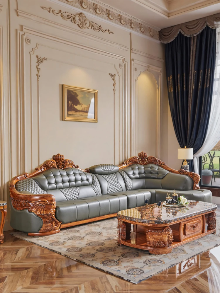 欧州風ウッドブラックレザーソファ 新中式大邸宅向けリビングルーム用 天然木製L字型コーナーソファセット - 高級感溢れるデザインで、ゆったりとした贅沢なひとときをお楽しみください!