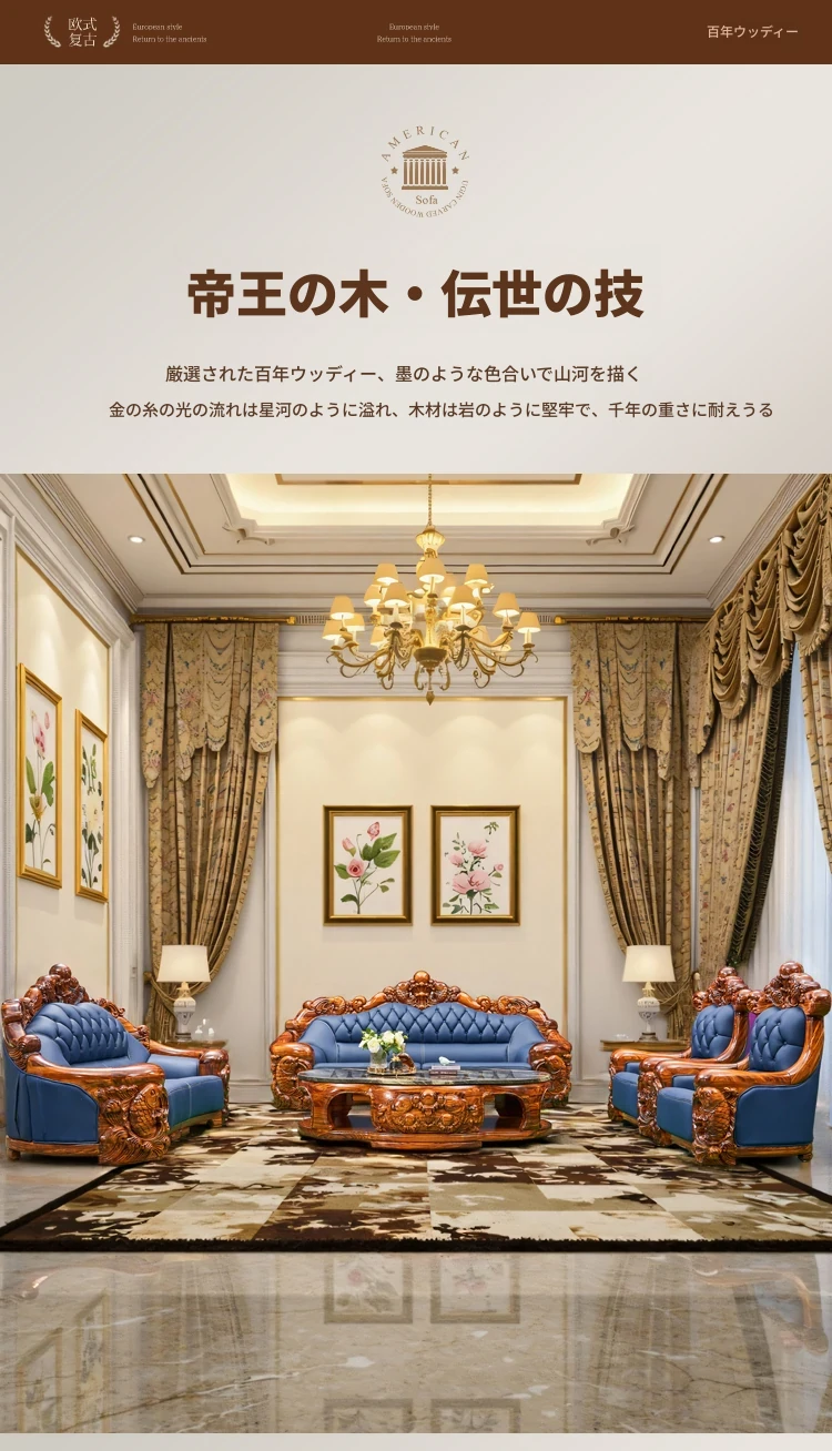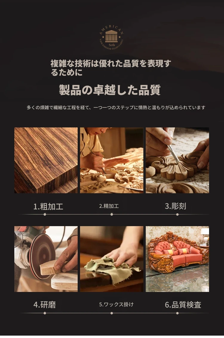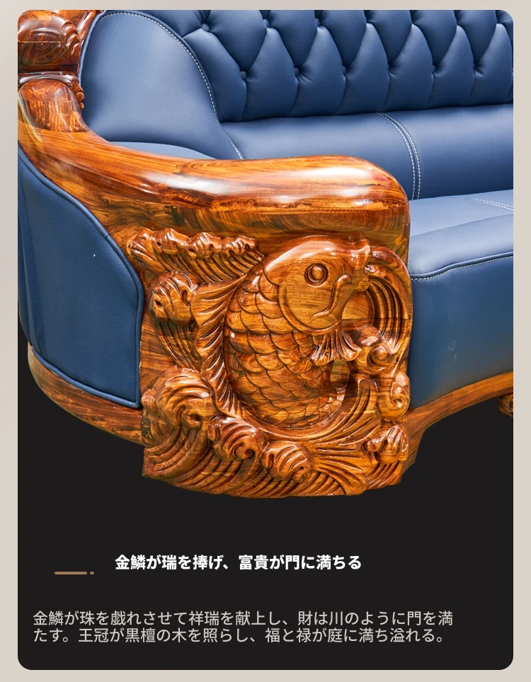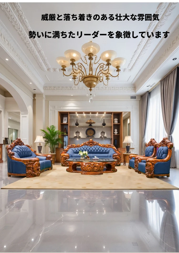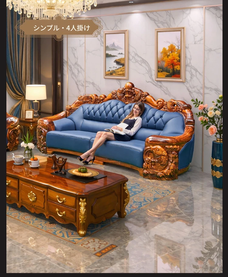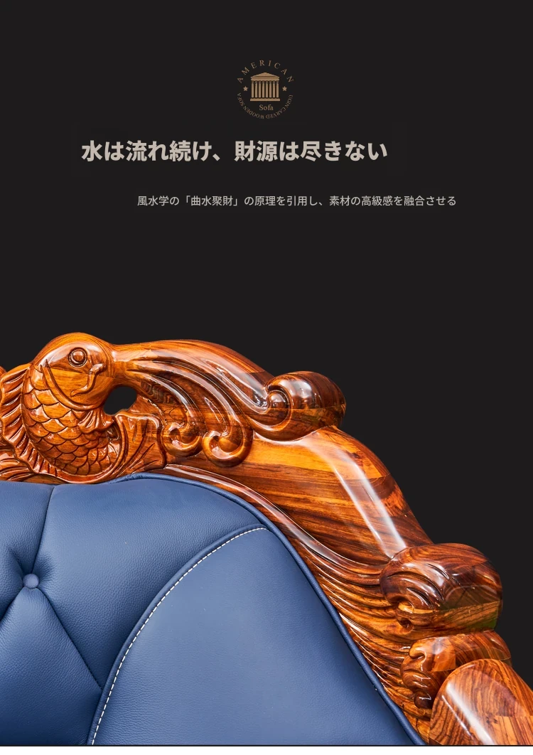 欧風ウッドブラックソファー 大型別荘向け 新中式デザイン 本革使用 四人掛けソファセット 高級感あふれる実木製で、スタイリッシュな空間を演出!