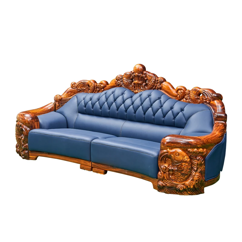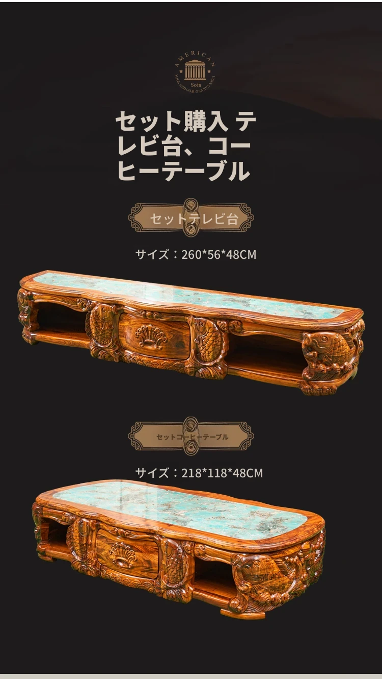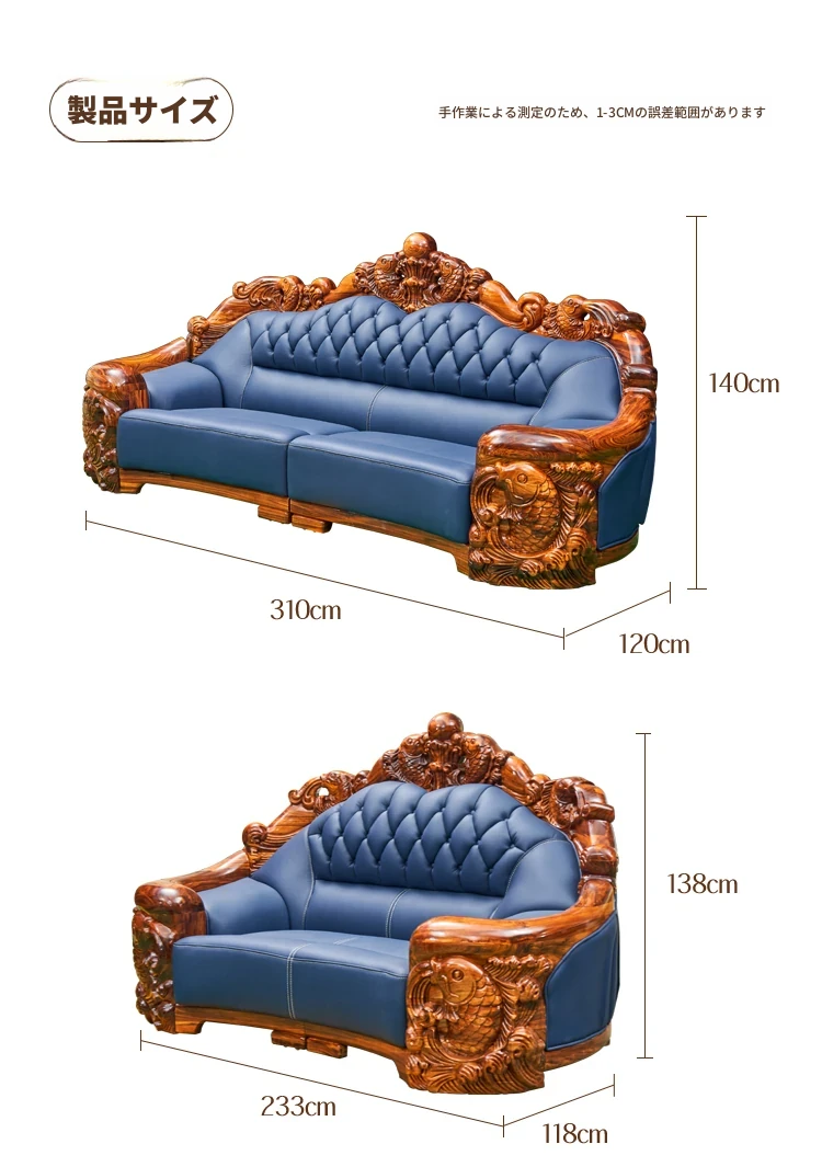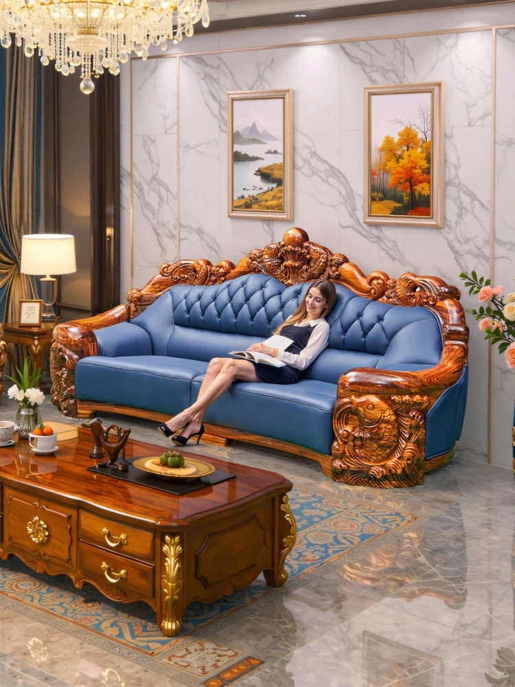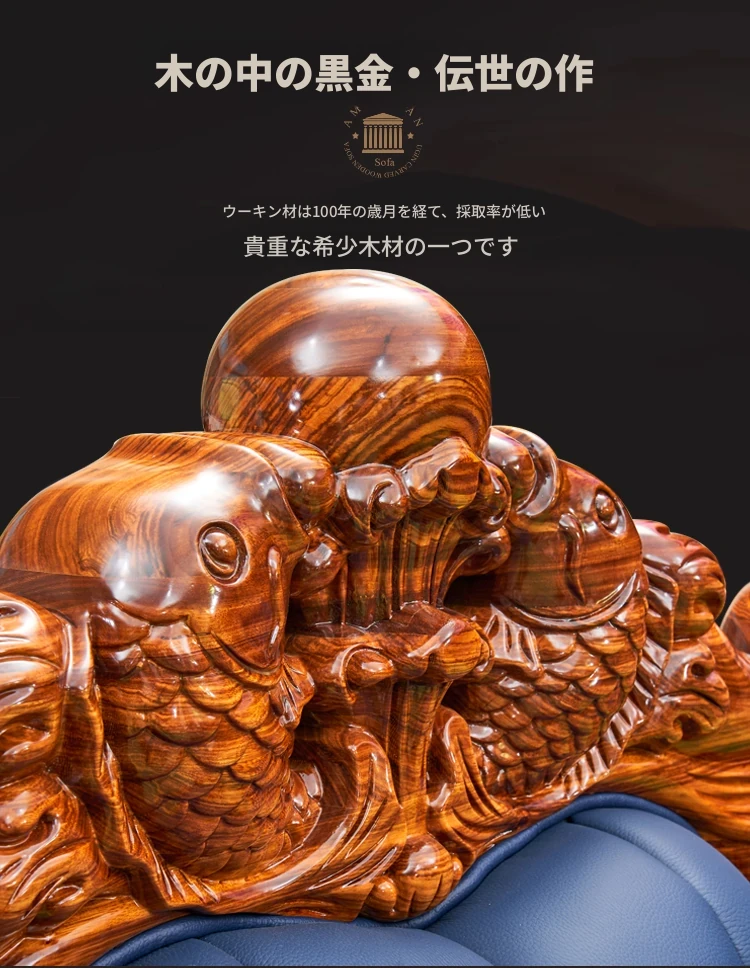 欧風ウッドブラックソファー 大型別荘向け 新中式デザイン 本革使用 四人掛けソファセット 高級感あふれる実木製で、スタイリッシュな空間を演出!
