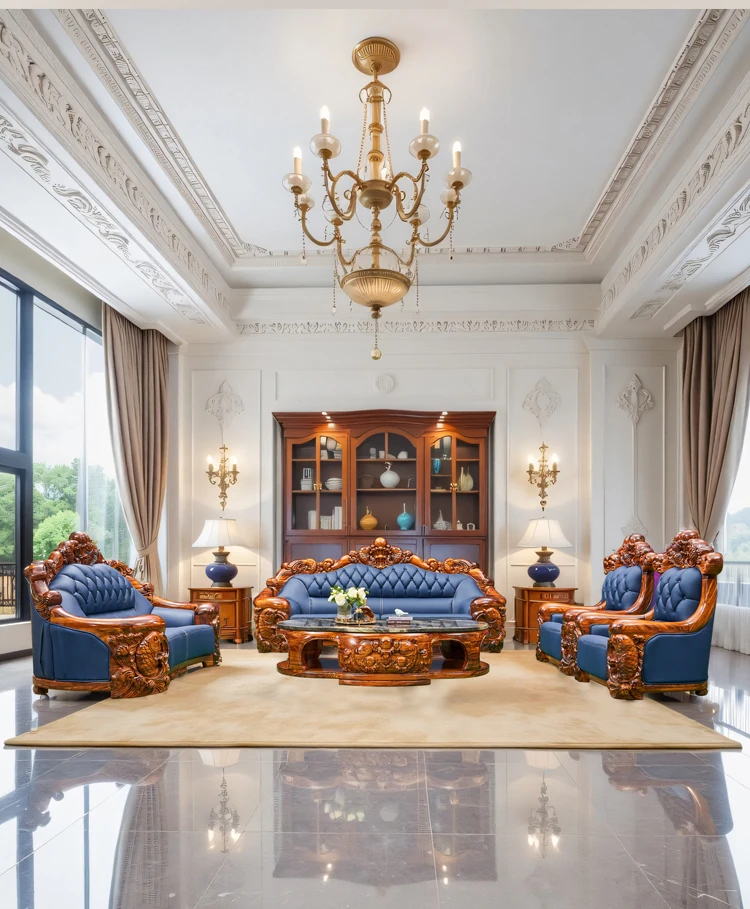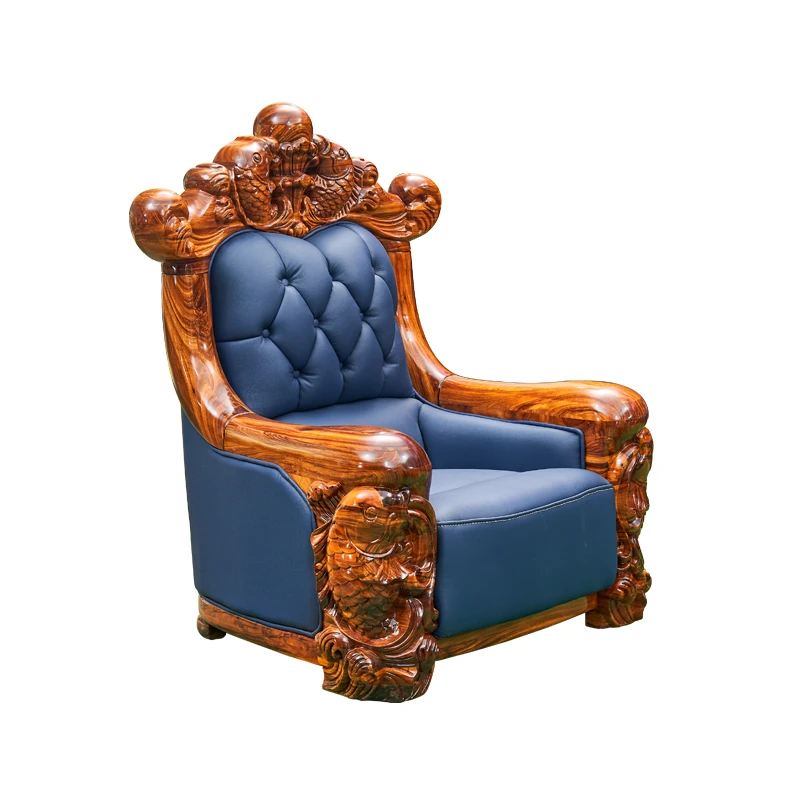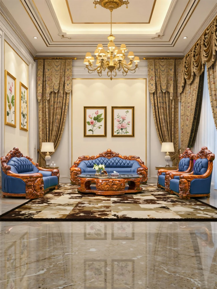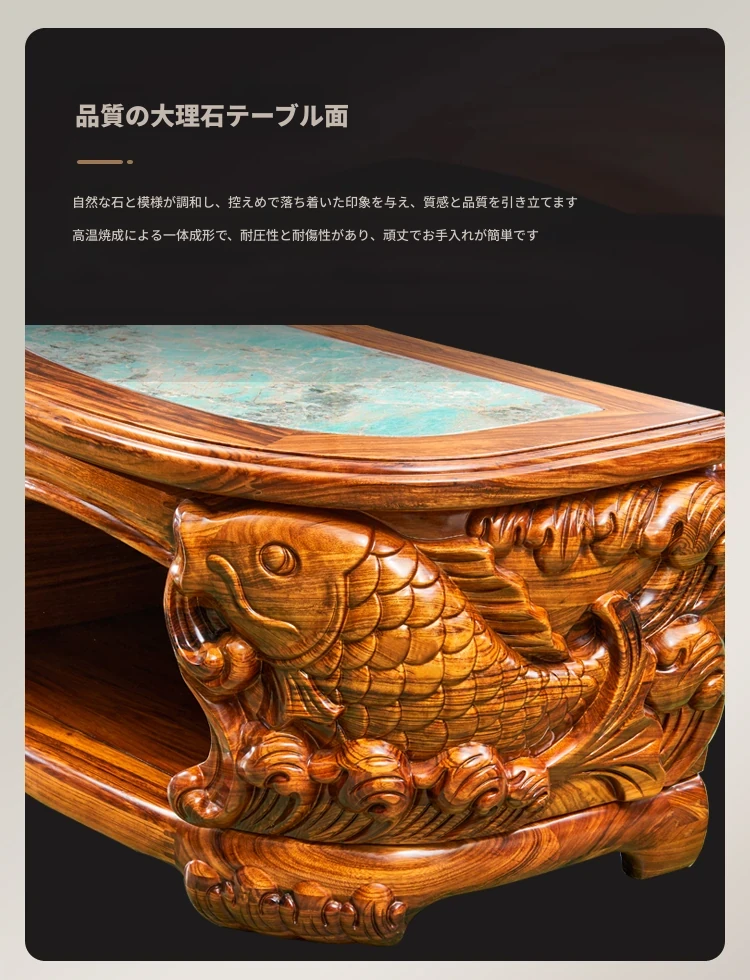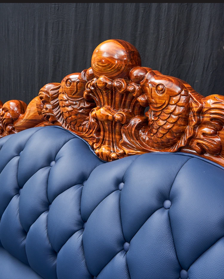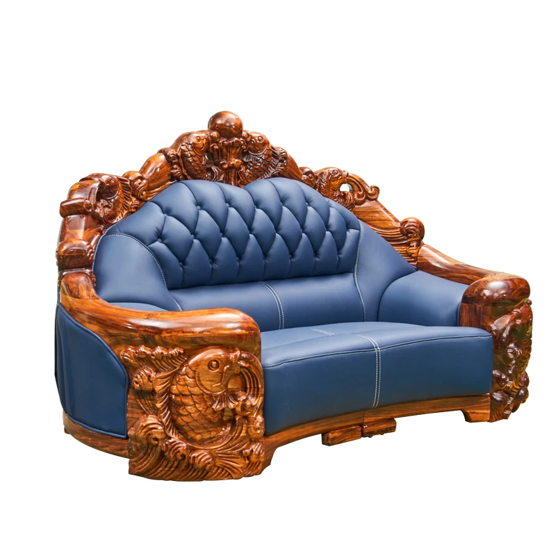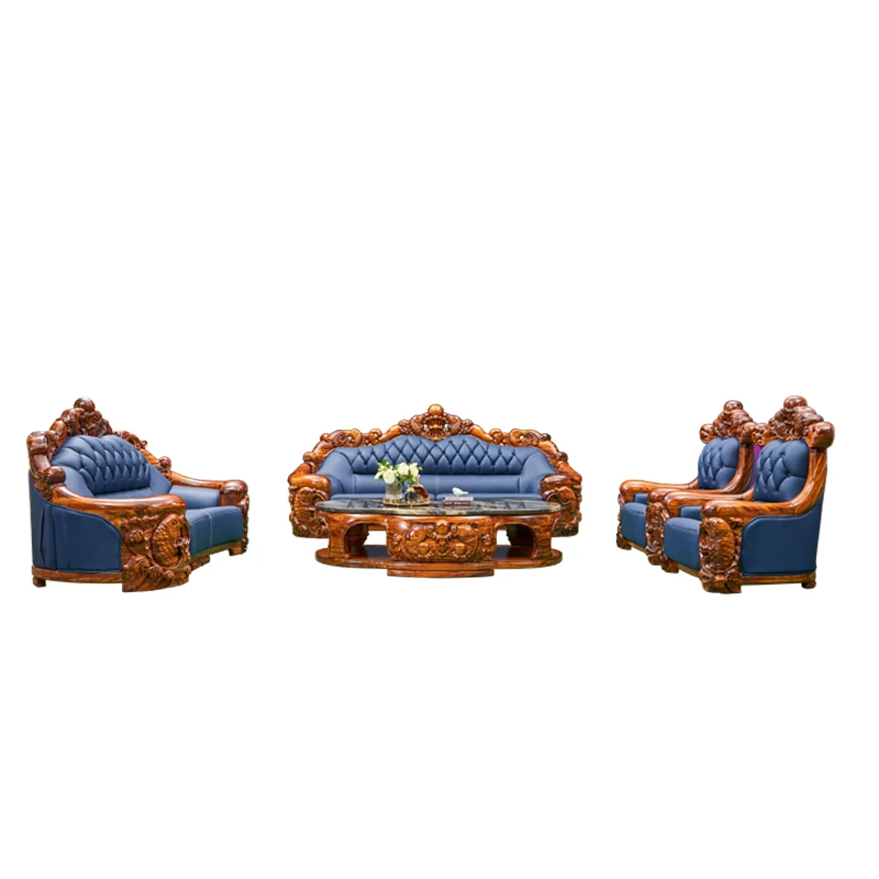 欧風ウッドブラックソファー 大型別荘向け 新中式デザイン 本革使用 四人掛けソファセット 高級感あふれる実木製で、スタイリッシュな空間を演出!