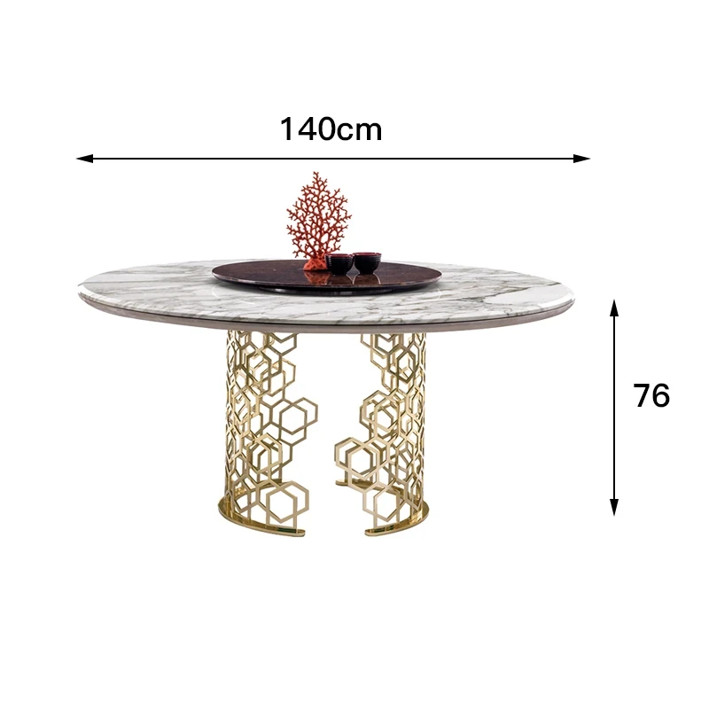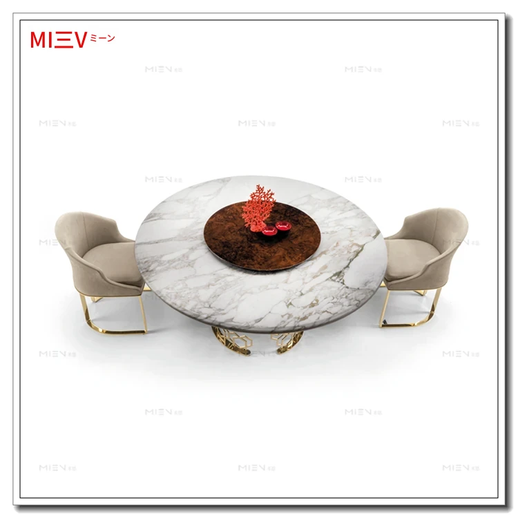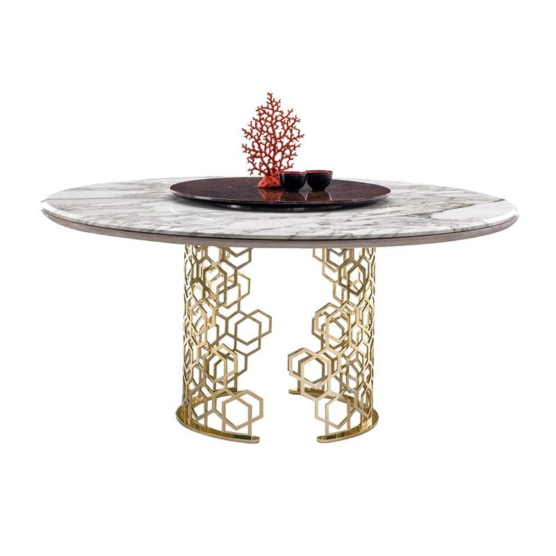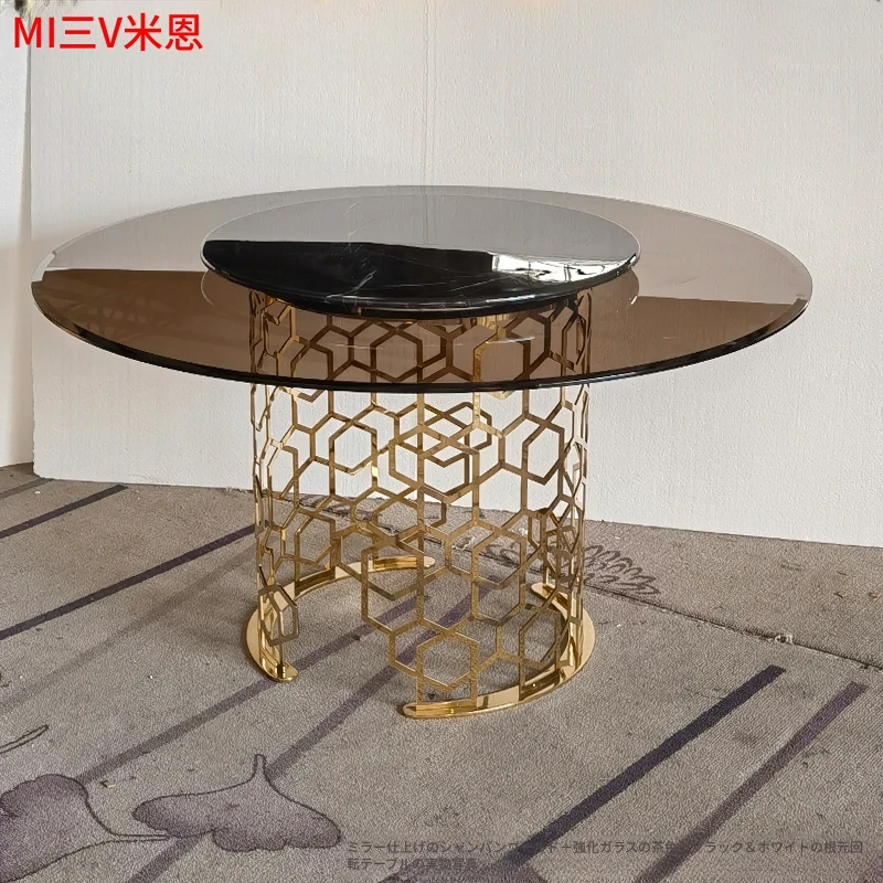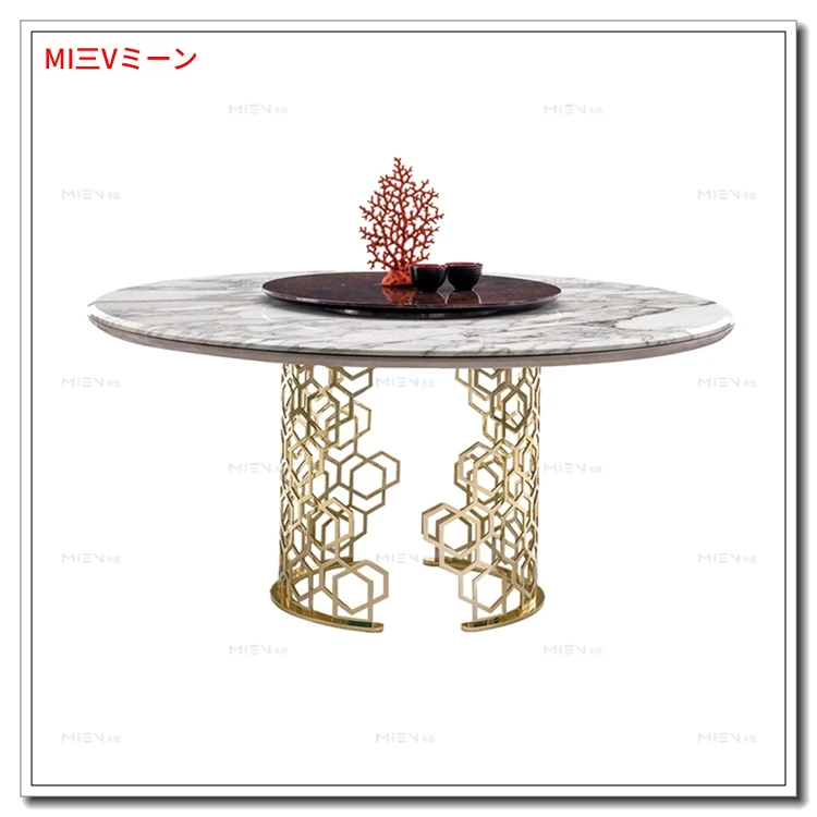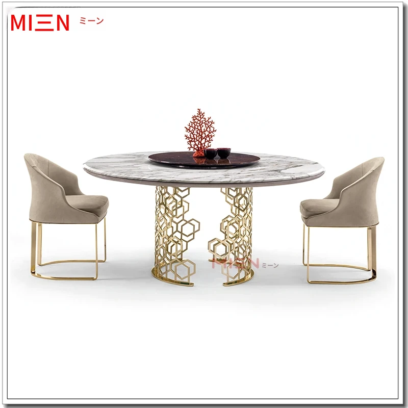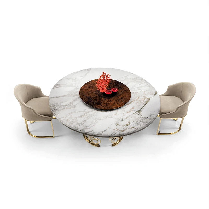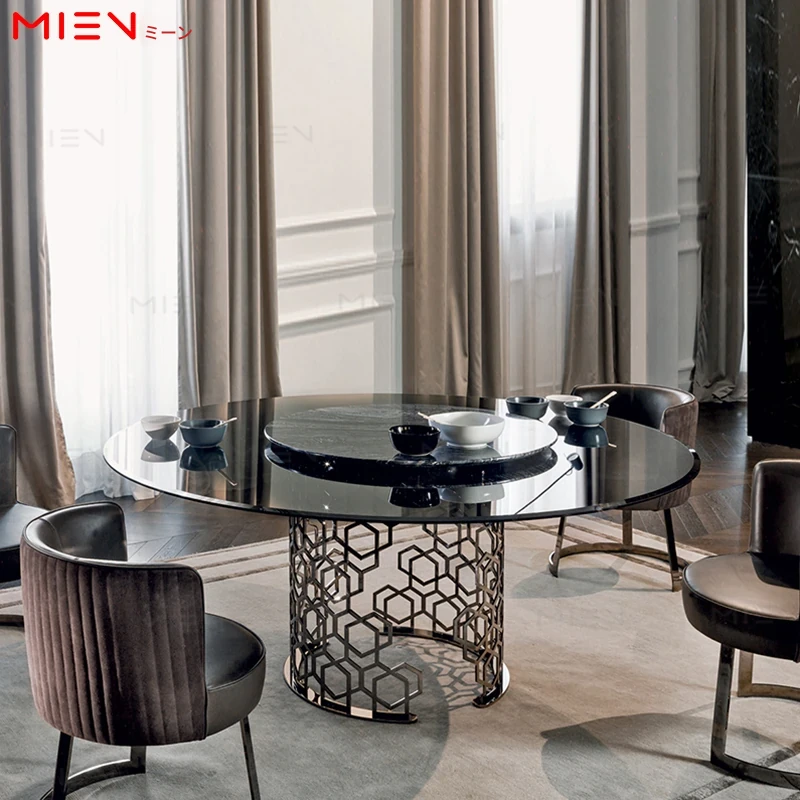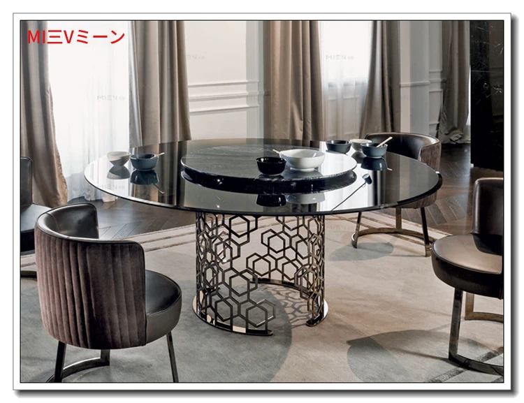 イタリアLONGHIのラグジュアリーなステンレススチール製レーザー加工円形ダイニングテーブル - 大理石天板&回転テーブル付き、洽談にも最適!