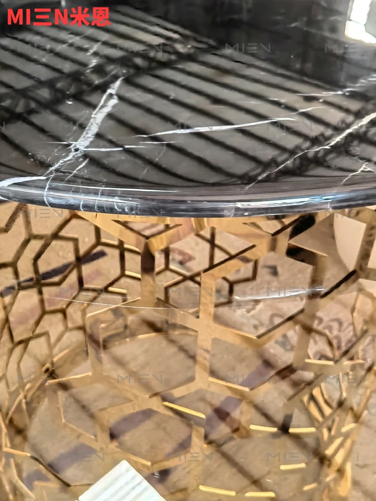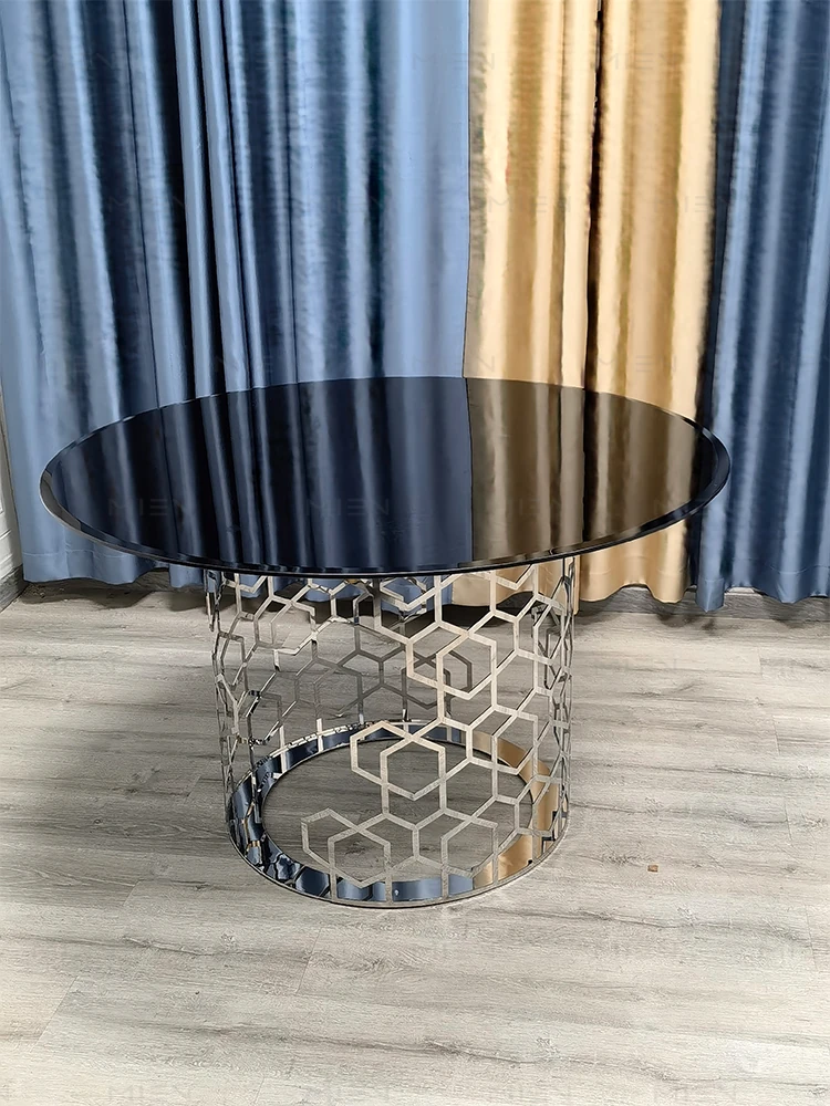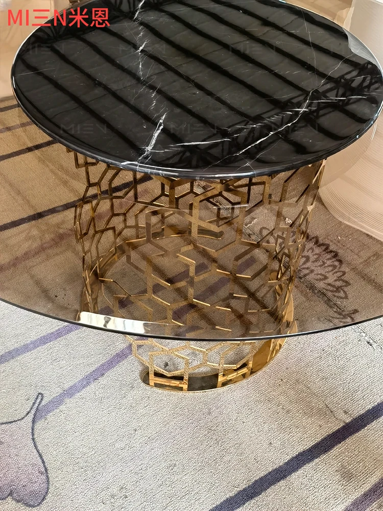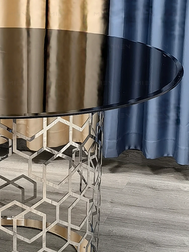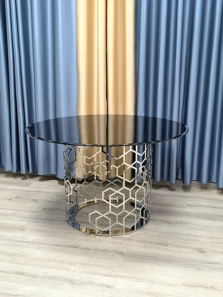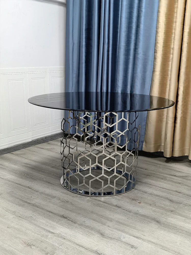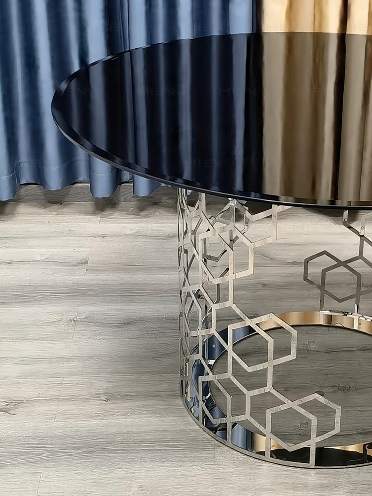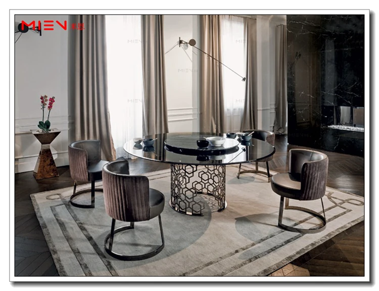 イタリアLONGHIのラグジュアリーなステンレススチール製レーザー加工円形ダイニングテーブル - 大理石天板&回転テーブル付き、洽談にも最適!