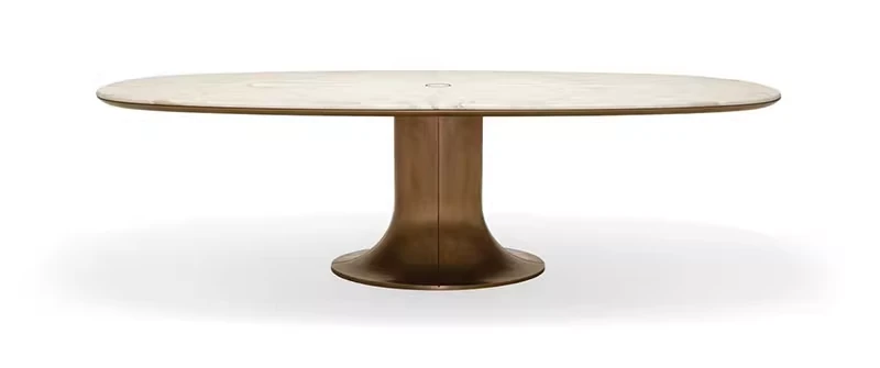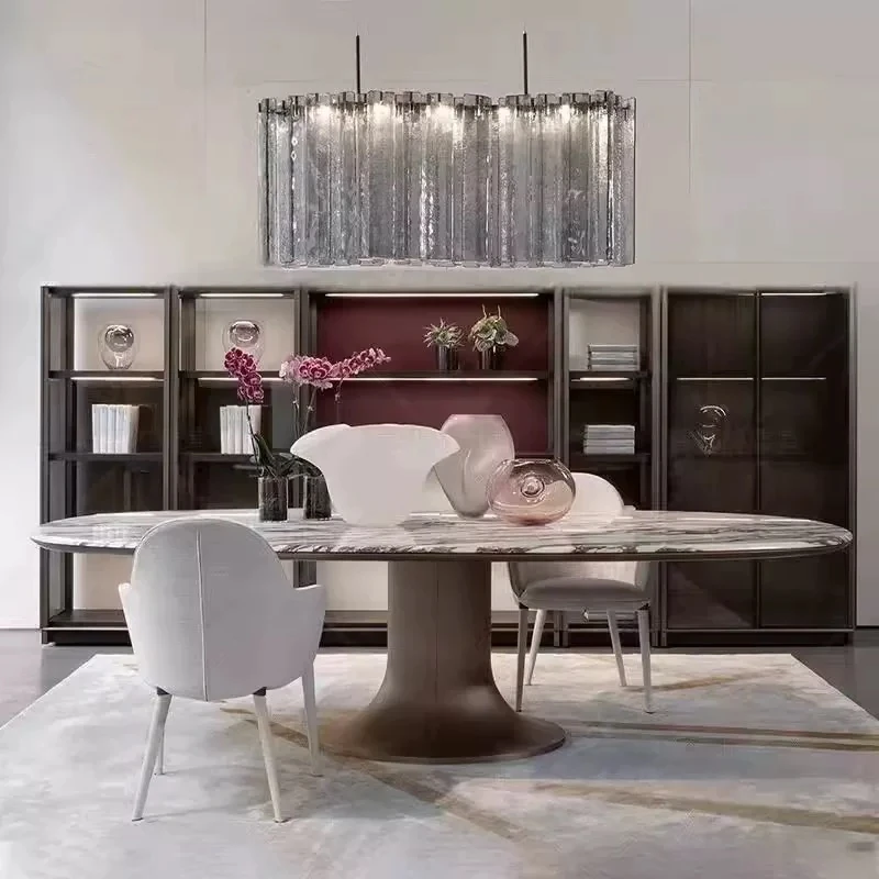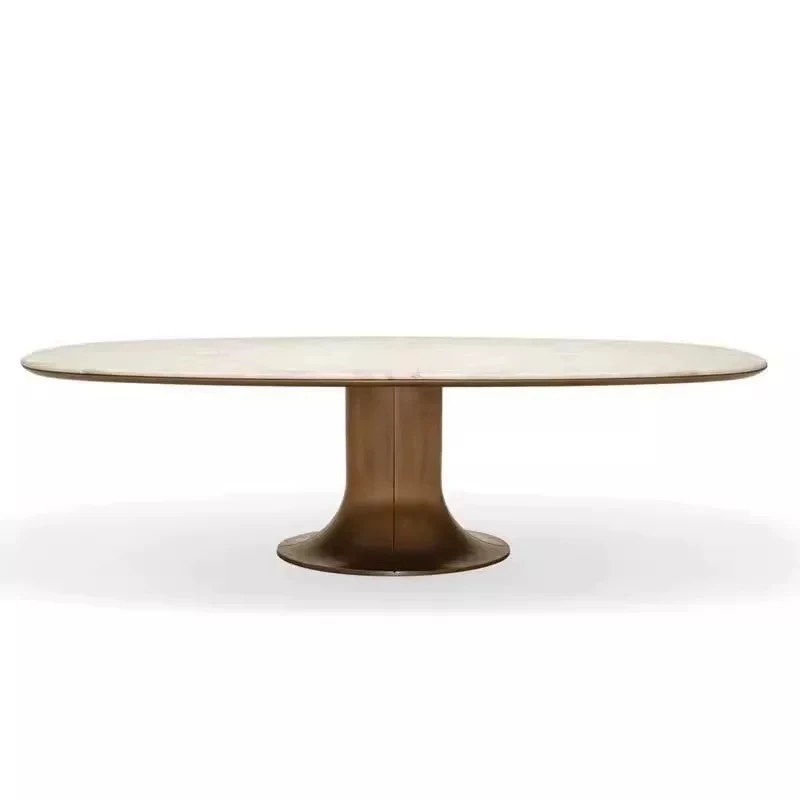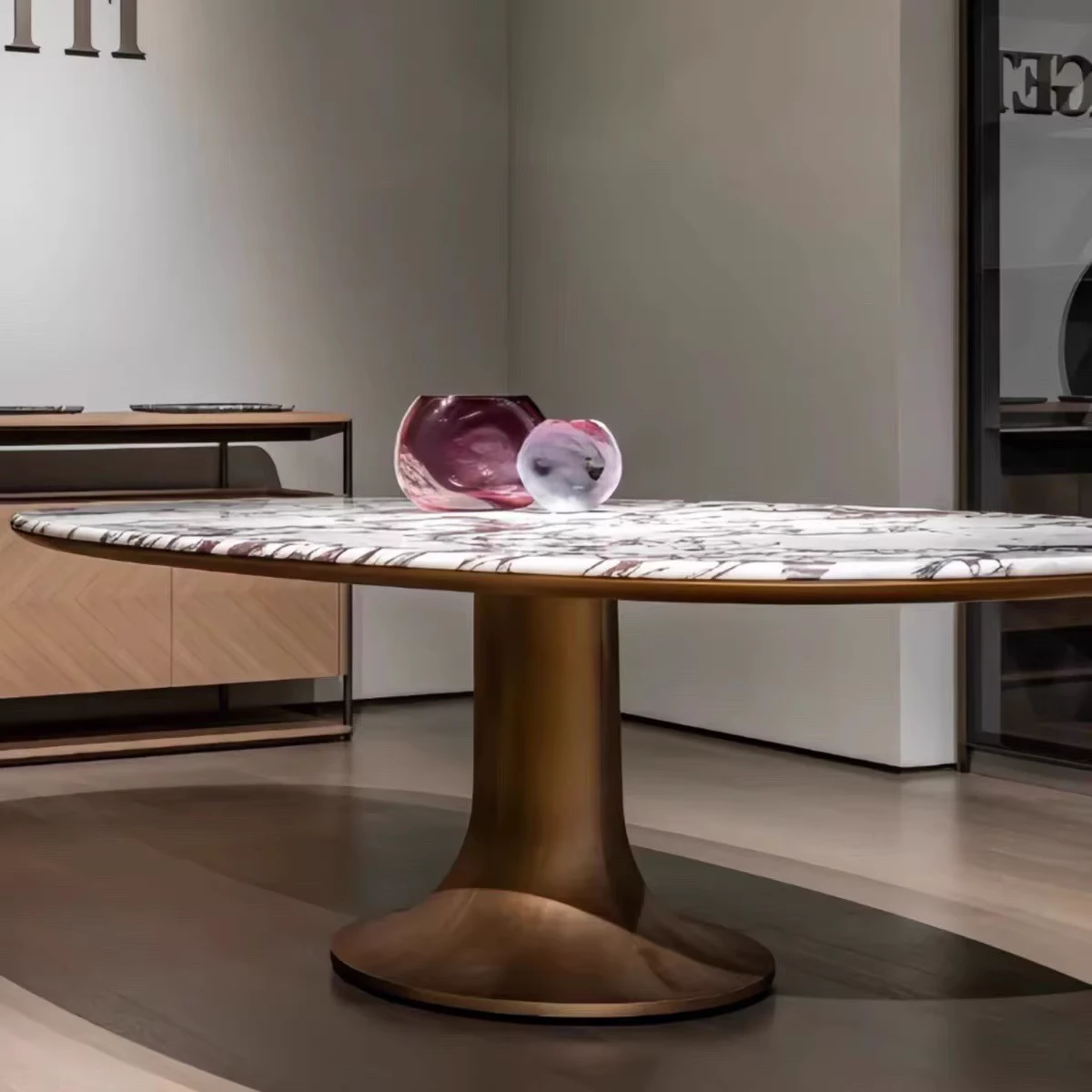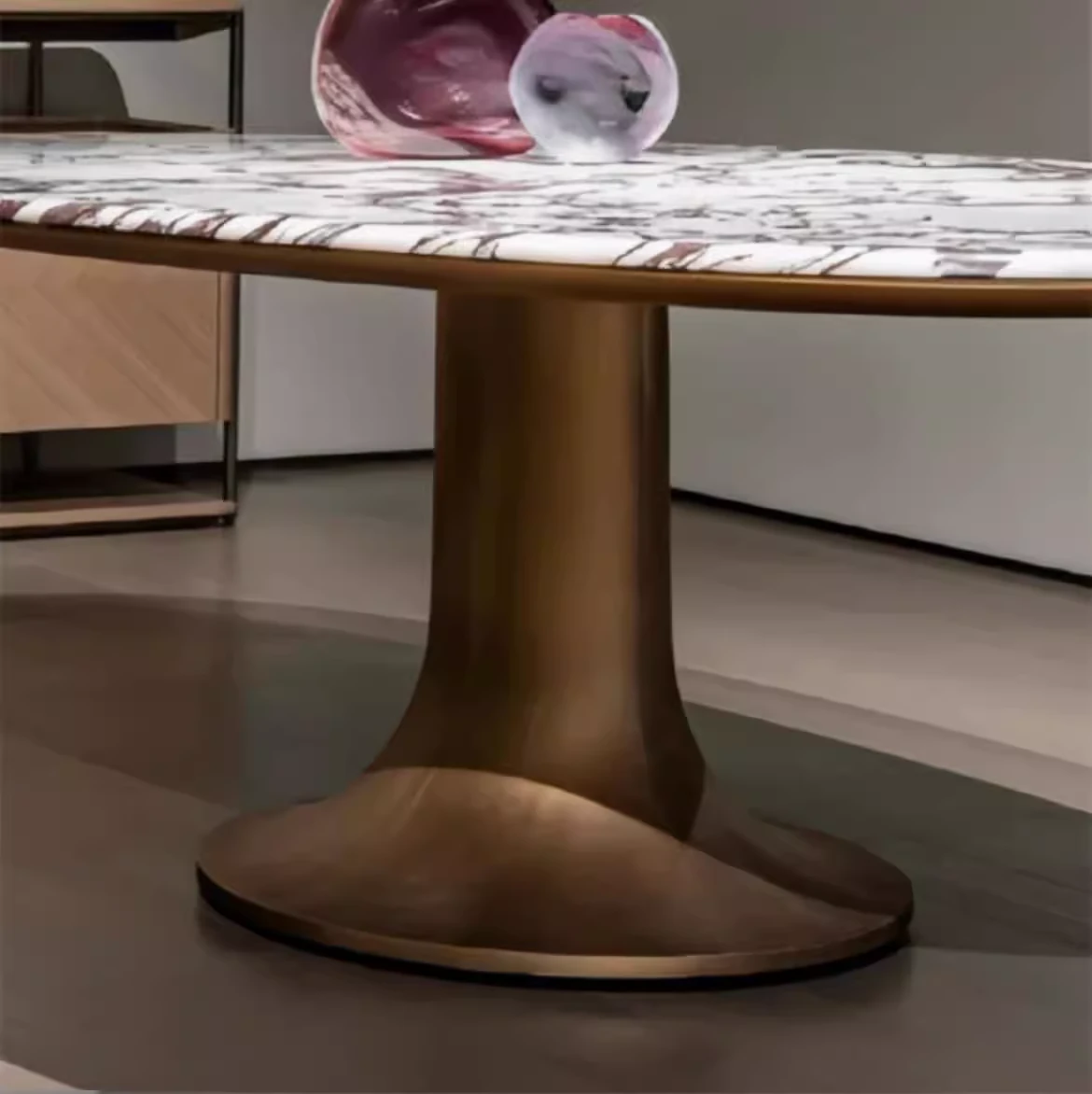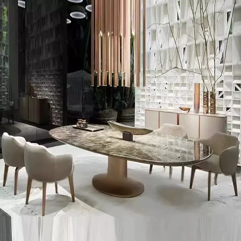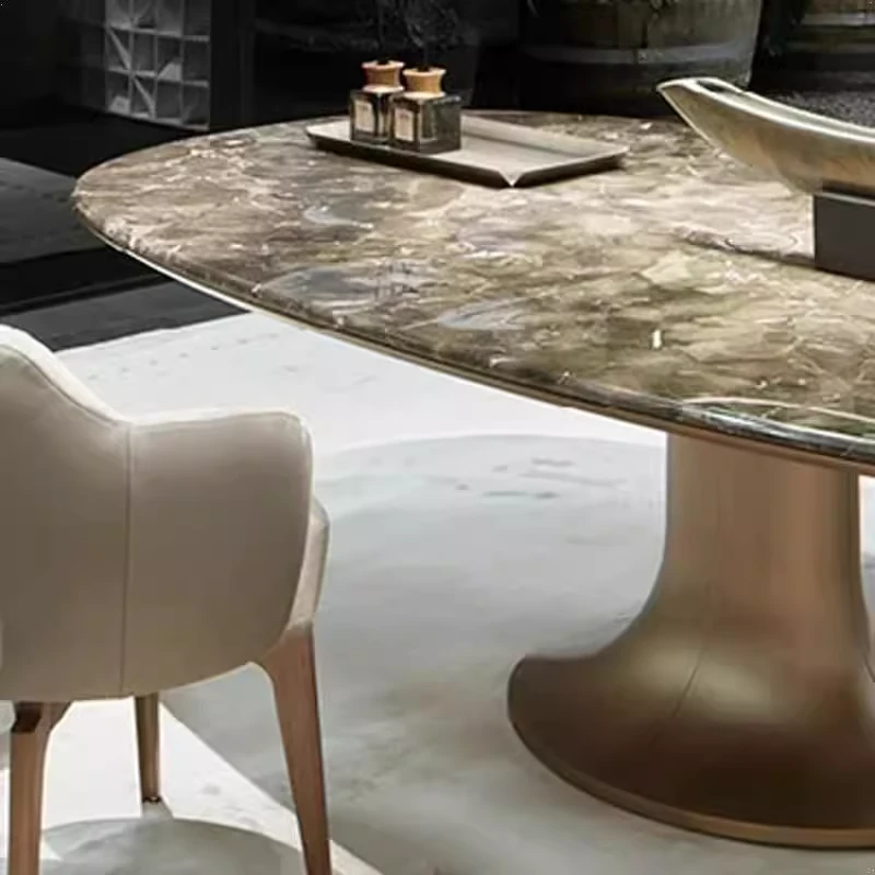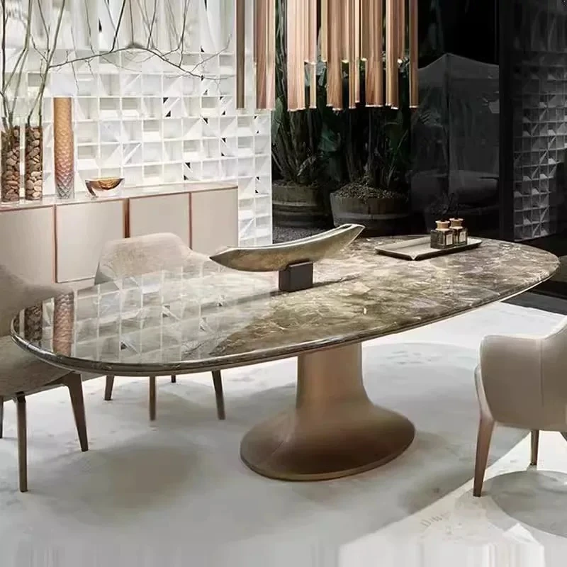 イタリア製高級大理石天板の金属ベースを使用したラグジュアリーなリビングダイニングテーブル、エレガントな楕円形デザインのデザイナーテーブルです。おしゃれな空間を演出し、特別なひとときを提供します!
