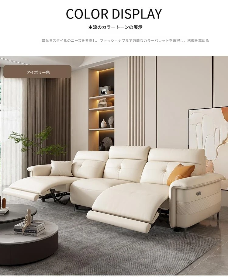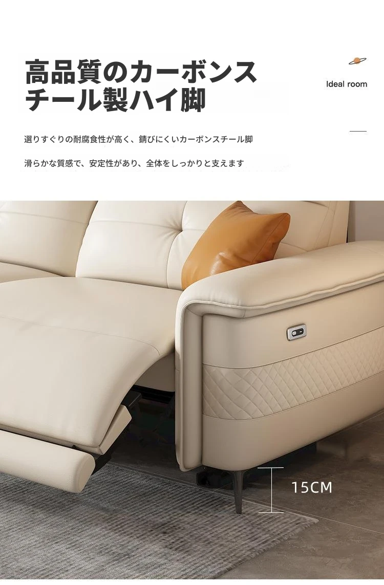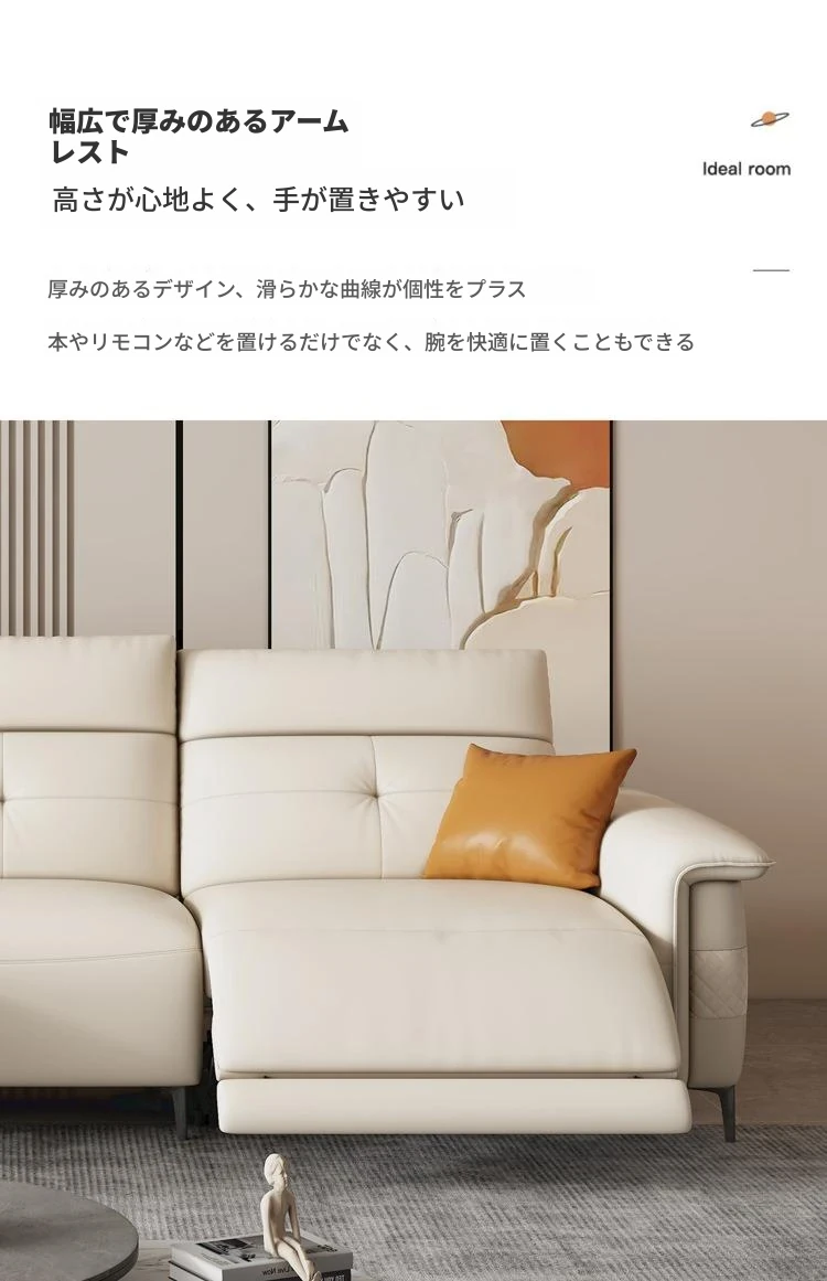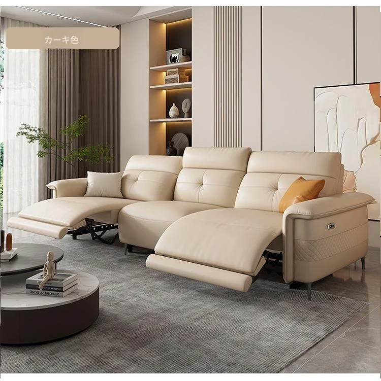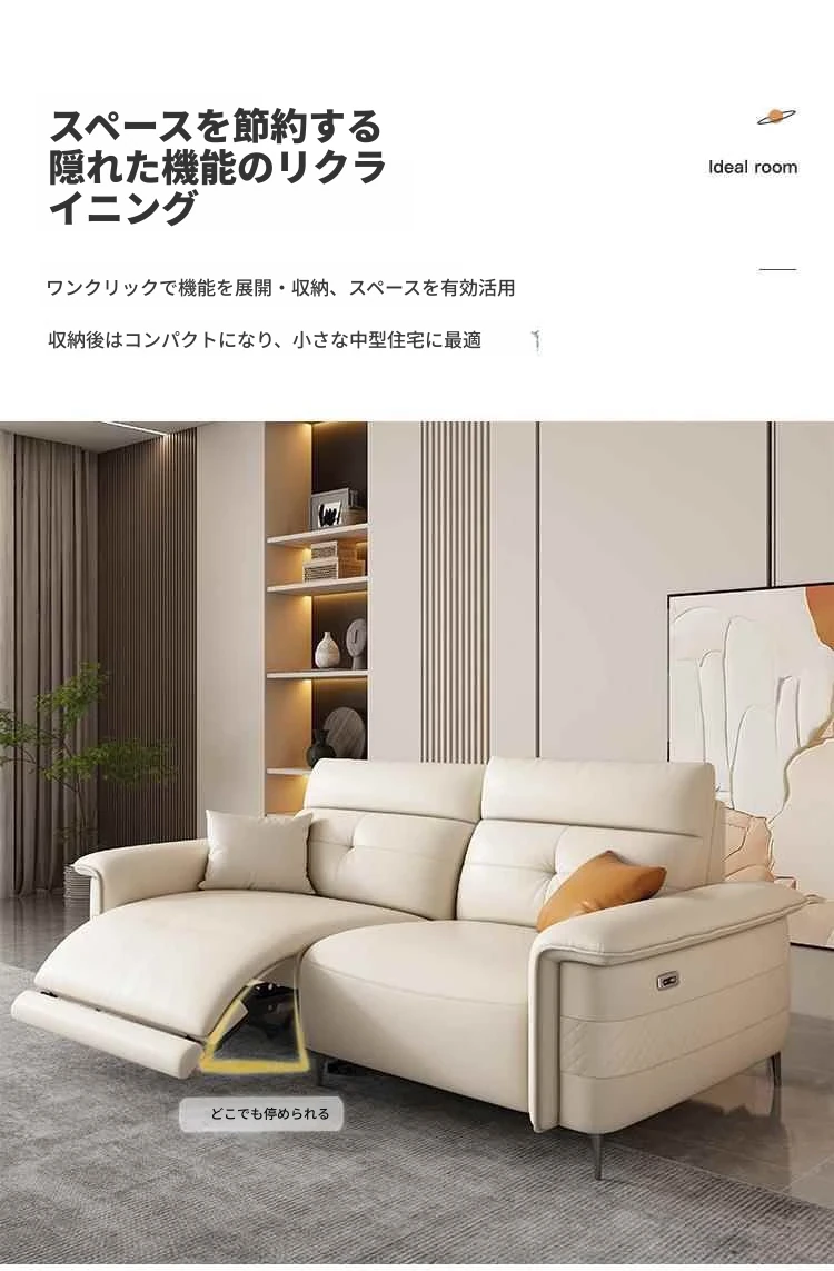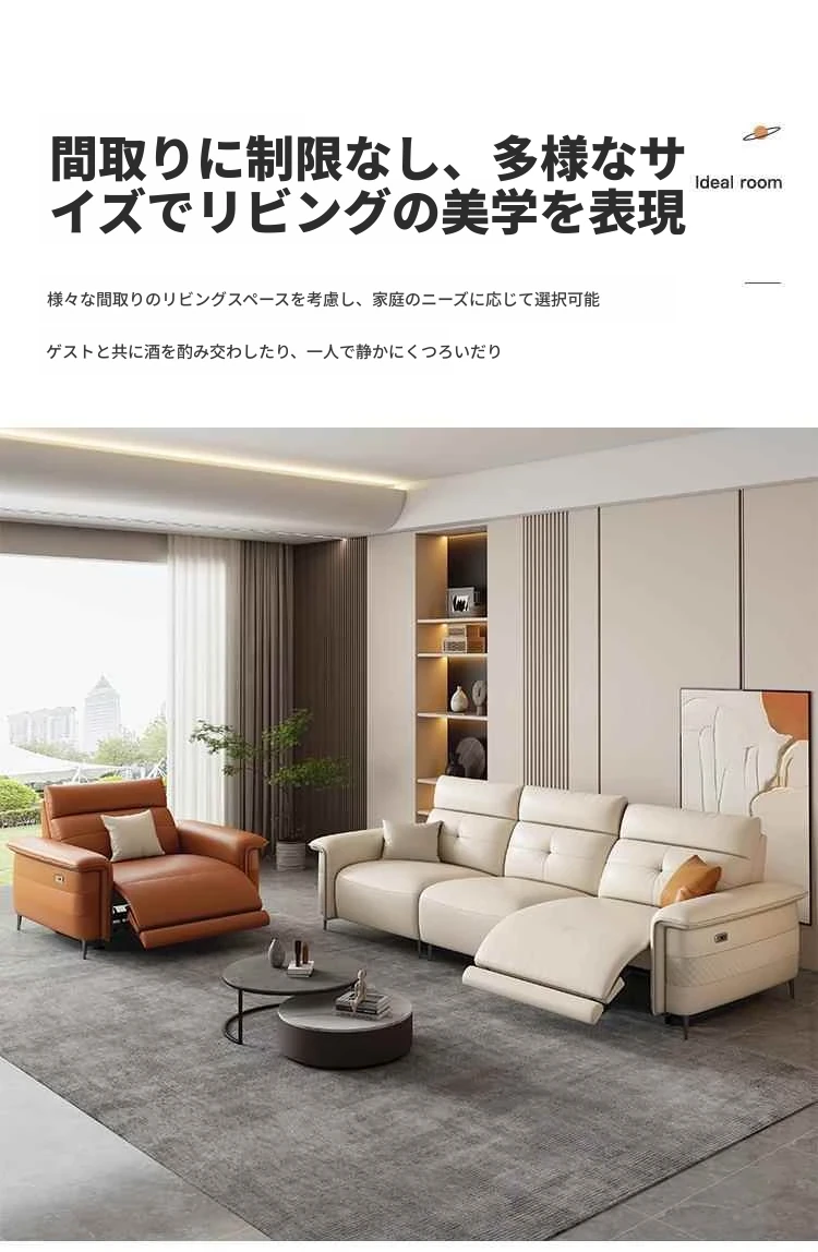 電動機能付き本革ソファ - リビングに最適なイタリアンミニマルデザイン!小型から中型のスペースにぴったり。3人掛け・4人掛け可能、調整可能でリクライニング機能付き。快適さとスタイルを両立した一品!