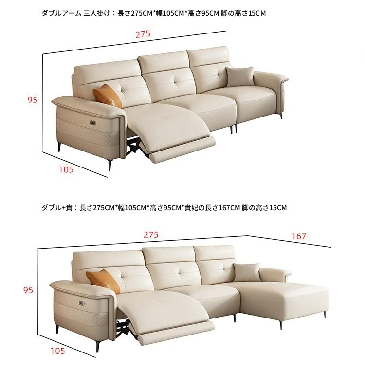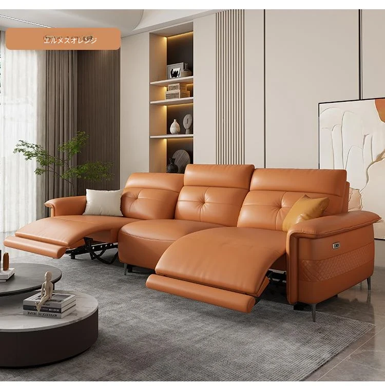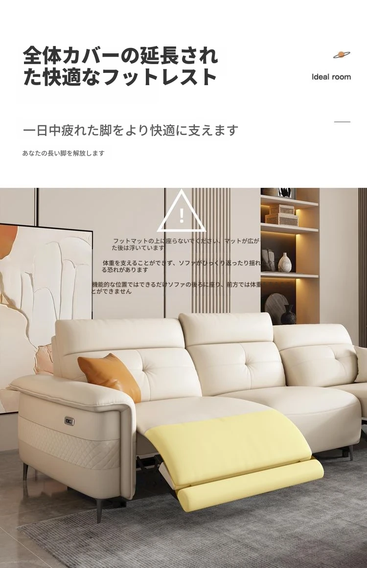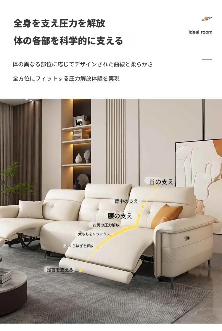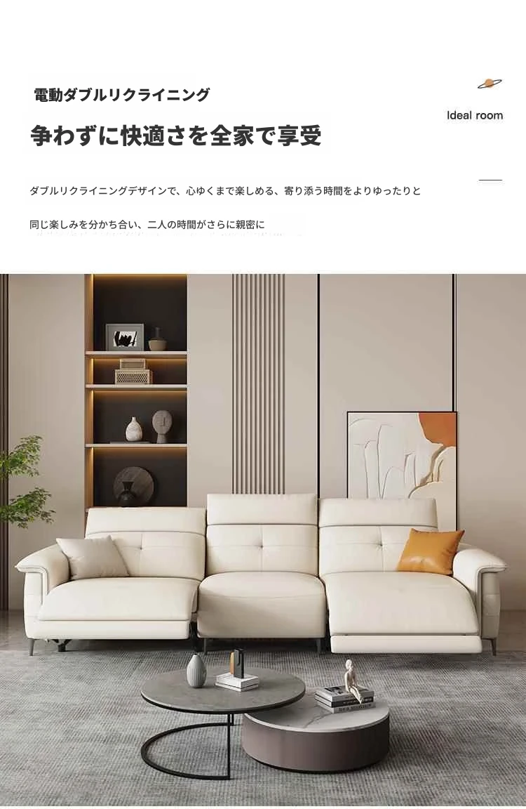 電動機能付き本革ソファ - リビングに最適なイタリアンミニマルデザイン!小型から中型のスペースにぴったり。3人掛け・4人掛け可能、調整可能でリクライニング機能付き。快適さとスタイルを両立した一品!