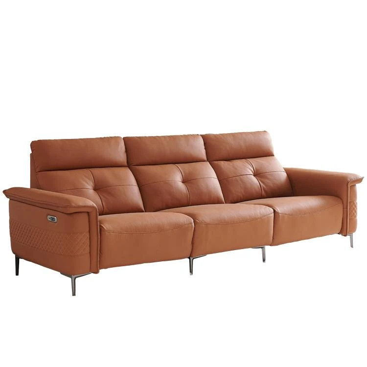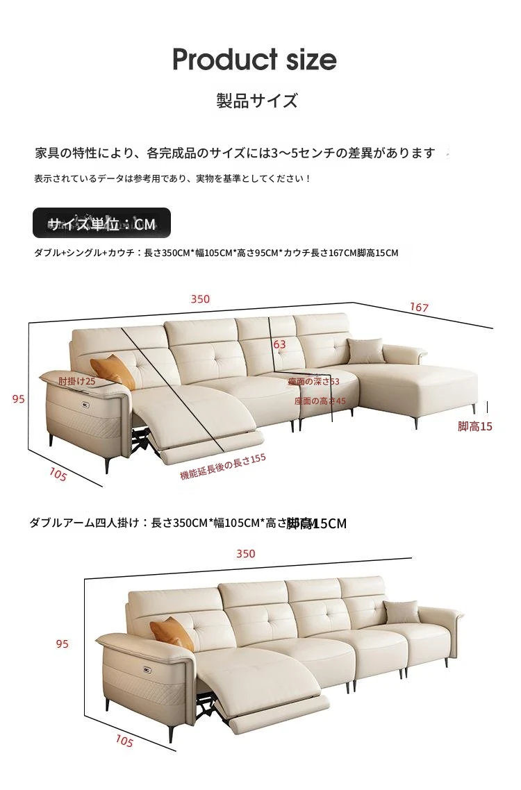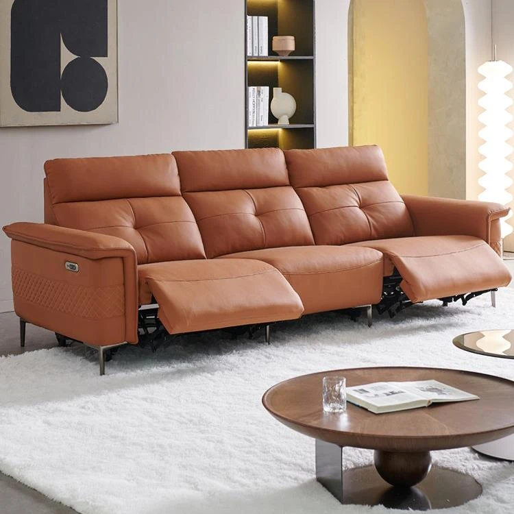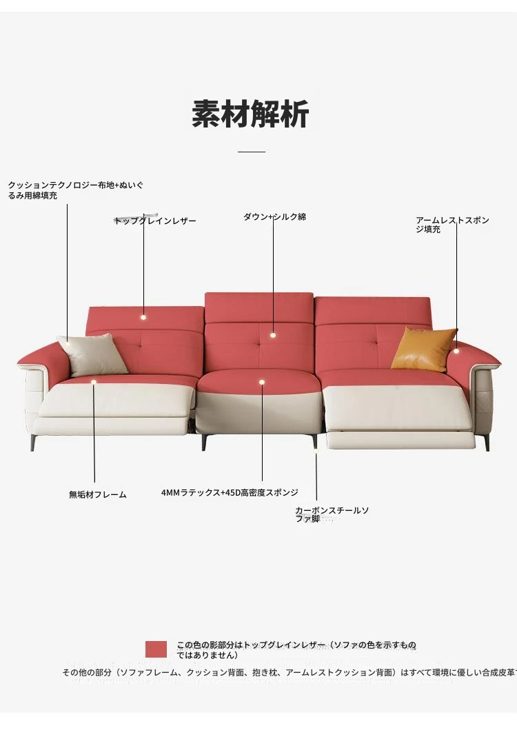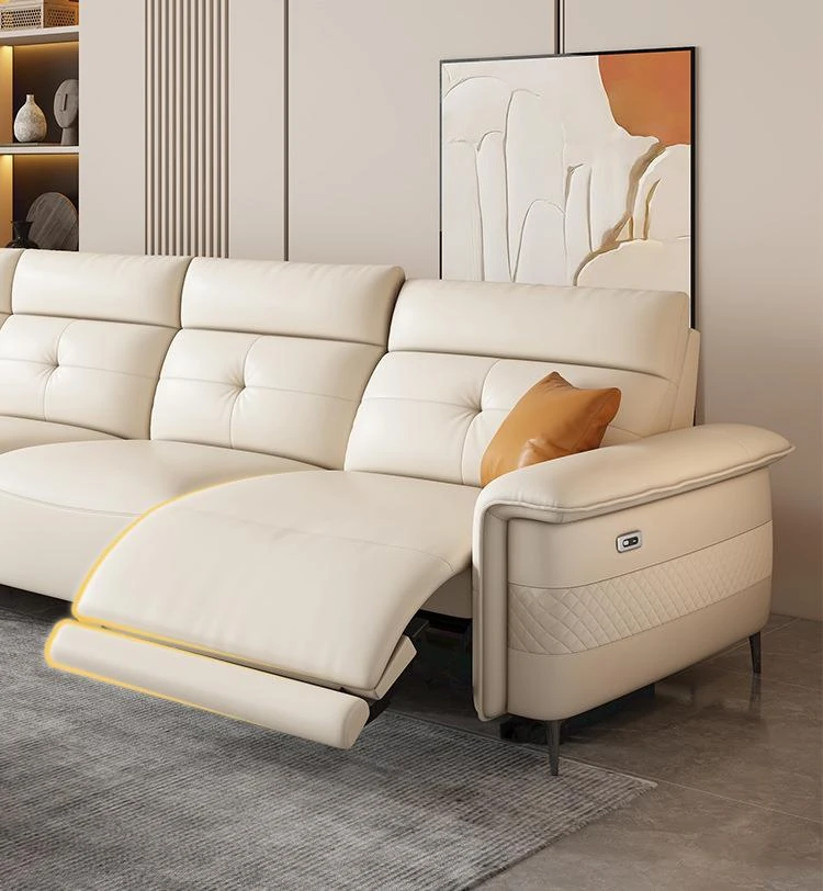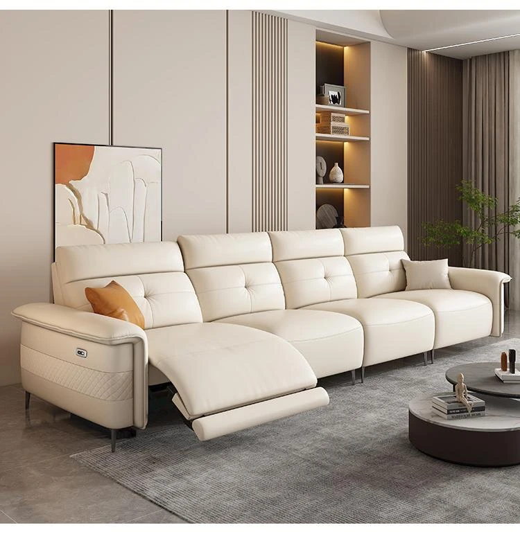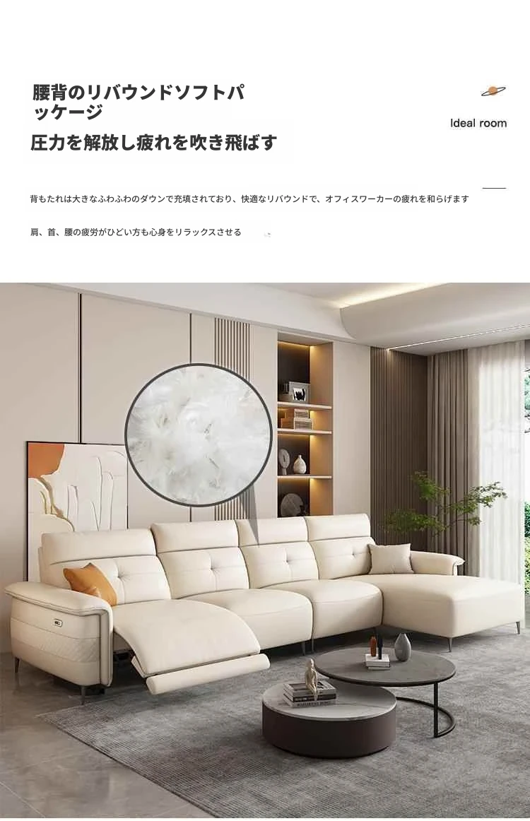 電動機能付き本革ソファ - リビングに最適なイタリアンミニマルデザイン!小型から中型のスペースにぴったり。3人掛け・4人掛け可能、調整可能でリクライニング機能付き。快適さとスタイルを両立した一品!
