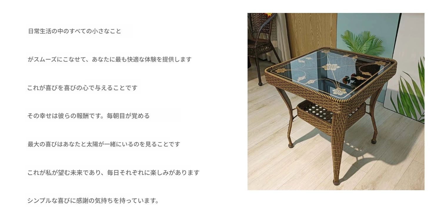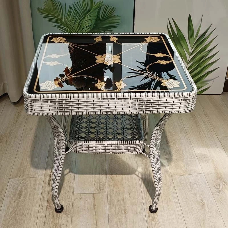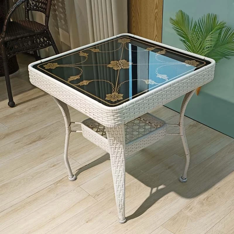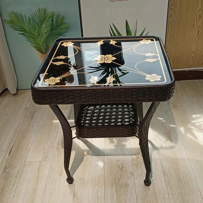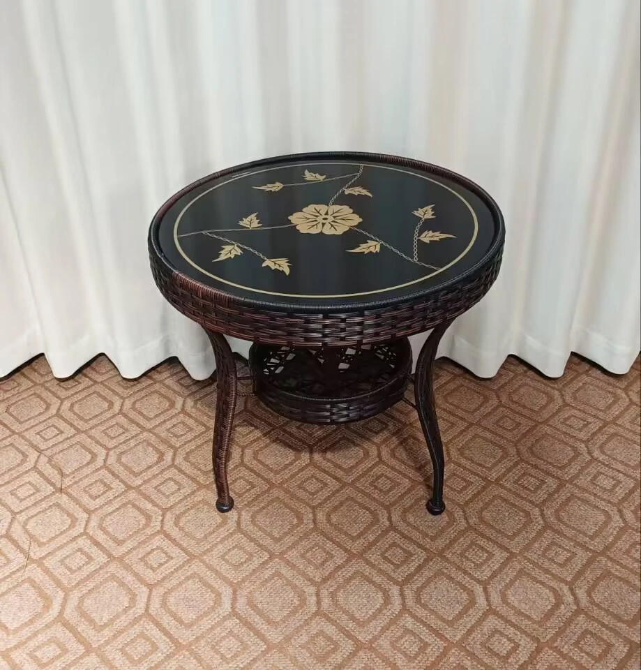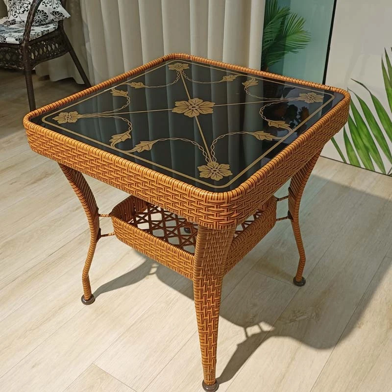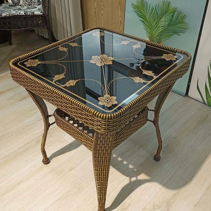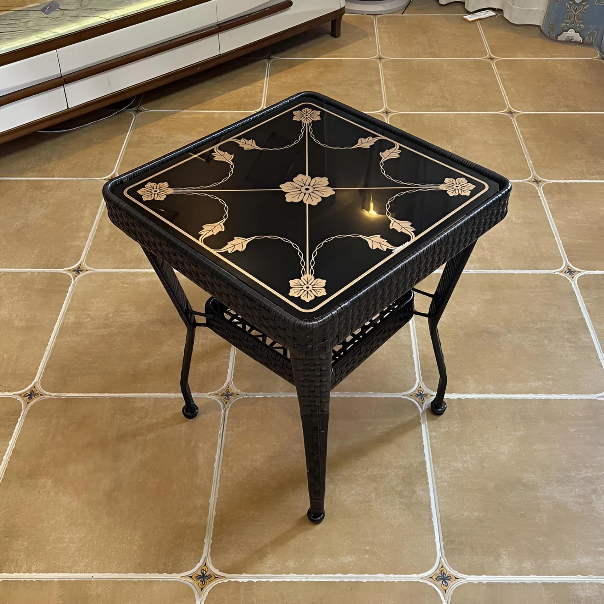 J^藤編みミニテーブル - おしゃれなバルコニー用小茶卓、コンパクトで収納力抜群!鋼化ガラスの優雅なデザインで、リラックスタイムにぴったりな一品。寝室やリビングに彩りを添えます。