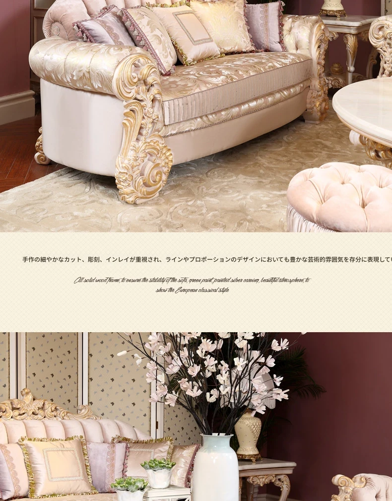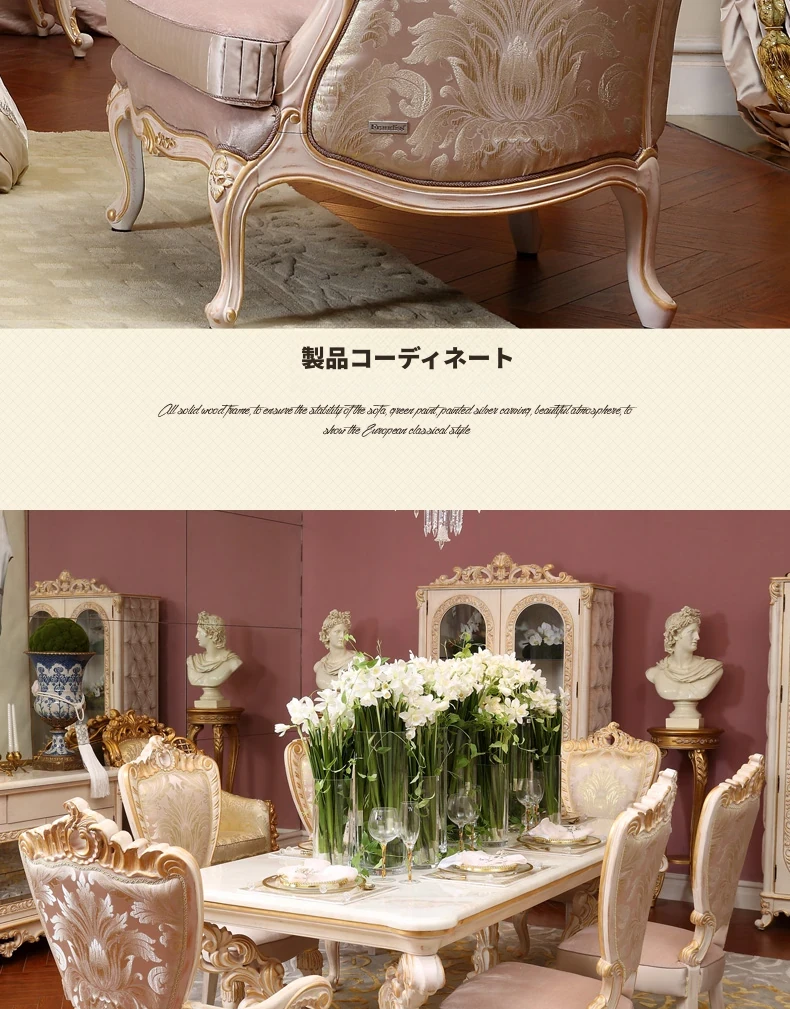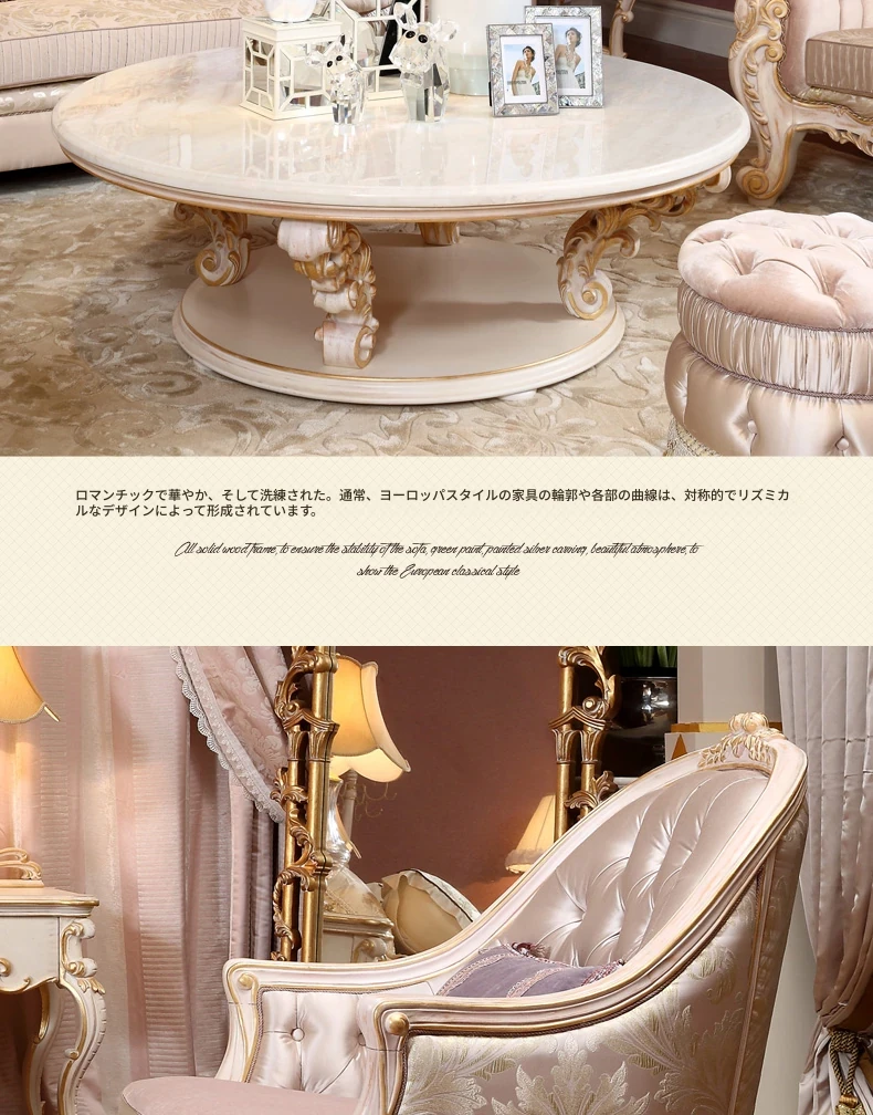 豪華なフランス風ヴィンテージソファー - 実木と高品質布地を使用したエレガントな宮廷スタイル。高級別荘にぴったりなリビングルーム向けの茶色いコーヒーテーブルを含む、上質なインテリア家具で、贅沢な空間を演出します。